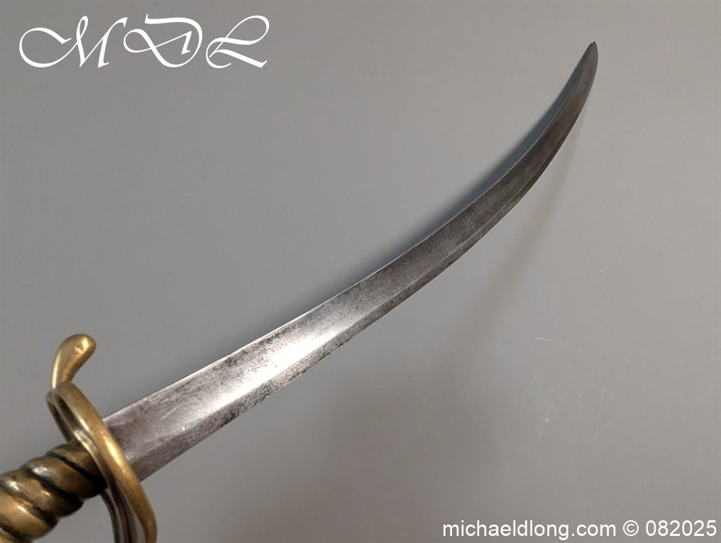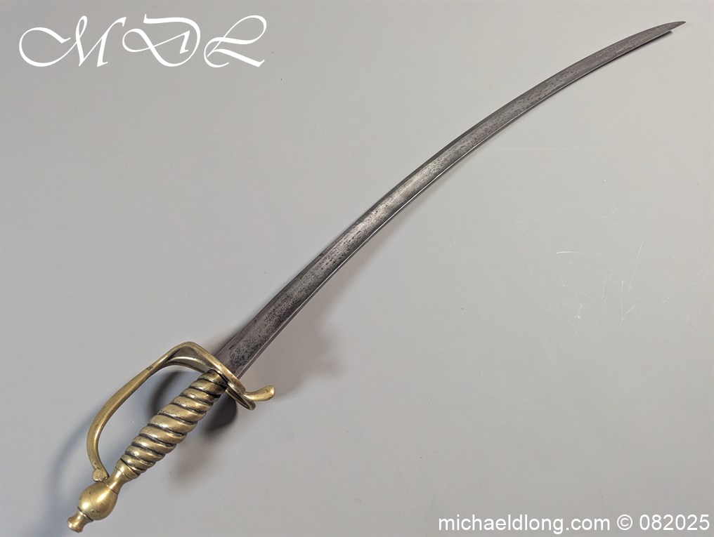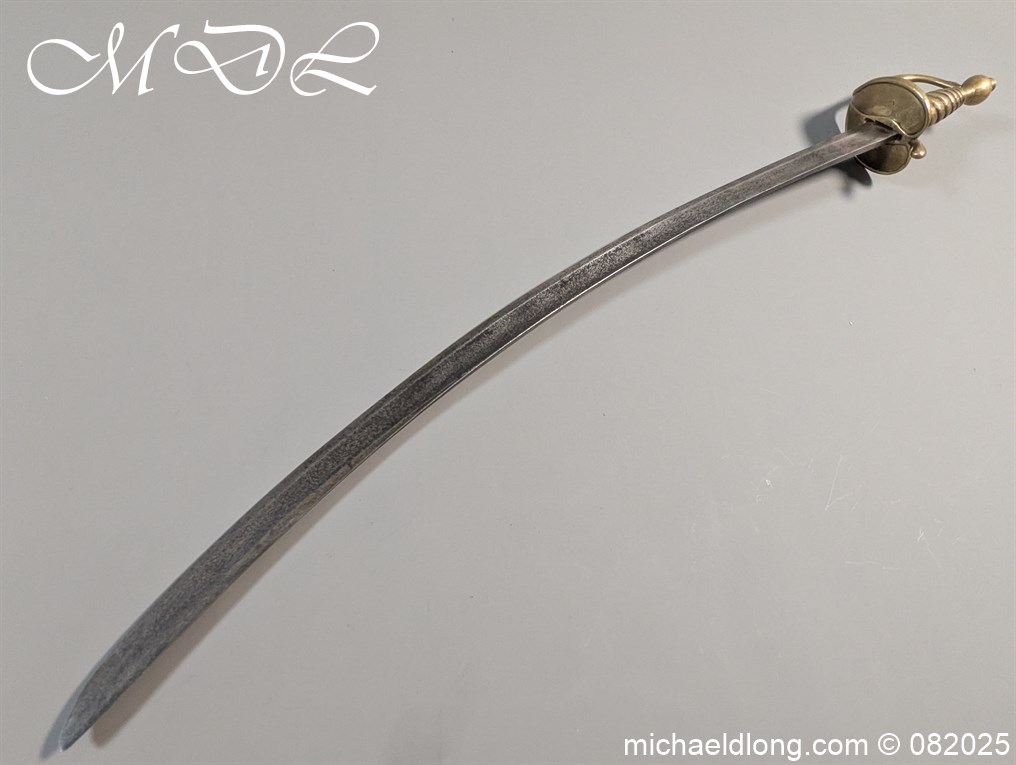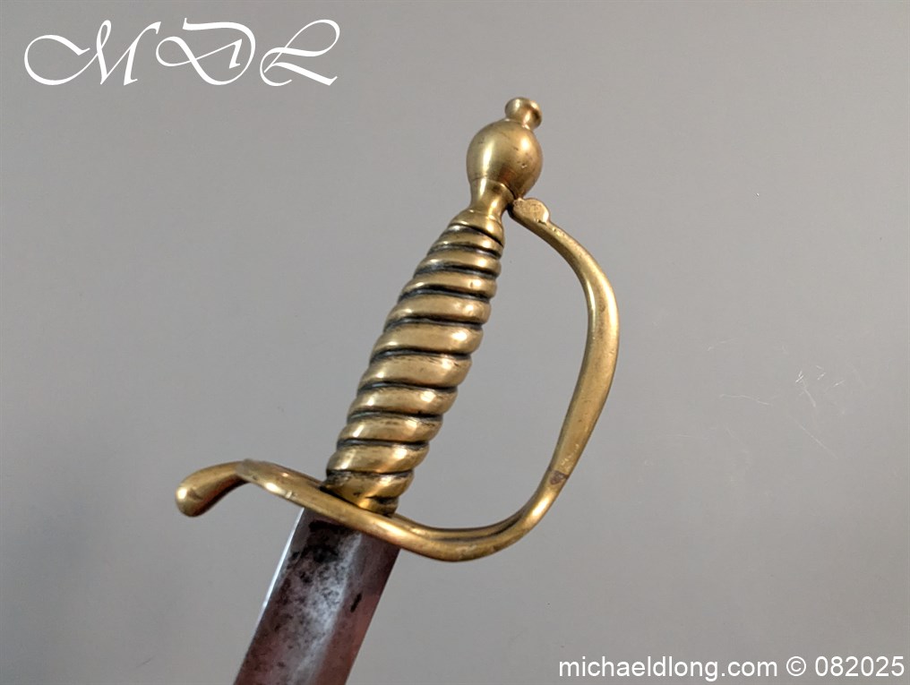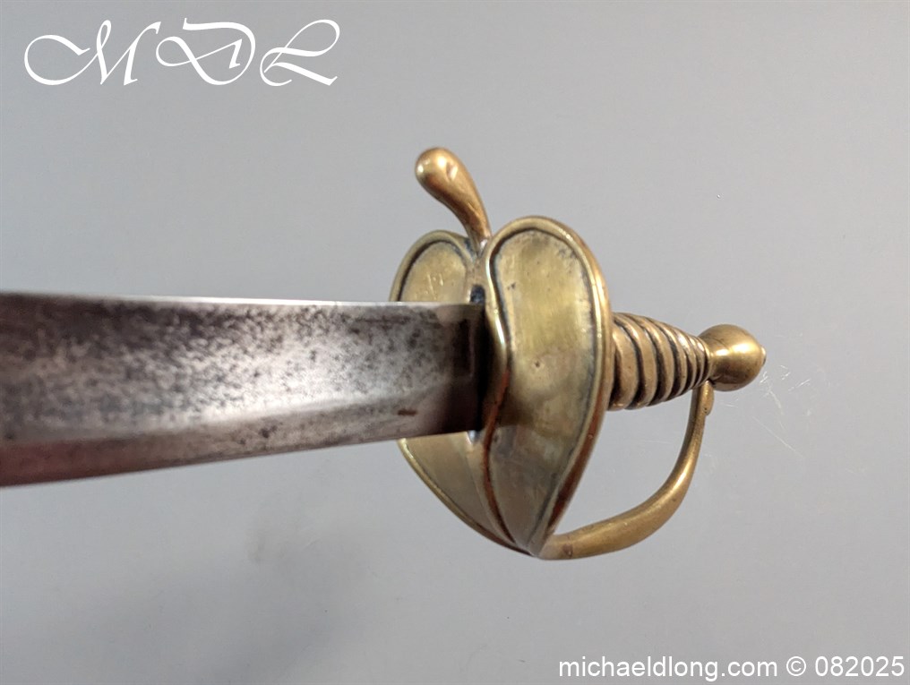 British Militia Hanger c 1760 slightly curved blade with fuller and flat back which has a faint small stamp. The hilt is brass with heart shape guard and integral knuckle guard and ovoid pommel and raised tang button. The grip cast ribbed brass overall length 34 inch the blade 28 inch