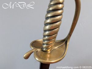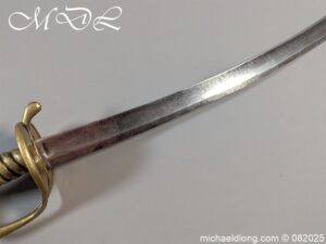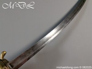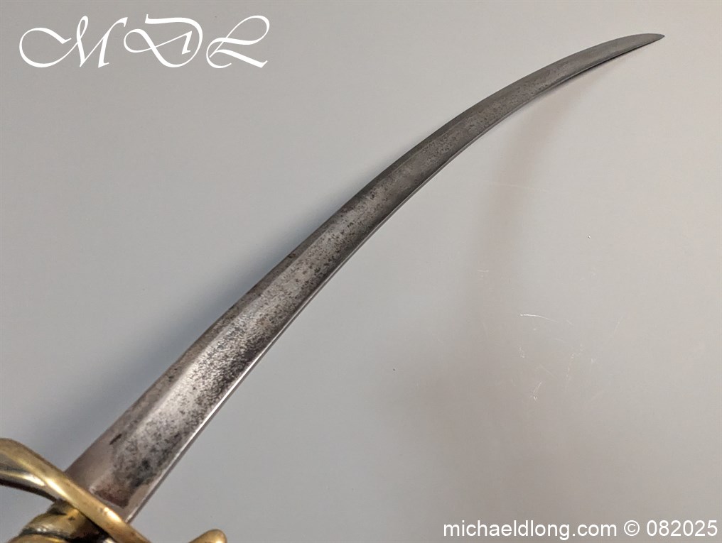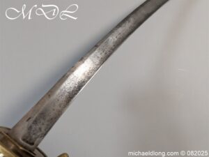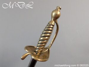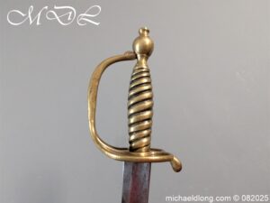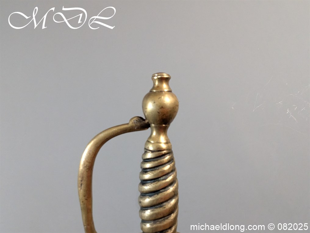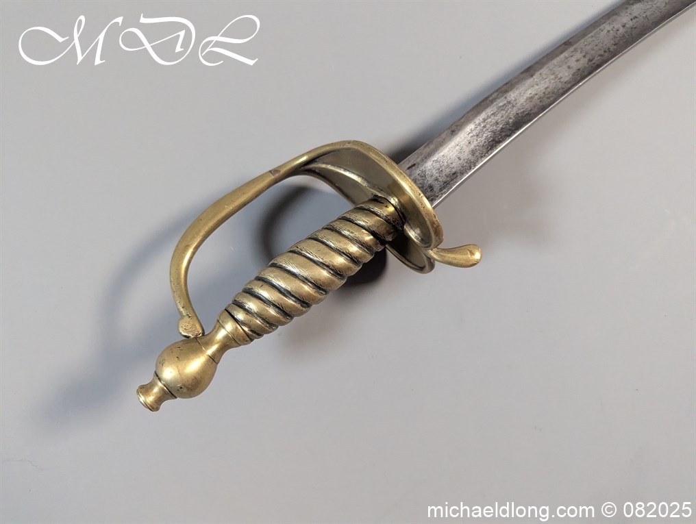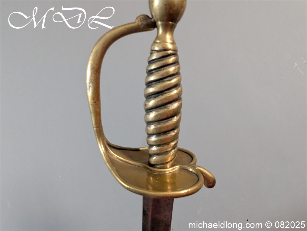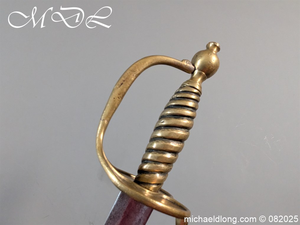 British Militia Hanger c 1760 slightly curved blade with fuller and flat back which has a faint small stamp. The hilt is brass with heart shape guard and integral knuckle guard and ovoid pommel and raised tang button. The grip cast ribbed brass overall length 34 inch the blade 28 inch