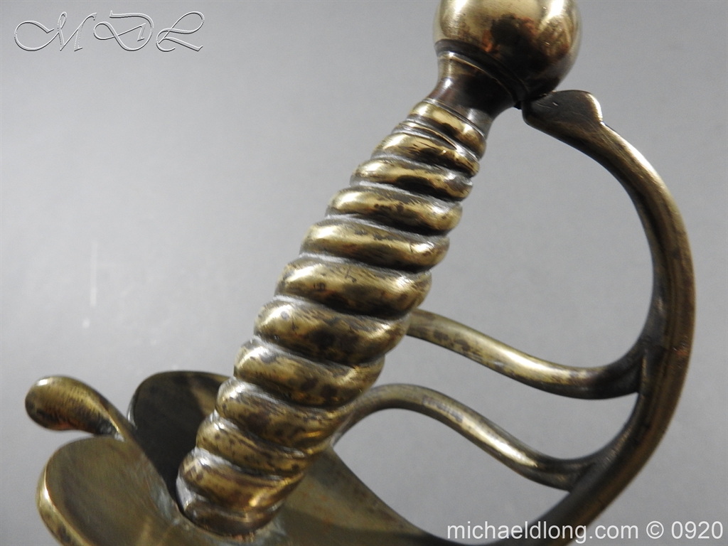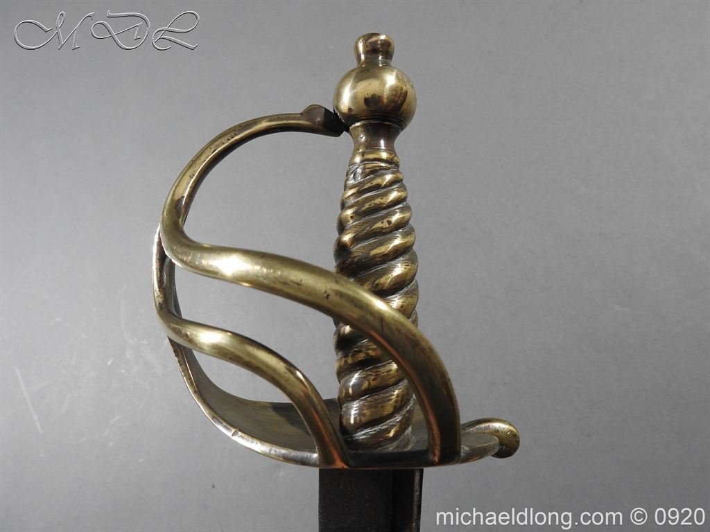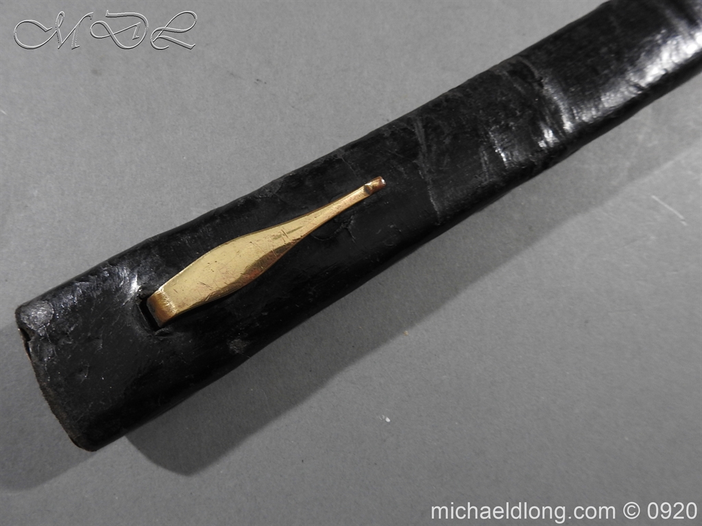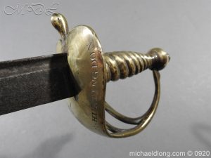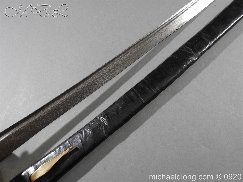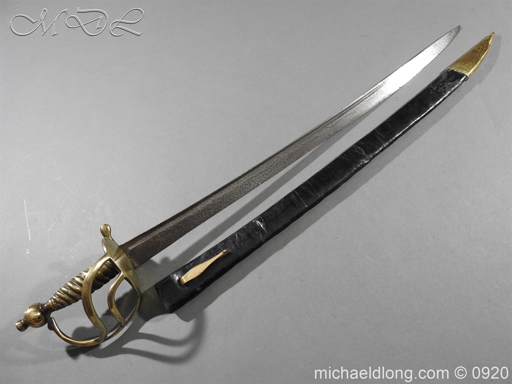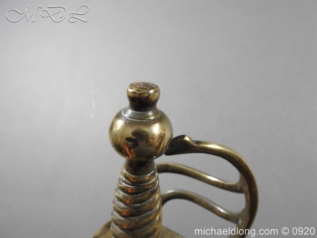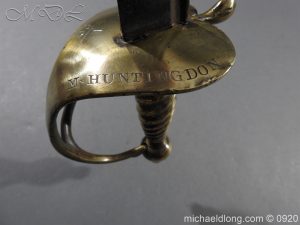 British Model 1842 Brass Hilted Hanger marked for the Militia of M Huntingdon numbered 1 / 29 cast brass hilt of regulation form mounted to a slightly curved blade no visible markings but the remains of a possible inspection stamp near the hilt complete with brass mounted leather scabbard overall length 79cm the blade 62cm