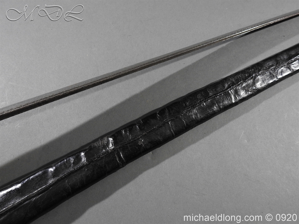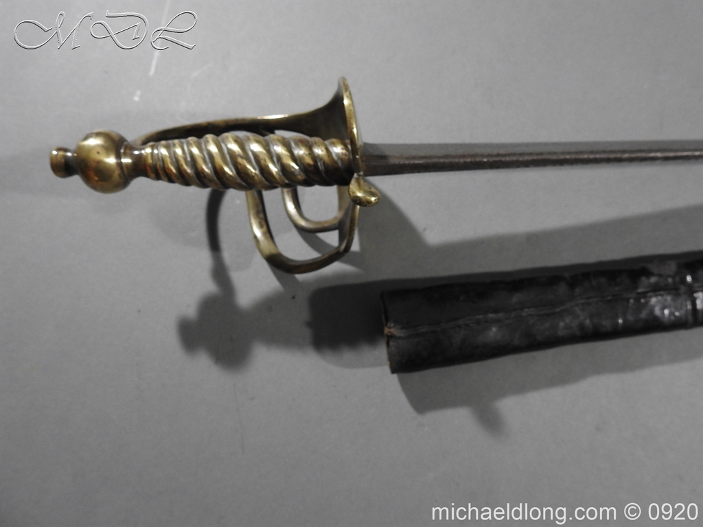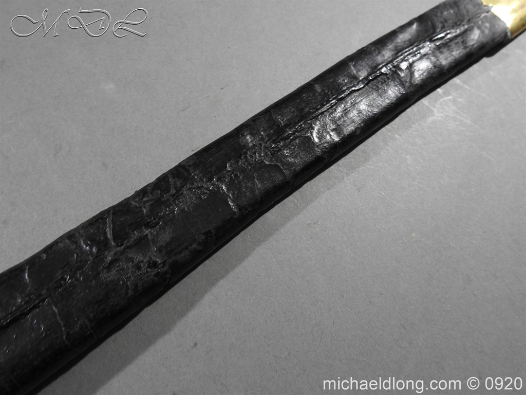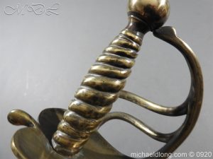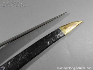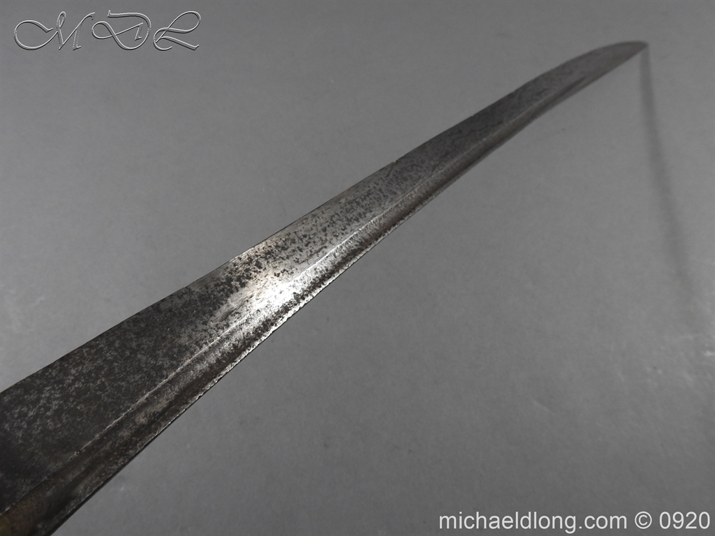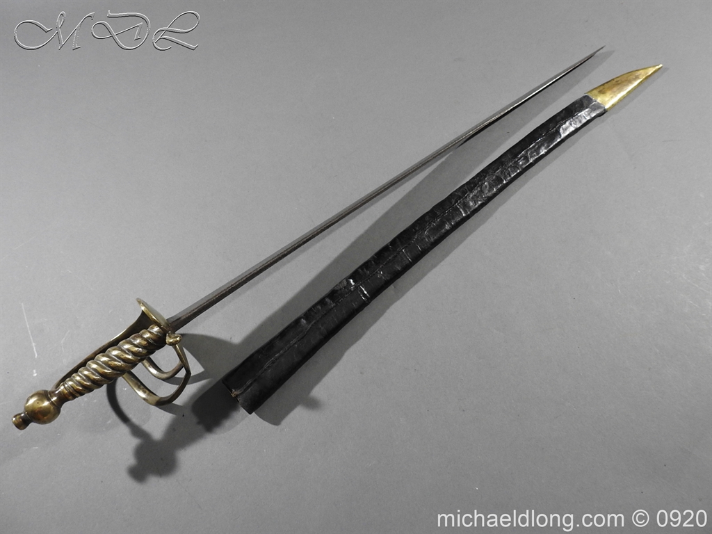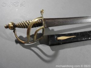 British Model 1842 Brass Hilted Hanger marked for the Militia of M Huntingdon numbered 1 / 29 cast brass hilt of regulation form mounted to a slightly curved blade no visible markings but the remains of a possible inspection stamp near the hilt complete with brass mounted leather scabbard overall length 79cm the blade 62cm