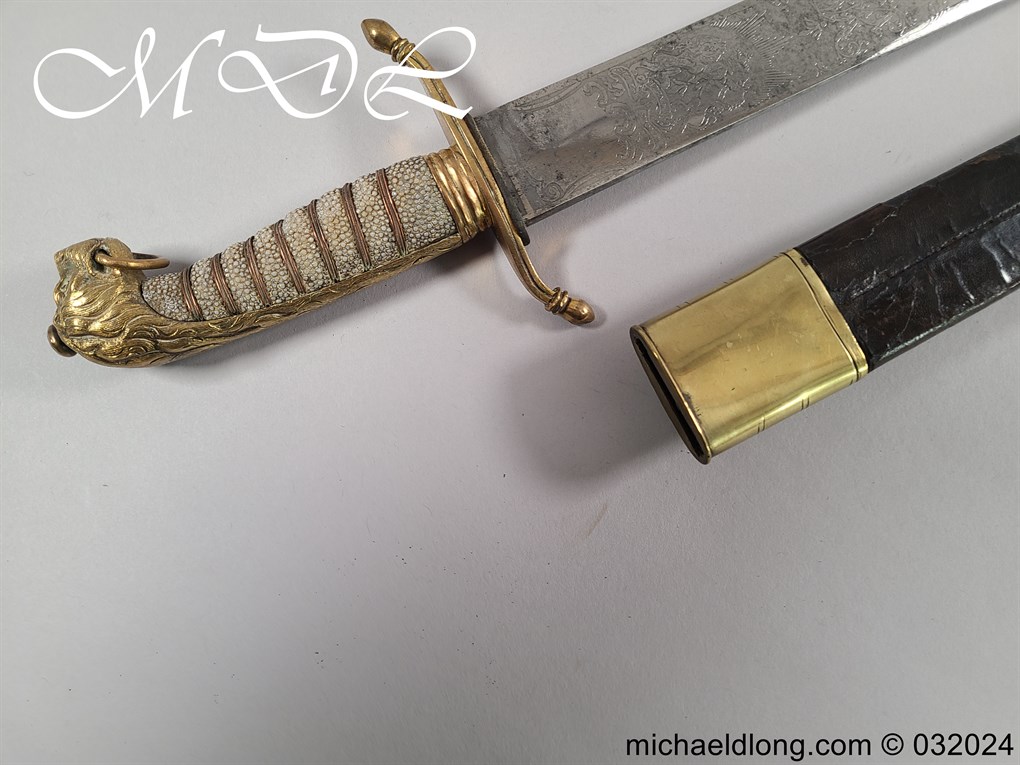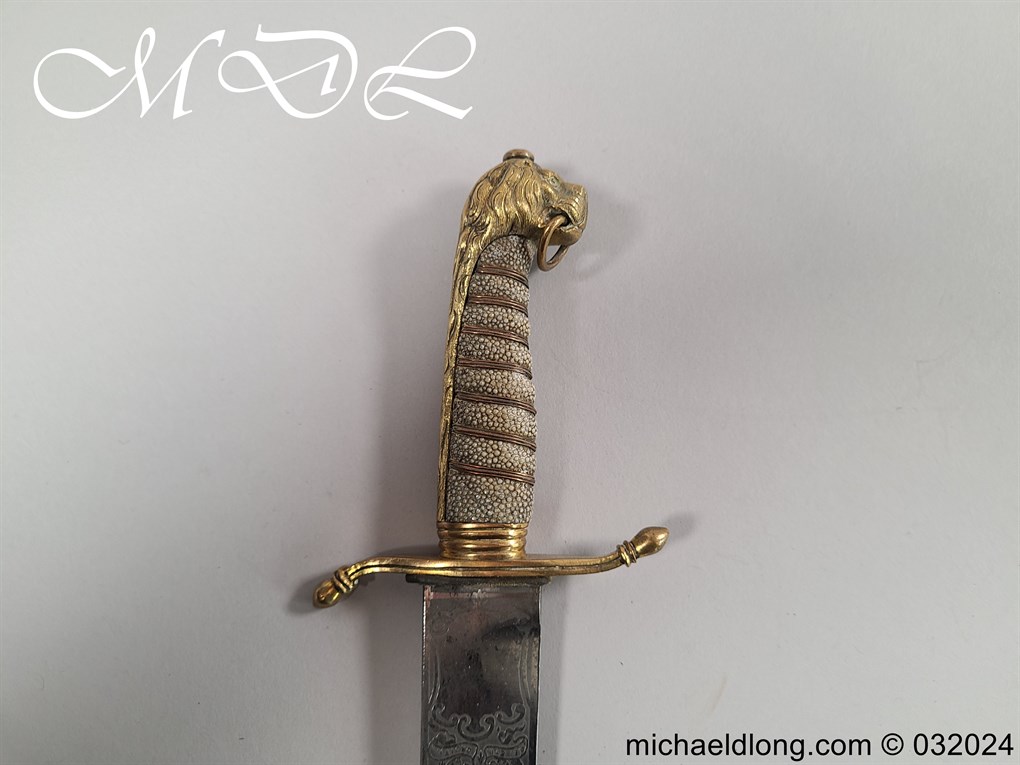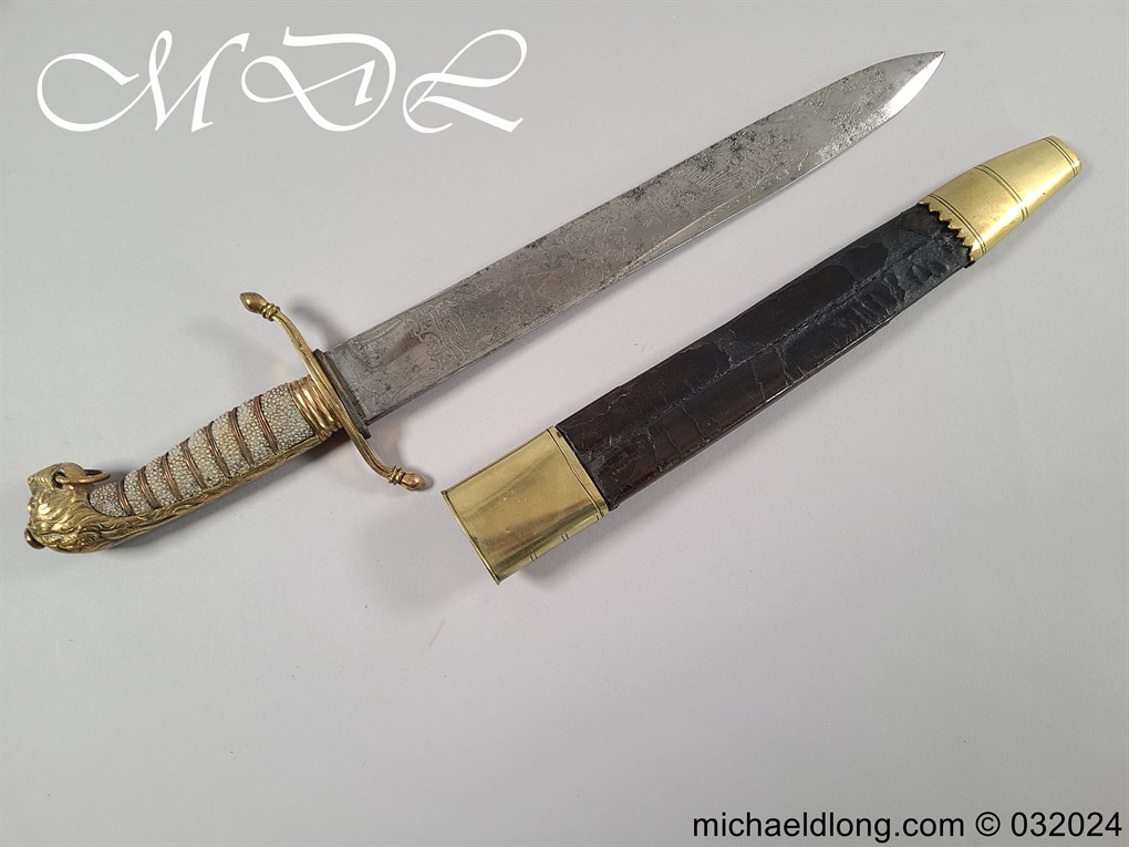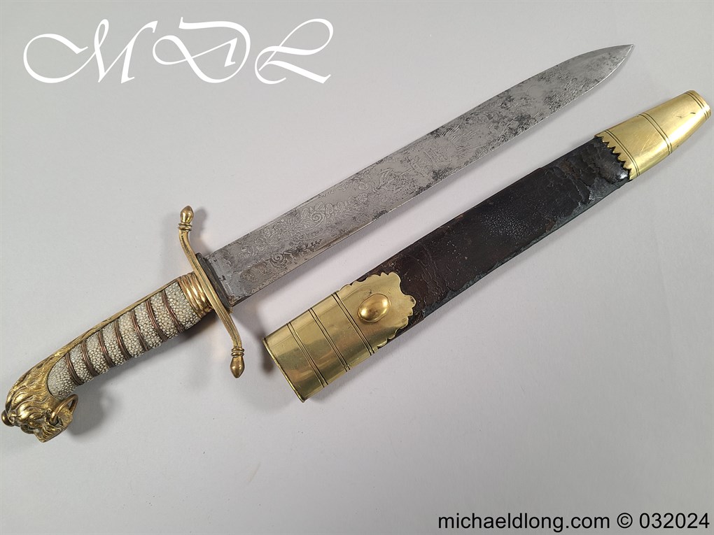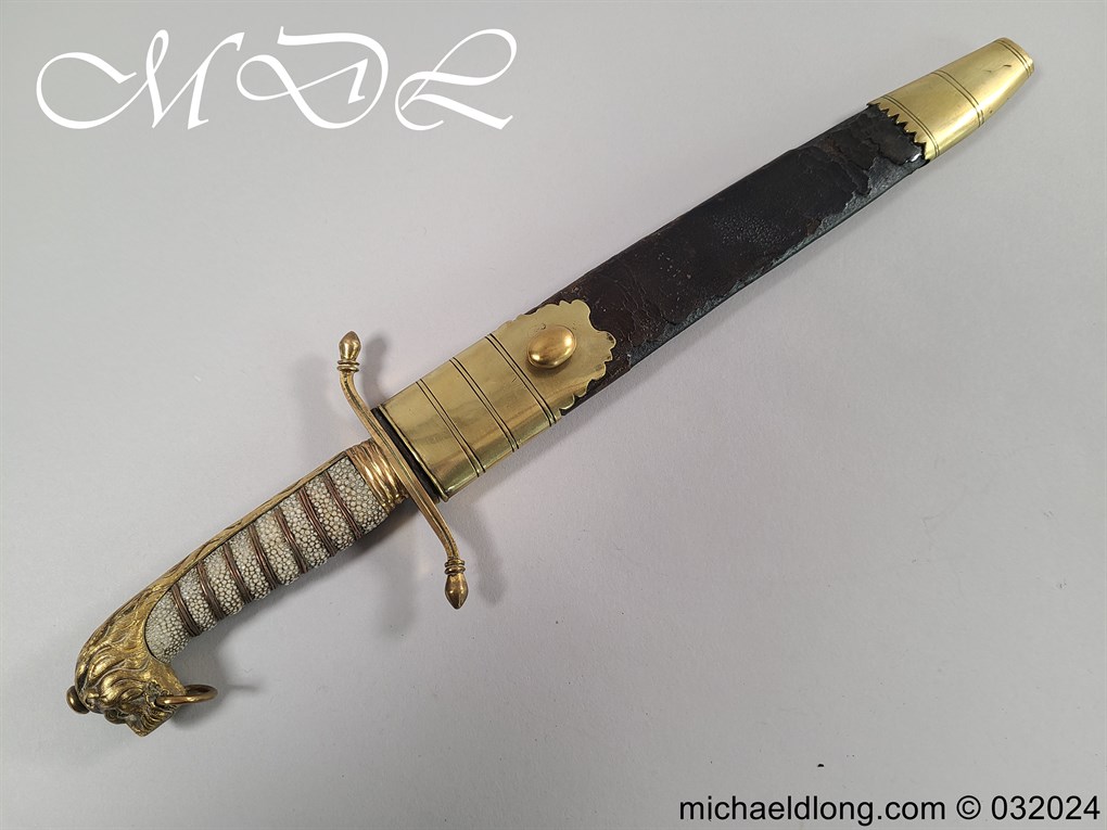 British Naval 1856 Midshipmen Dirk named to J Harriss. This example with the wider and shorter blade 30.5cm in length and 3.5cm in width engraved with V R Crown and Royal Coat of Arms to one side the reverse with Crown and fouled anchor plus owners name and floral decoration. The hilt gilt brass with lion head pommel and fish skin grip secured by brass wire.Complete with black leather scabbard with matching mounts.