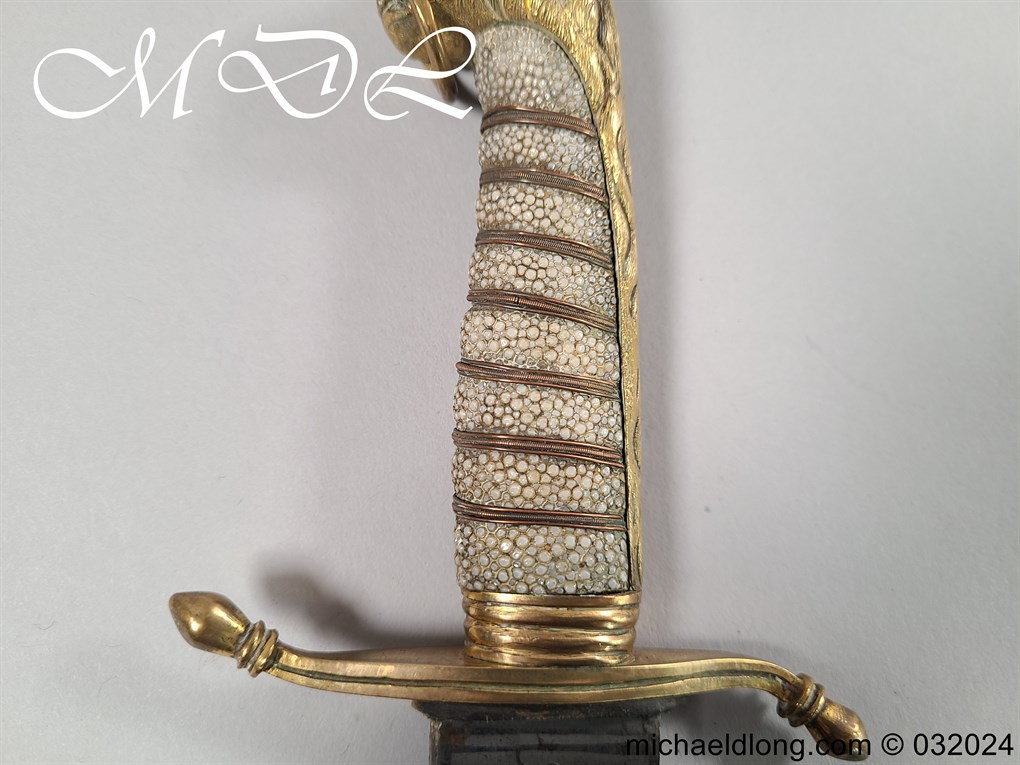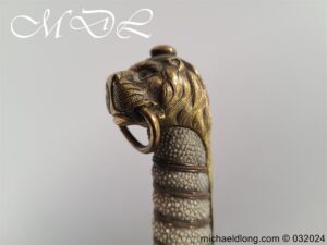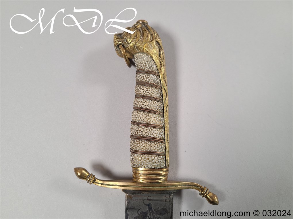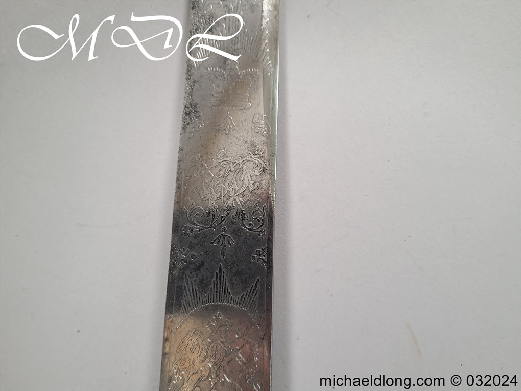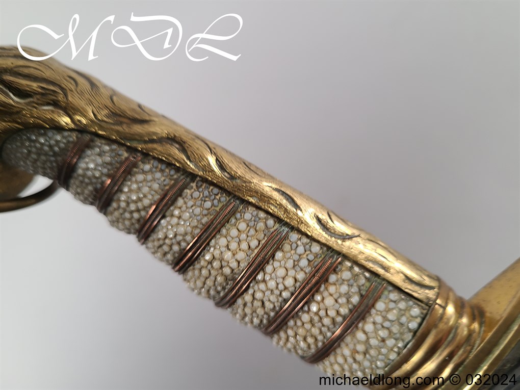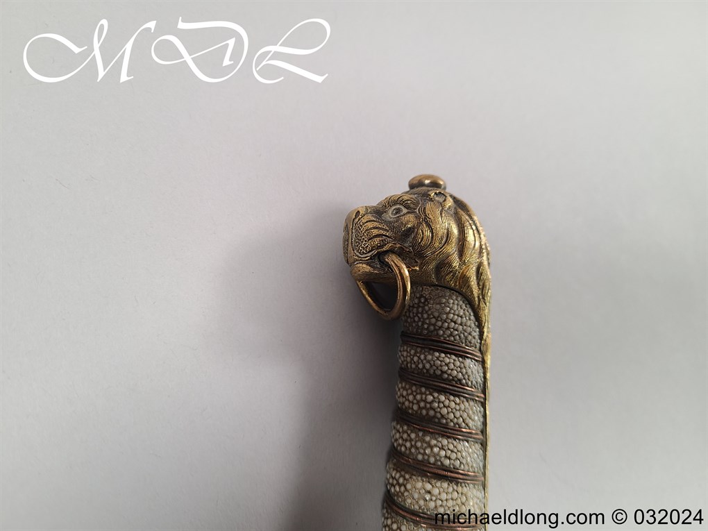 British Naval 1856 Midshipmen Dirk named to J Harriss. This example with the wider and shorter blade 30.5cm in length and 3.5cm in width engraved with V R Crown and Royal Coat of Arms to one side the reverse with Crown and fouled anchor plus owners name and floral decoration. The hilt gilt brass with lion head pommel and fish skin grip secured by brass wire.Complete with black leather scabbard with matching mounts.