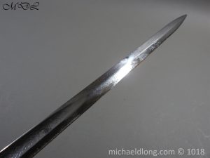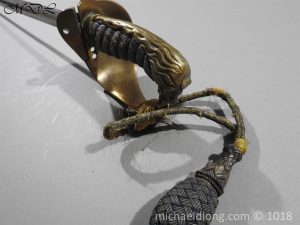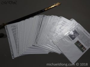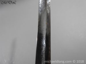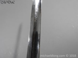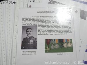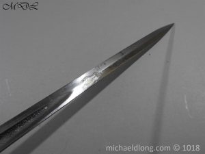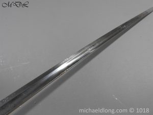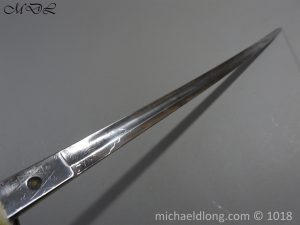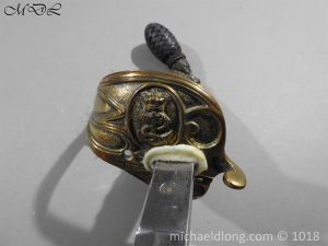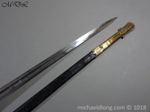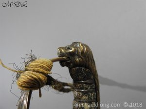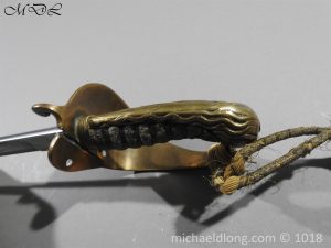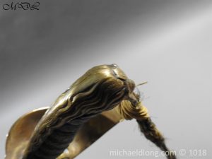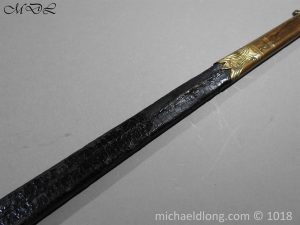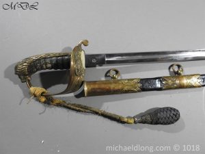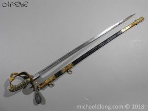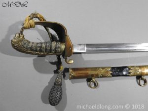 British regulation naval officer’s sword belonging to Captain Henry Bayham who served during WW1 and WW2 Brass hilt with lion head pommel and fish skin grip and officer’s dress knot with age wear. Slightly curved engraved blade marked with retailers name Walton Outfitters Gosport and complete with brass mounted black leather scabbard and research, folding side guard slightly lose but working. Notes: Captain Henry Baynham (Bullets) OBE RN FRAS (also holder of the Egypt Medal, British War Medal and the Khedives Star). (Bullets) Henry Baynham was born 1 June 1847 and was educated at the Naval School, Southsea. Entered the Navy as a Navigating Midshipman in Dec. 1862. Served HMS Victory, Buzzard, Nile, Galatea, Orontes and Phoebe. After a long and illustrious career he retired in December 1884 being medically unfit. In 1888 he was appointed Chief Officer of the Conway. In 1895 he was Superintendent of the Industrial School Ship Wellesley at North Shields. He retired from this post in 1910, aged 63. In 1914 he offered his services to the Admiralty and in Sept. 1915 he was appointed to HMS Victory. In 1917 he was officially notified that he was the oldest officer on the active list! Feb. 1917 promoted to Acting Commander. Jan. 1918 appointed to HMS Cyclops and then HMS Sandringham. He was demobilised June 1919 and reverted to the Retired List. He was 72. OBE awarded 1 Jan. 1919 “Worked at Haslar Training Camp and as supervising officer of the Auxiliary Patrol Depot at Immingham and was Senior Naval Officer of the naval base at Swarbacks Minn in Jan. 1918.” Left Conway to become Capt Sup., of TS Wellesely – photo below.He died 11th June 1933, aged 84