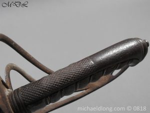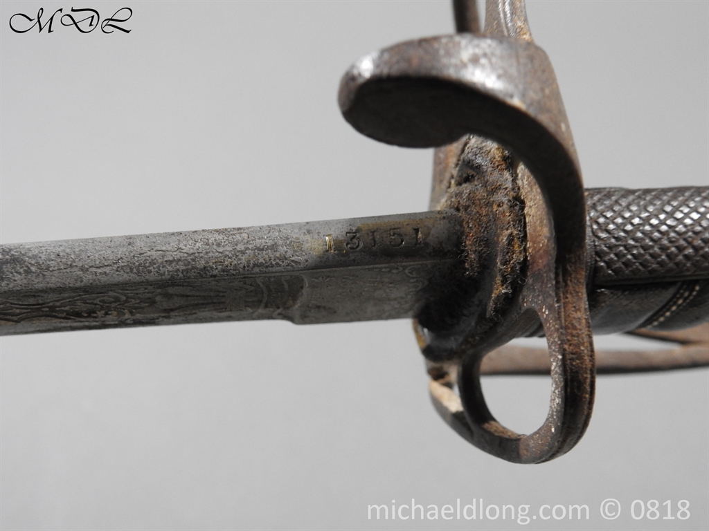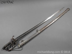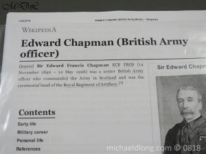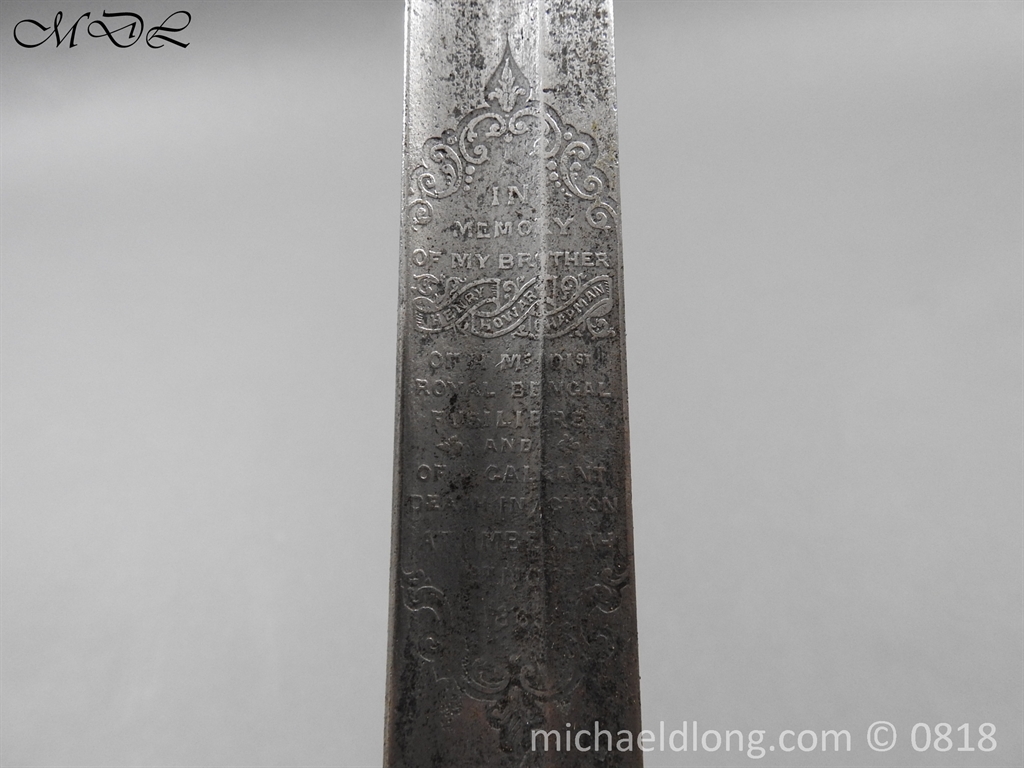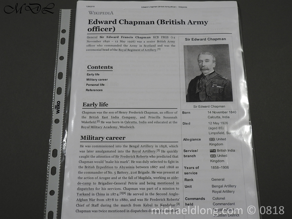 Very interesting sword belonging to Sir Edward Francis Chapman KCB FRGS senior British Army officer who commanded the army in Scotland and was the Ceremonial head of the Royal Regiment of Artillery. This sword is by Wilkinson sword numbered 13151 with his motto and crest plus memorial to his bother Henry Howard Chapman of the Royal Bengal Fusiliers death in action Atumbeylah 19th November 1863 complete with steel scabbard and research