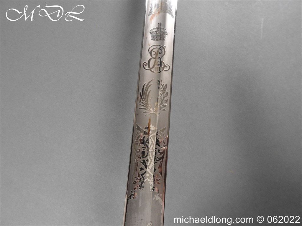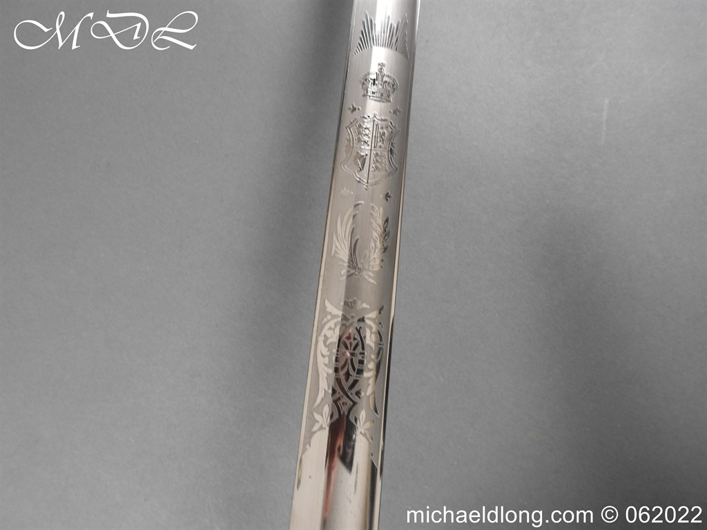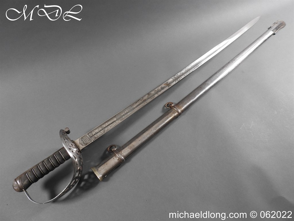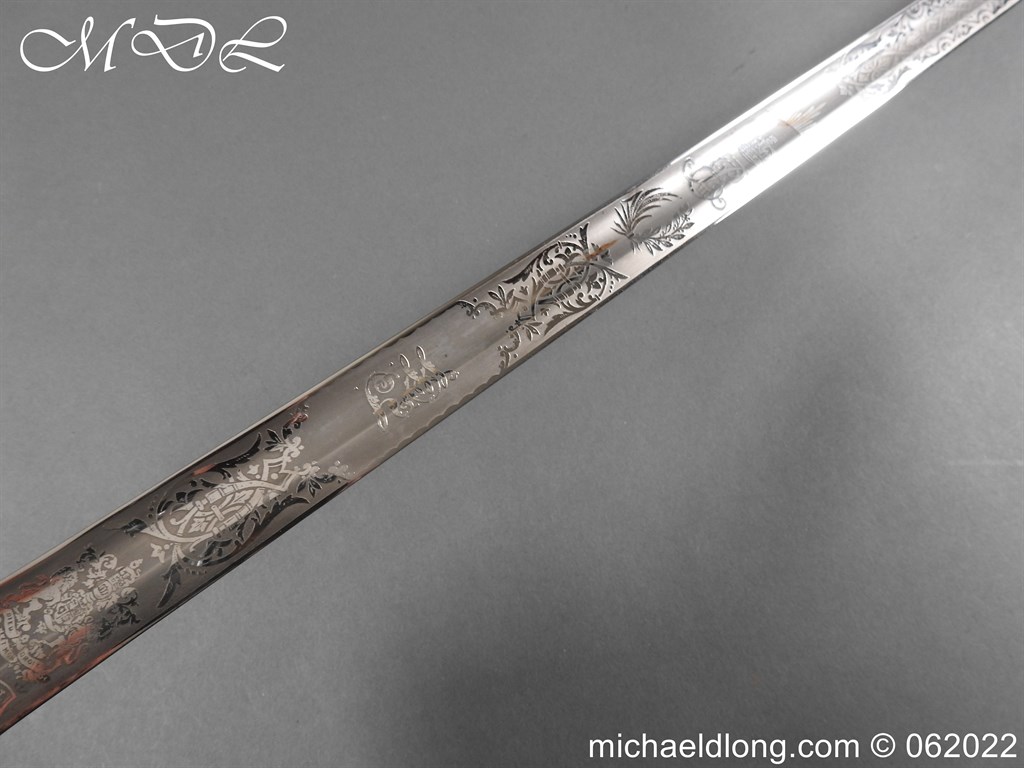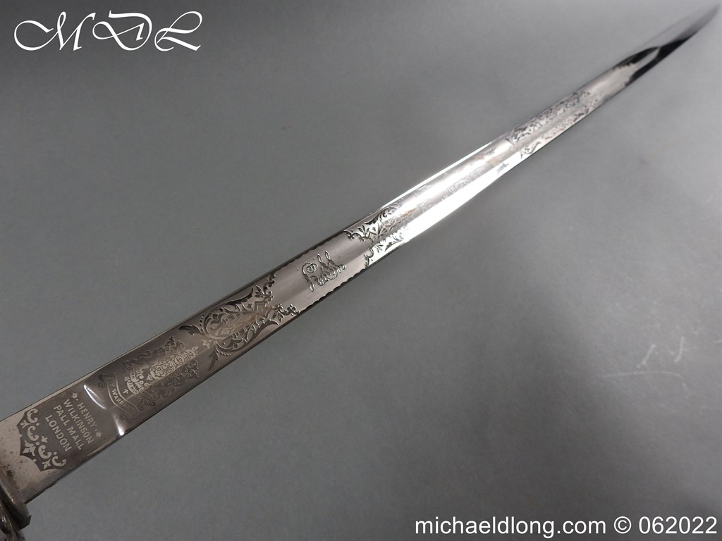British Officer’s Cavalry Sword By Wilkinson No39354 belonging to Sir William Younger, 1st Baronet, of Auchen Castle. Regulation pattern sword with ladder hilt, chequered pommel and back strap and complete with fish skin grip. The blade in stunning condition with etched ERVII and crown owners initial WY and makers details Henry Wilkinson. Complete with steel scabbard with 2 loose rings. Notes: He was Lieutenant 16th Lancers, Captain Lanarks Yeo, Major Sherwood Rangers (Notts Imperial Yeo), Member of Parliament (M.P.) (C) Stamford and (Lib) Peebles and Selkirkshire Jan–Dec 1910, memb Royal Commn Housing in Scotland 1913–17, Honour Doctor of Law in 1895