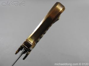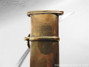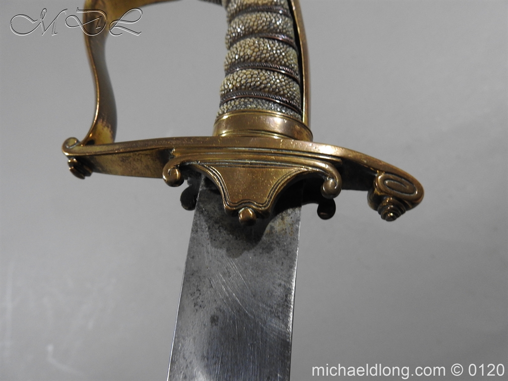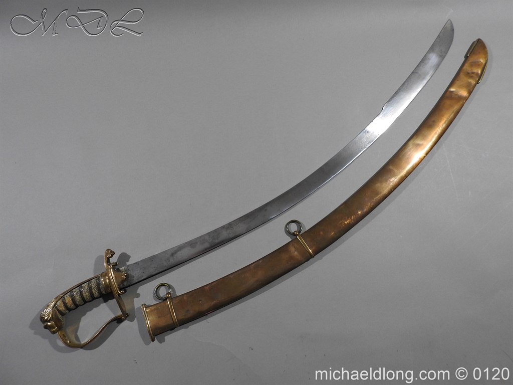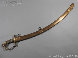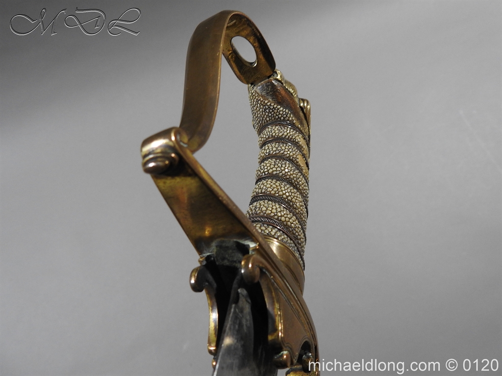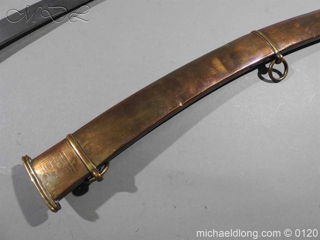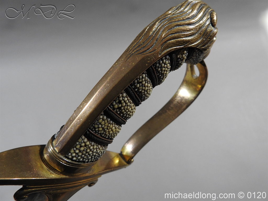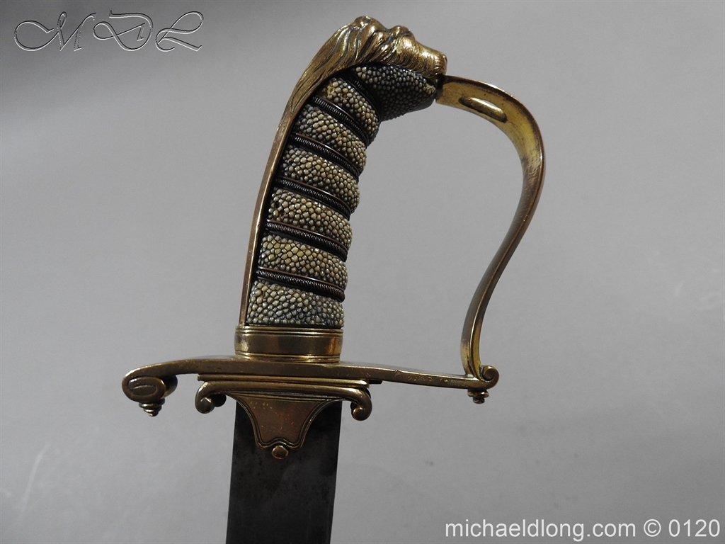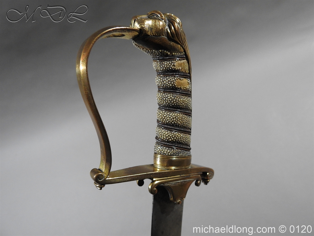 British Officer’s Light Cavalry Offer’s Sword by Prosser excellent sword with gilt brass hilt with lion head pommel, ray skin bound grip with decorative cross guard and langets. The curved fighting blade with Prosser clipped point and complete with matching gilt brass scabbard which is engraved with Prosser London