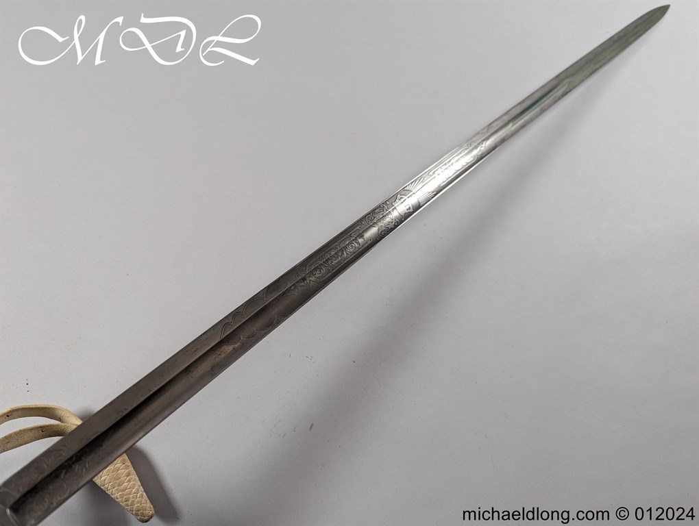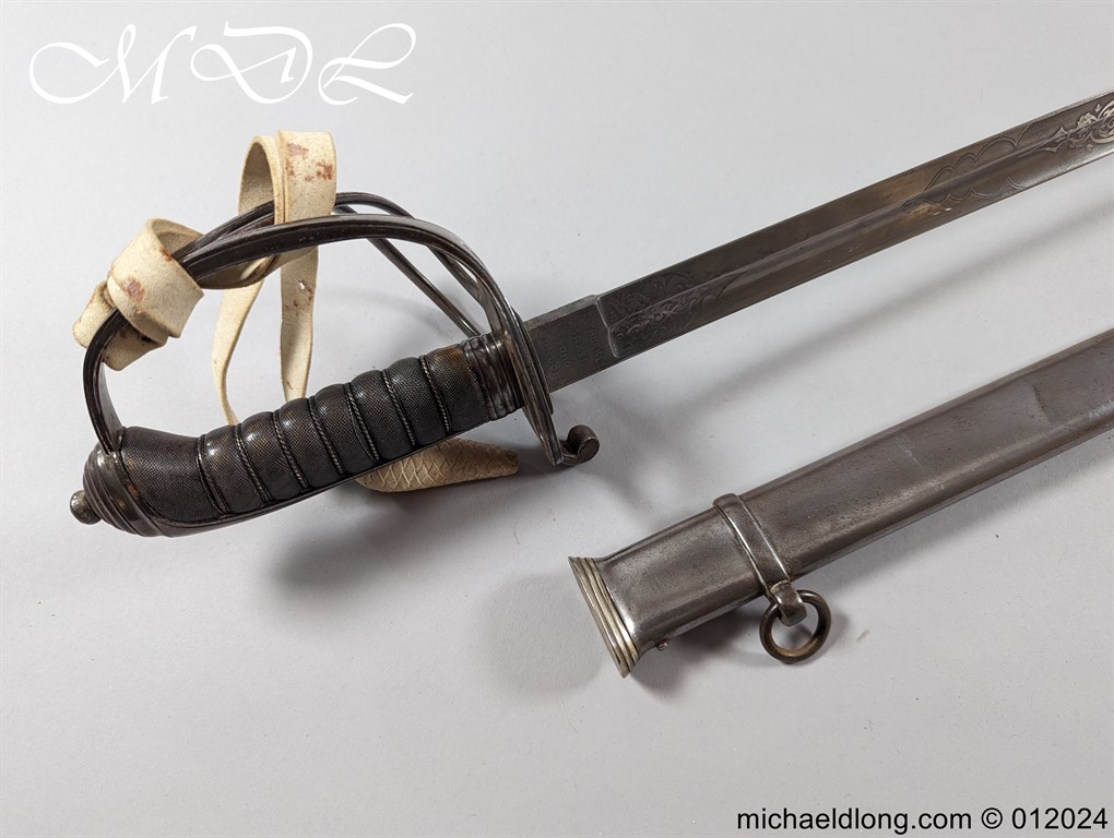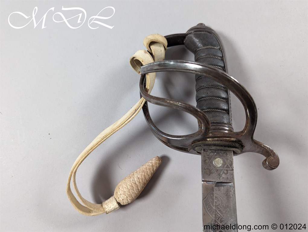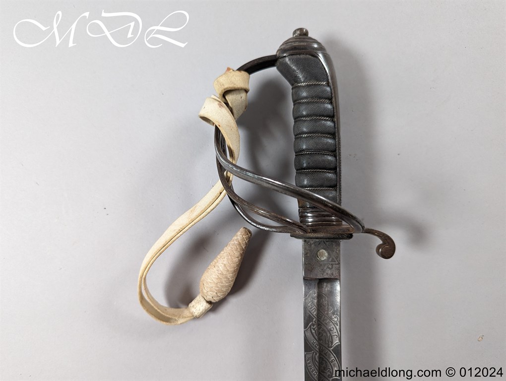 British Officers P1821 Light Cavalry Prize Sword, regulation 3 bar hilt with fish skin grip, stepped pommel and white buff sword knot. The blade regulation nicely engraved with V R and crown to one side the reverse with presentation as follows: 1893 Ayrshire Yeomanry Best Swordsman B troop J C Tabrum. Maker marked E Thurkle Soho London and complete with steel scabbard, overall length 105cm the blade 91cm