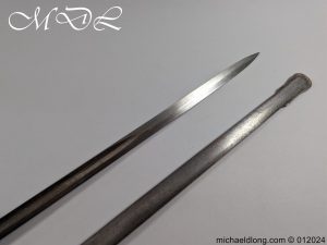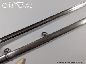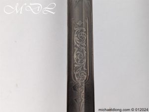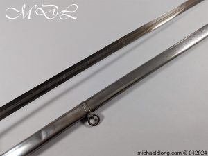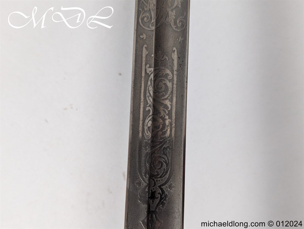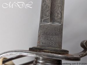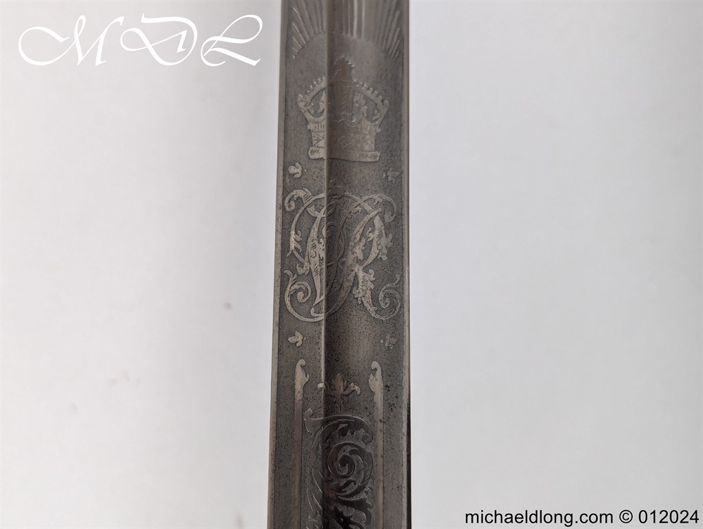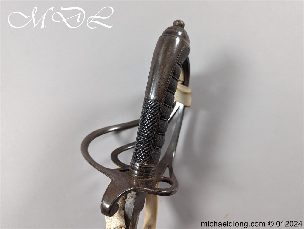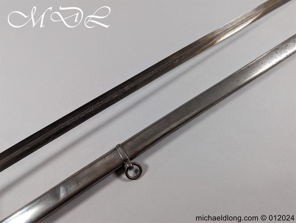 British Officers P1821 Light Cavalry Prize Sword, regulation 3 bar hilt with fish skin grip, stepped pommel and white buff sword knot. The blade regulation nicely engraved with V R and crown to one side the reverse with presentation as follows: 1893 Ayrshire Yeomanry Best Swordsman B troop J C Tabrum. Maker marked E Thurkle Soho London and complete with steel scabbard, overall length 105cm the blade 91cm