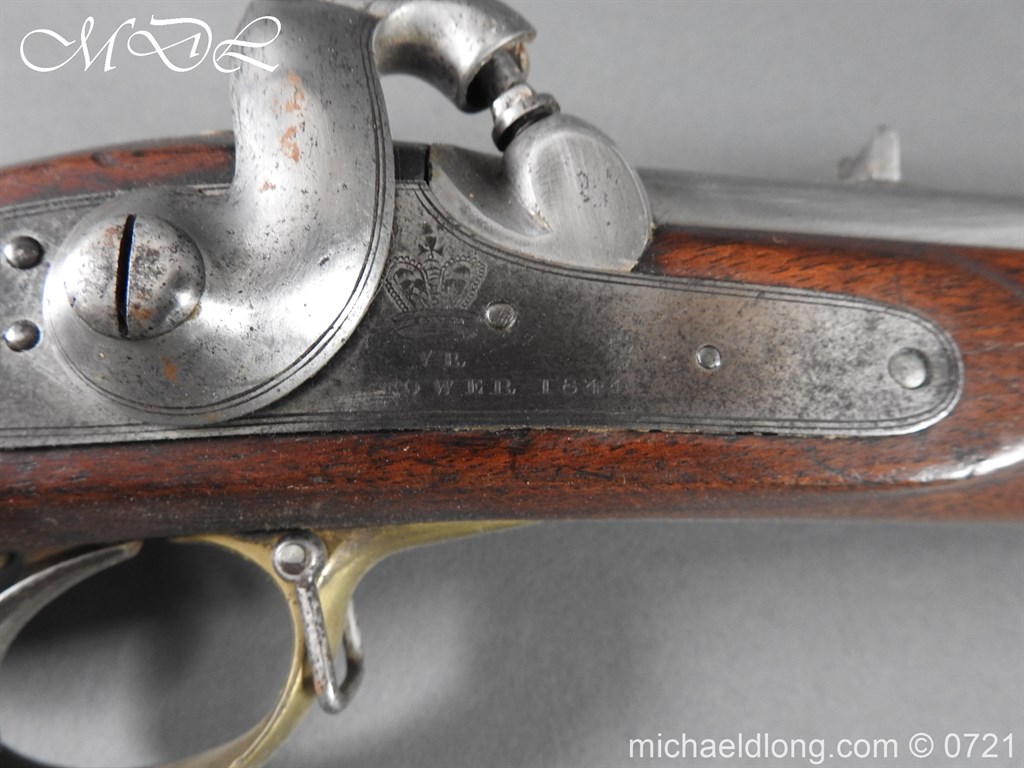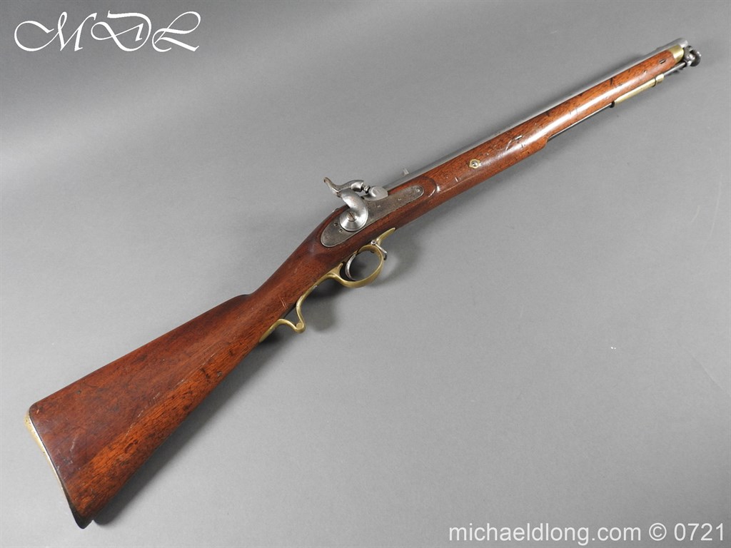 British Pattern 1844 Percussion Cavalry Carbine, With round sighted barrel, stamped with numerous proof and inspection marks at the breech, plain tang, double line engraved lock with crowned ‘VR’ and ‘TOWER 1844’, Walnut full-stock stamped with Board of Ordnance marks, maker’s mark ‘GH’ with regulation brass furniture throughout and original captive ramrod stamped with military marks. Free UK mainland shipping only