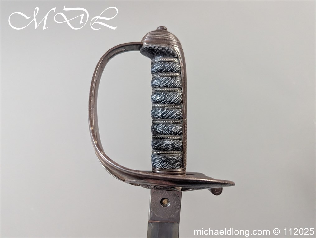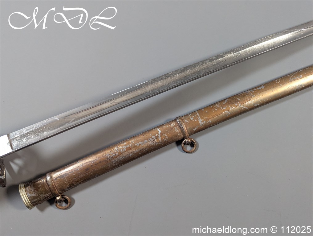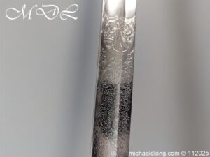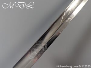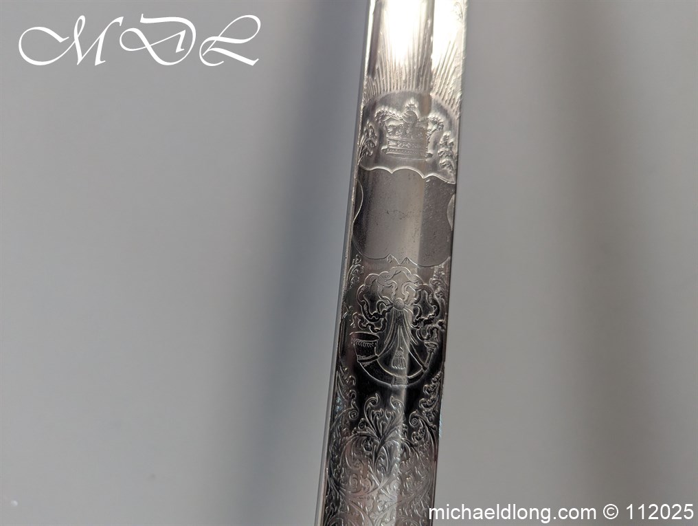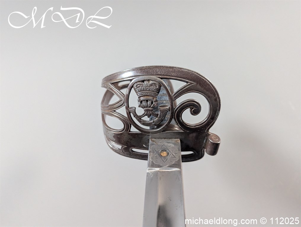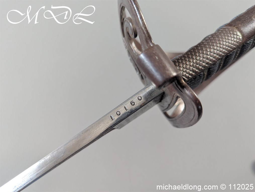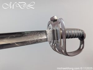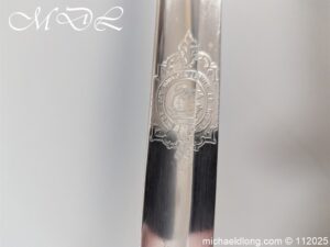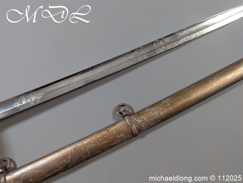 British Rifles Officers Sword by Wilkinson in very good condition number 10160 Rifles Sword R. W. Grey 14/2/1860 of Northumberland. Early example so the quality of the sword is excellent, regulation hilt, grip and back strap. The blade is super with deep engraving detailing V R crown the reverse with slung bugle and family crest. Maker marked Henry Wilkinson Pall Mall London with proof plug to the reverse side and the spine numbered. Complete steel scabbard with no damage or dents but it has been varnished at some point which could be removed easily. Notes: 26th Customs & Excise Middlesex RVC of four companies raised on 9 February 1860 was recruited from customs officers in the London docks. Under the command of Major Lieutenant-Colonel from 1861 Ralph William Grey, former MP and Commissioner of Customs