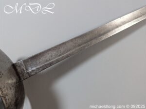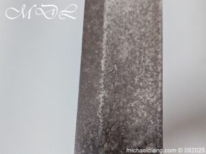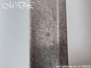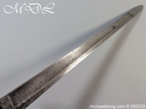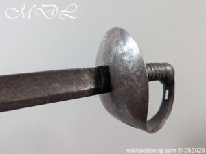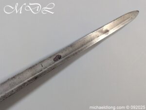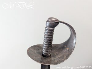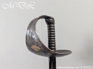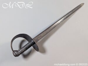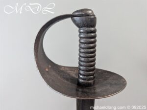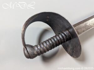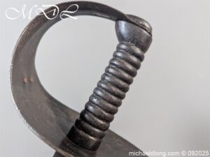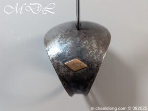 British Royal Naval 1875 Cutlass regulation pattern with broad blade straight with large fuller, single edged becoming spear point at the tip. Sheet steel bowl hilt with ribbed cast iron grip with brass plaque stamped No 62. Various markings including small broad arrow and I think what is know as an out of service mark two arrows pointing at each other, overall length 34.5 inch blade 29.25 inch