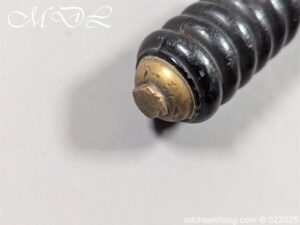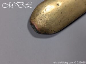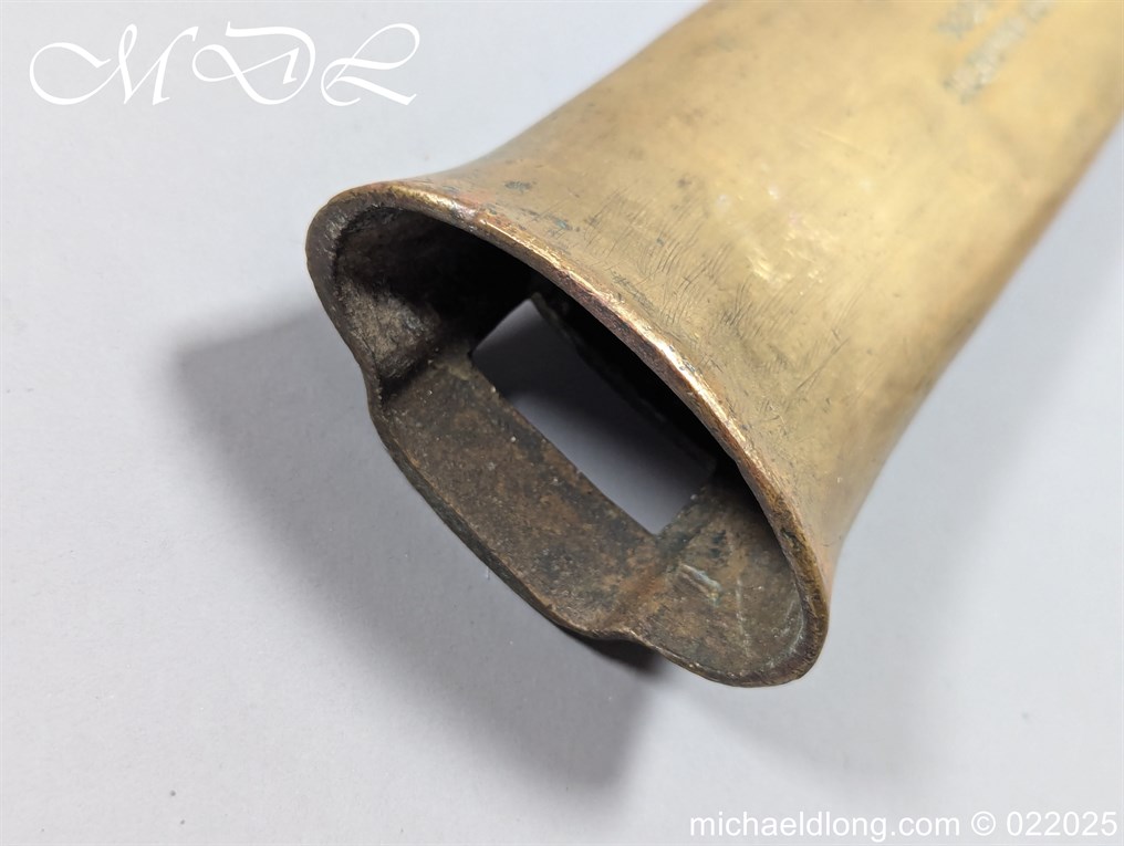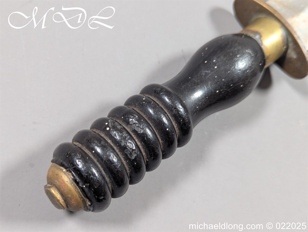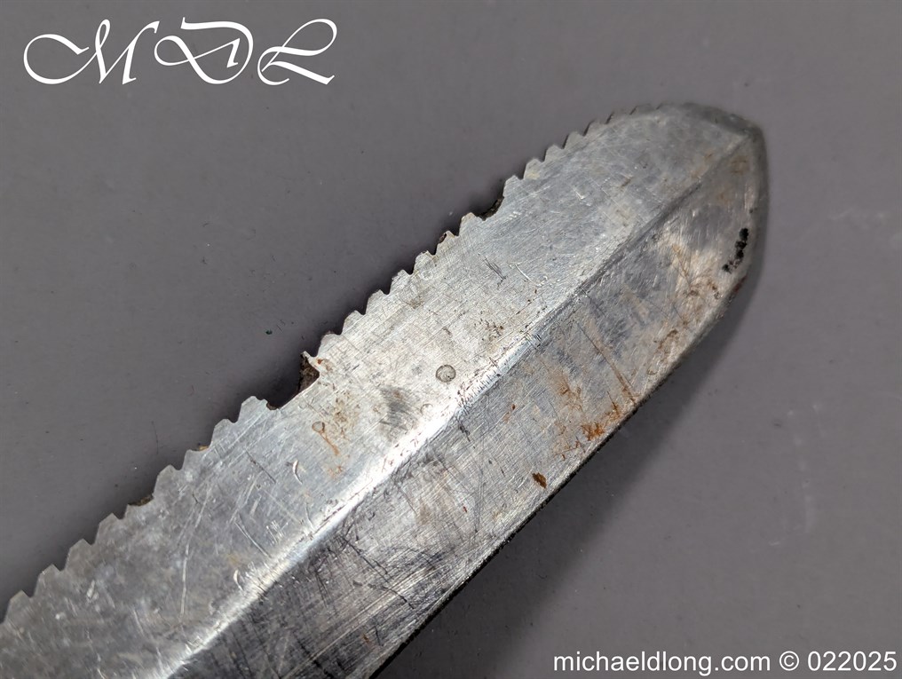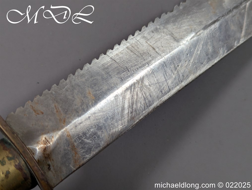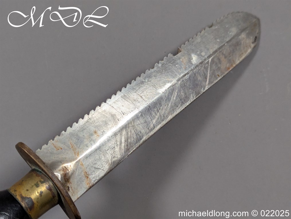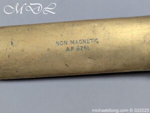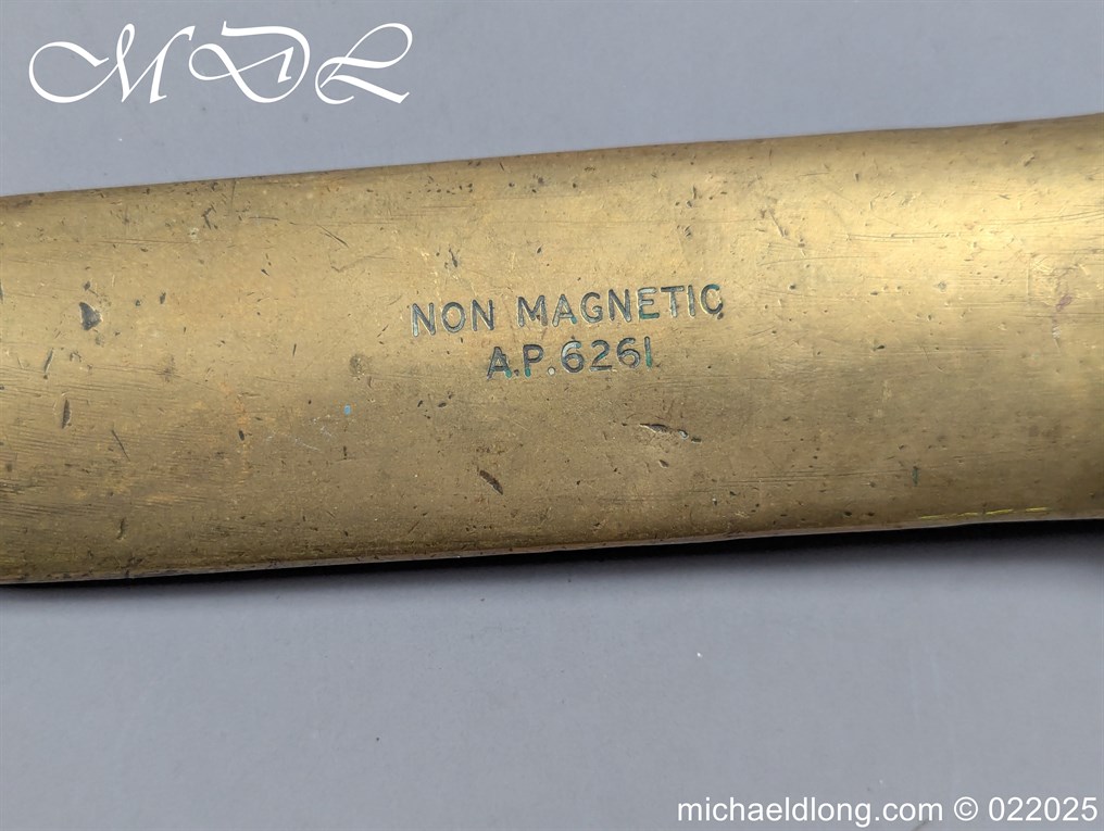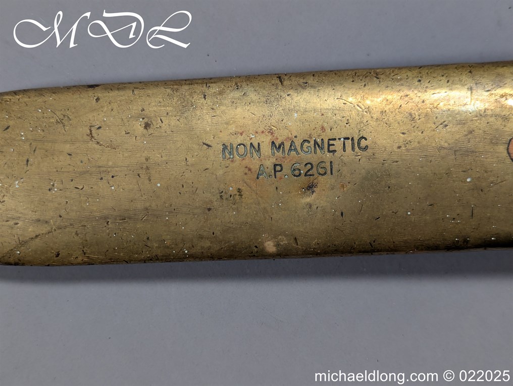 The scabbard is stamped Non-Magnetic A.P. 6261- Admiralty Pattern no. 6261 good used condition. Turned bakelite handle, brass collar and double-edged blade one edge serrated with age wear