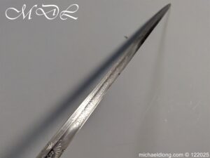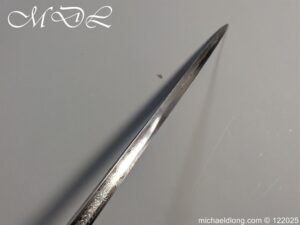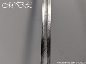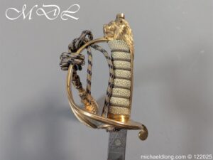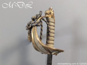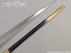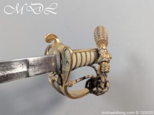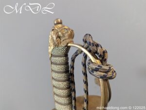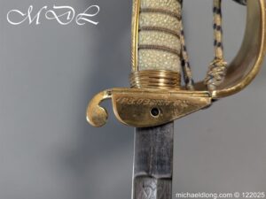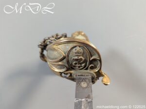 British Royal Naval Submariner Officers Sword. Lieutenant O’Brien was the commanding officer of the HMS B2, one of several submarines participating in Channel exercises off the coast of Dover in the lead-up to the First World War. Regulation sword by Gieves complete with dress knot. The fold down guard named to P B O’Brien the hilt in very good condition and the blade engraved with Kings Crown, Royal Coat of Arms and Fouled Anchor. Complete with black leather scabbard with gilt mounts again in good condition with slight discolour to drag all contained in leather cover. Notes: In the early hours of October 4, 1912, the HMS B2, while surfaced, accidentally collided with the German passenger liner SS Amerika. The collision resulted in the sinking of the submarine and the deaths of 15 crew members, including Lieutenant O’Brien.