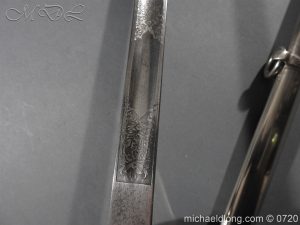 British Victorian 1897 Officers Sword in parade condition, plated regulation hilt with full dress knot and fish skin grip. The blade engraved with VR crown and and royal coat of arms plus floral decoration. It is complete with matching parade scabbard with no dents or damage, a rare sword to find in this condition