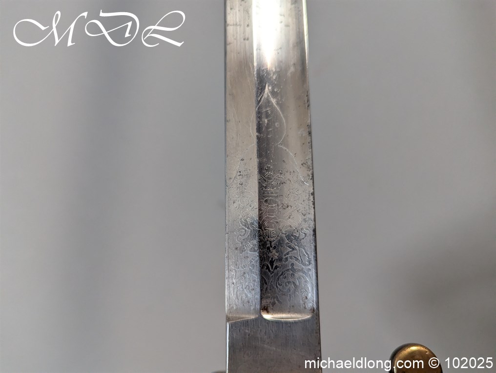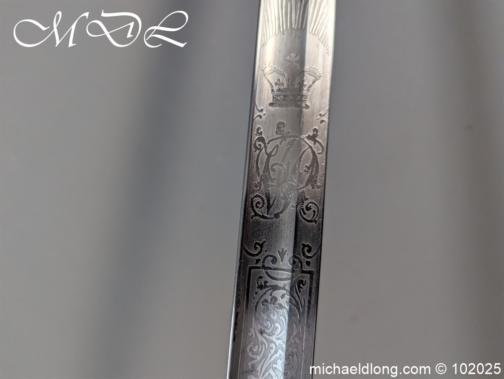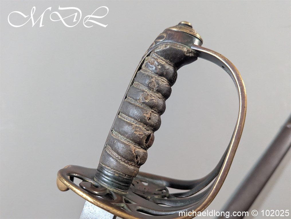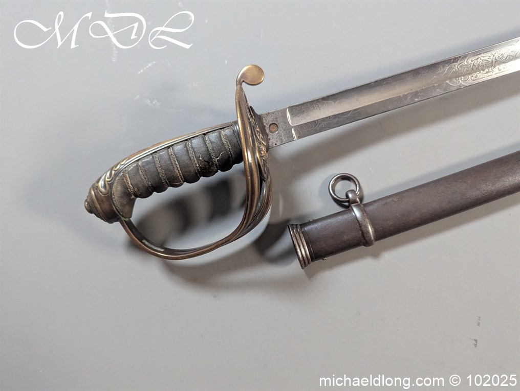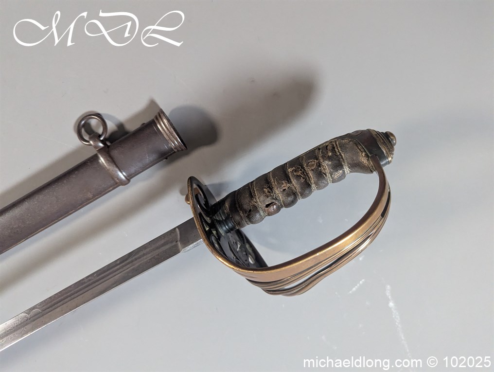 British Victorian Infantry Officer Sword pattern 1822 regulation brass hilt with V R and crown insert. The fish skin grip is secured by twisted wire and does show age wear please see images. The blade is good condition and well engraved with V R and crown to both side with floral decoration, maker marked Stovel and Grant Conduit St London plus percussion arrow to spine. The blade 32.25 inches and complete with steel scabbard with two loose rings