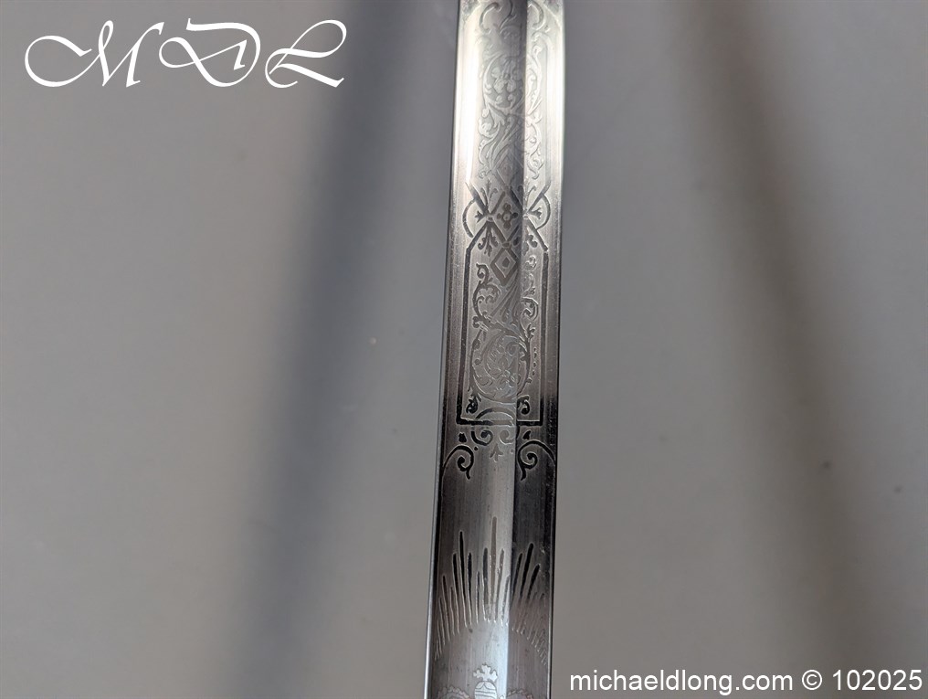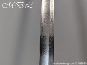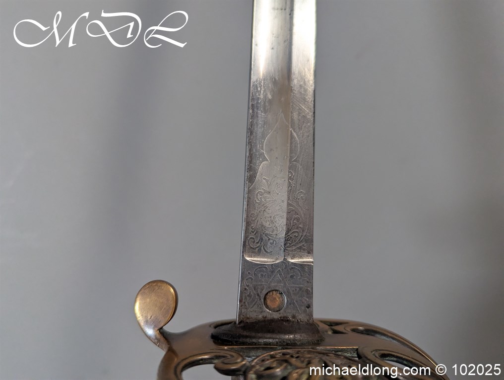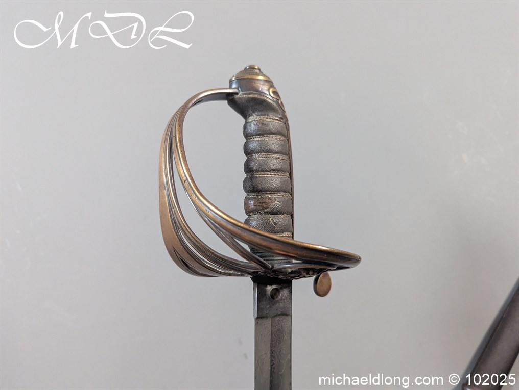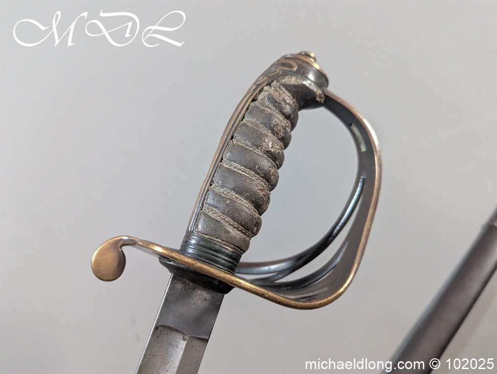 British Victorian Infantry Officer Sword pattern 1822 regulation brass hilt with V R and crown insert. The fish skin grip is secured by twisted wire and does show age wear please see images. The blade is good condition and well engraved with V R and crown to both side with floral decoration, maker marked Stovel and Grant Conduit St London plus percussion arrow to spine. The blade 32.25 inches and complete with steel scabbard with two loose rings