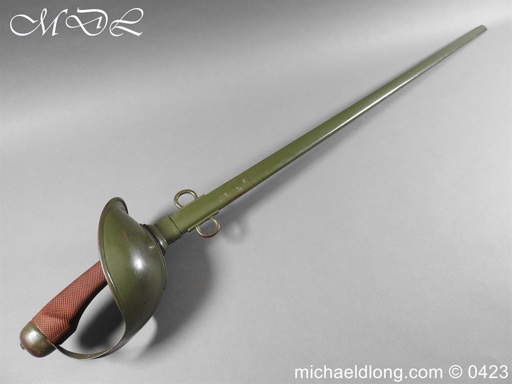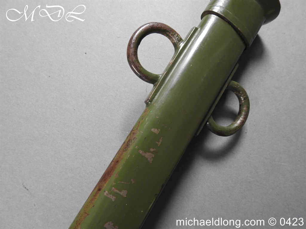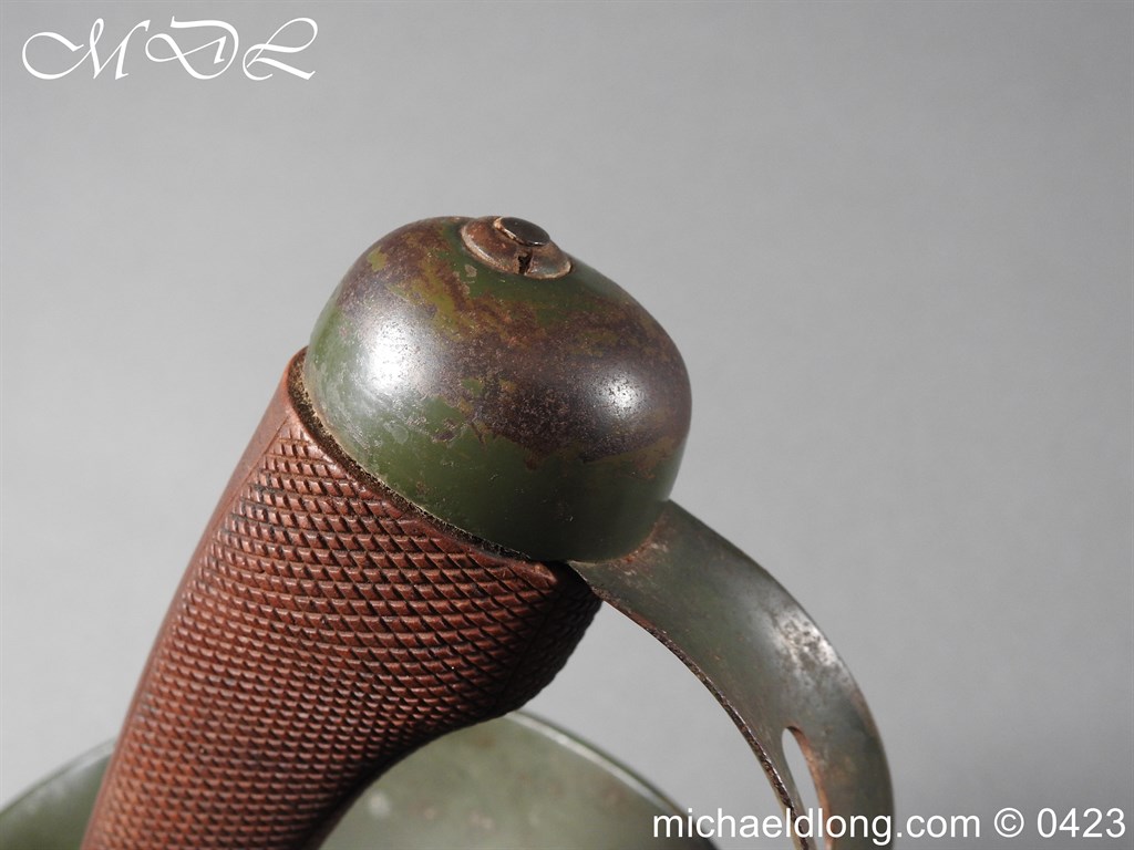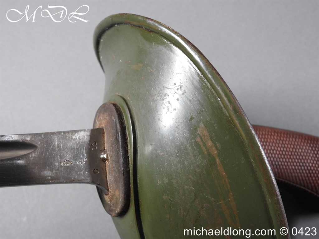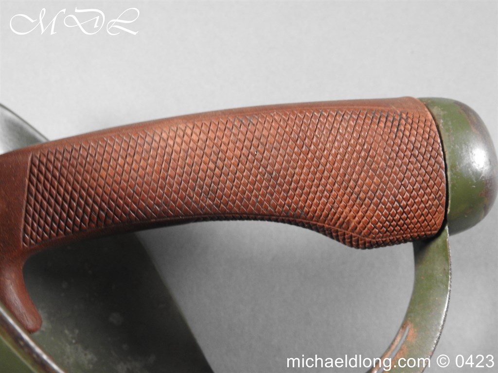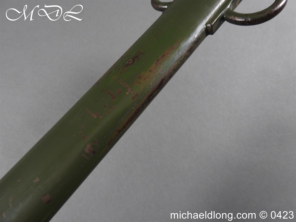 British WW1 1908 Troopers Sword By Wilkinson with inspection and issue stamps for 1915 to the blade and scabbard. Painted green finish with age wear to all area’s complete with composite grip blade in very good condition
