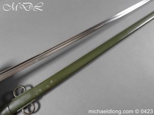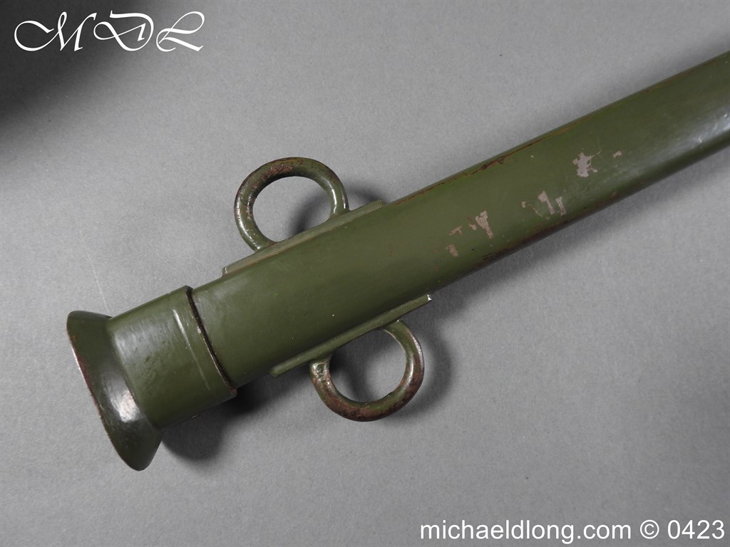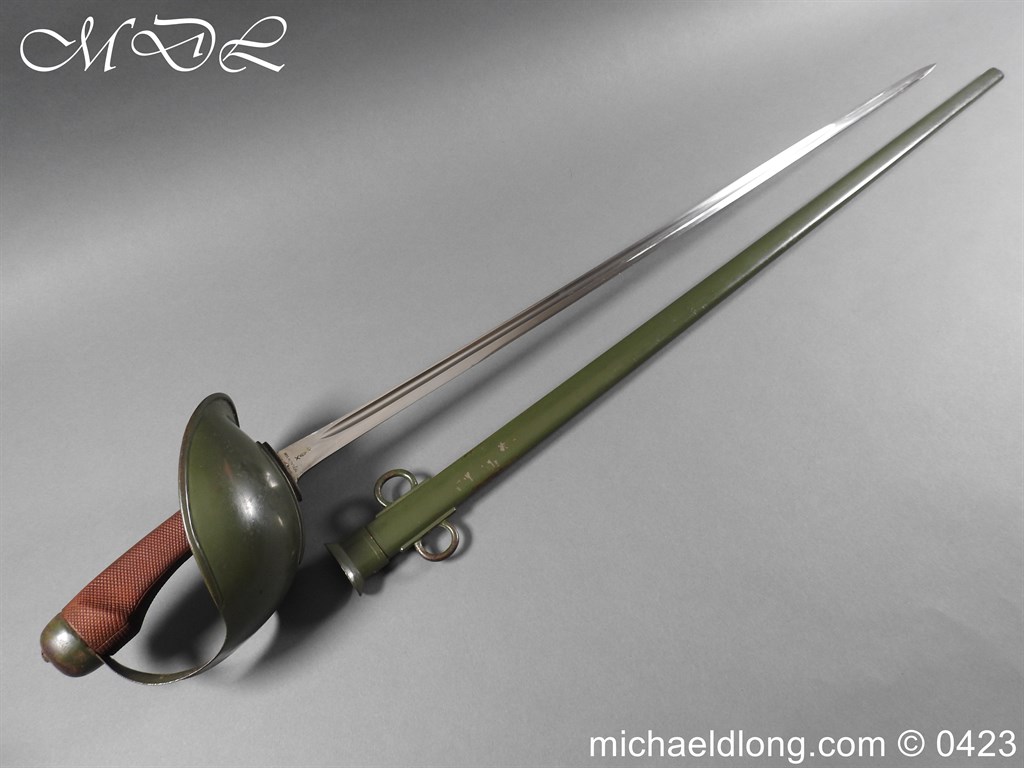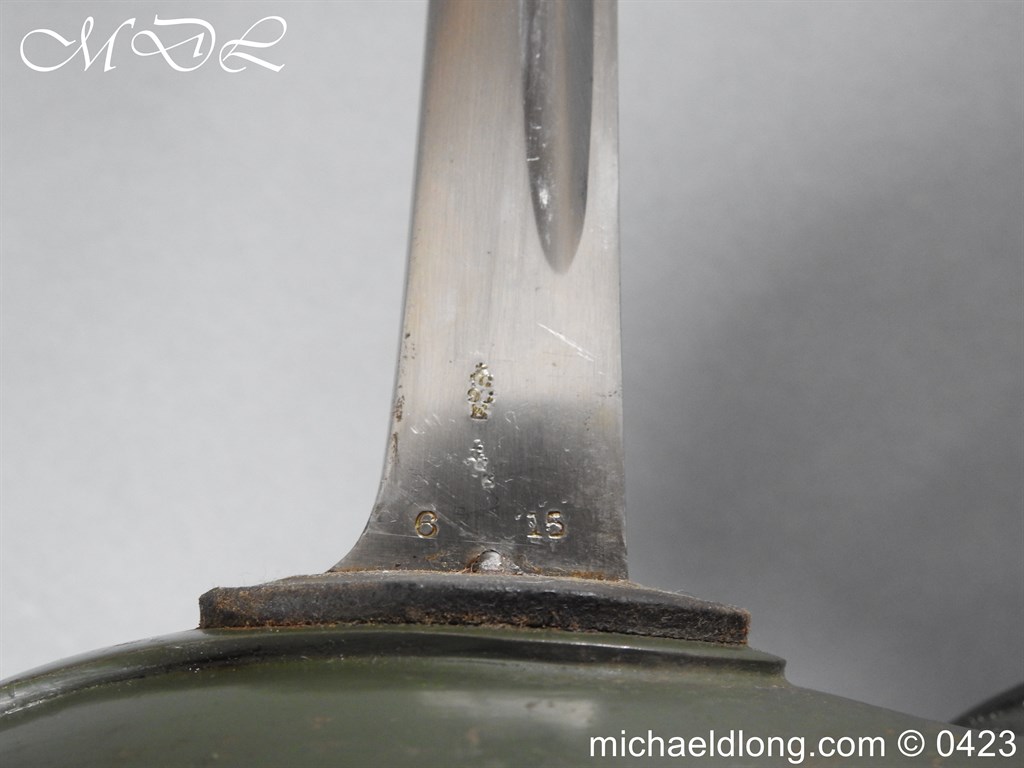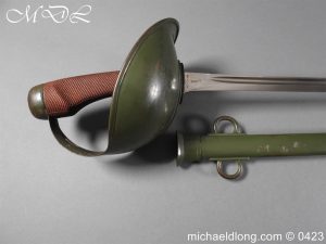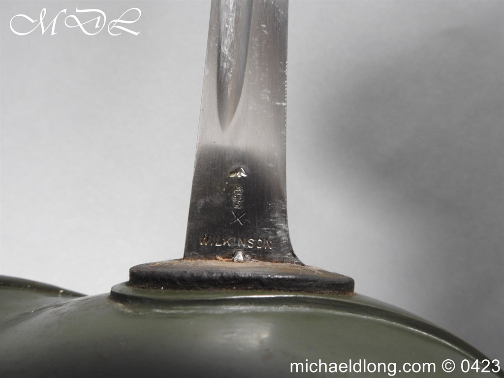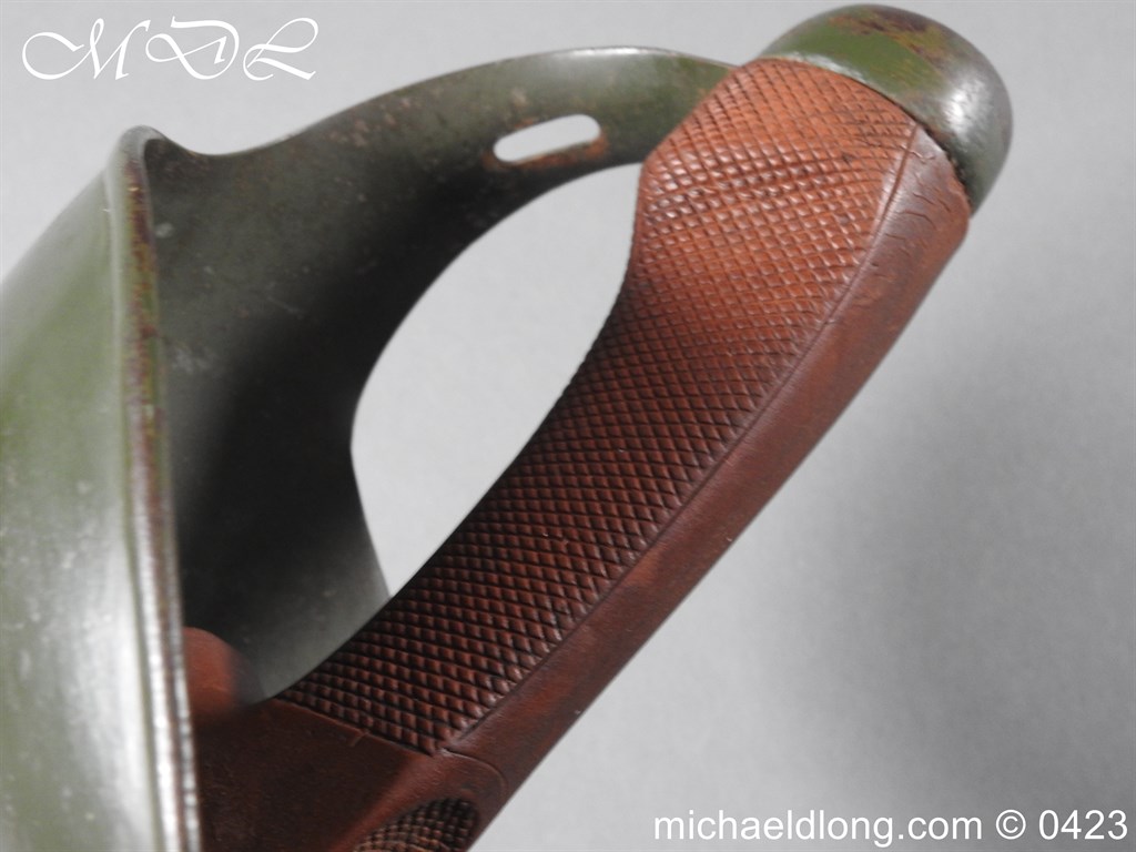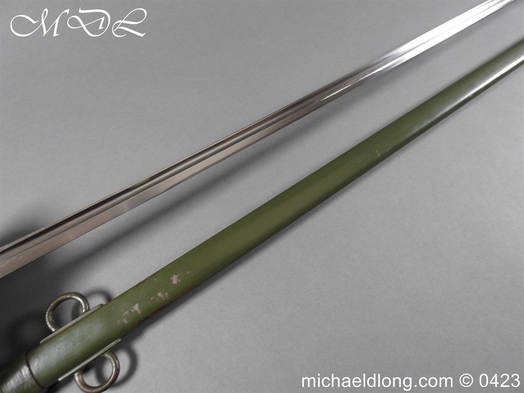 British WW1 1908 Troopers Sword By Wilkinson with inspection and issue stamps for 1915 to the blade and scabbard. Painted green finish with age wear to all area’s complete with composite grip blade in very good condition