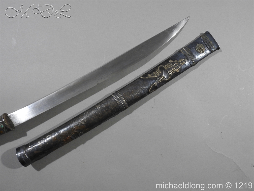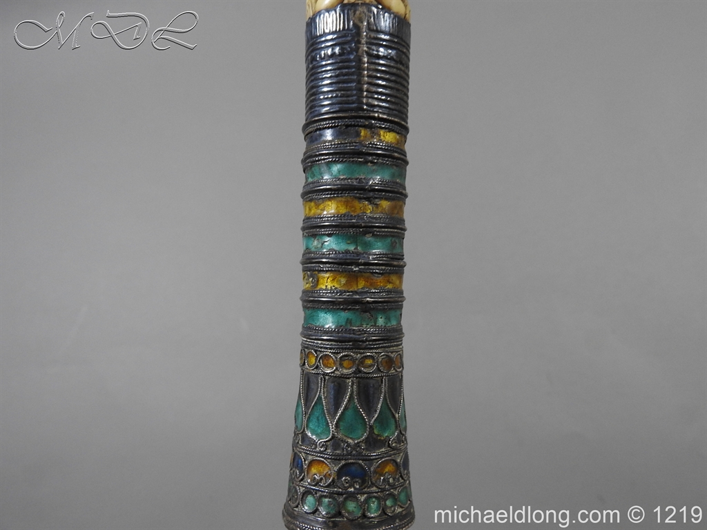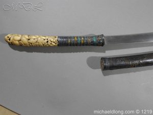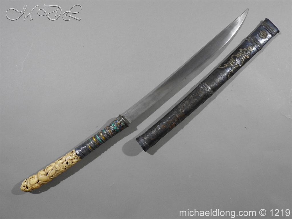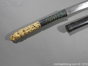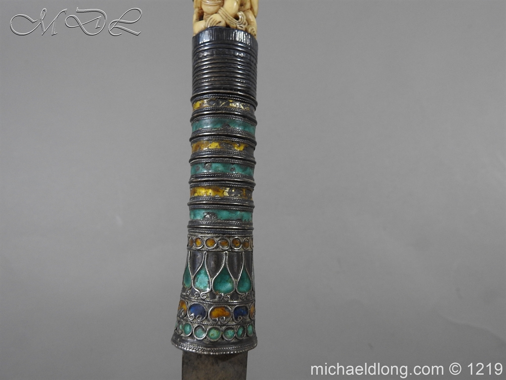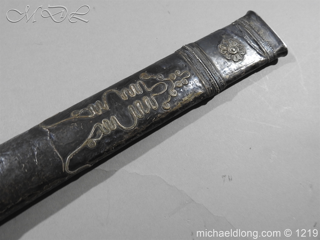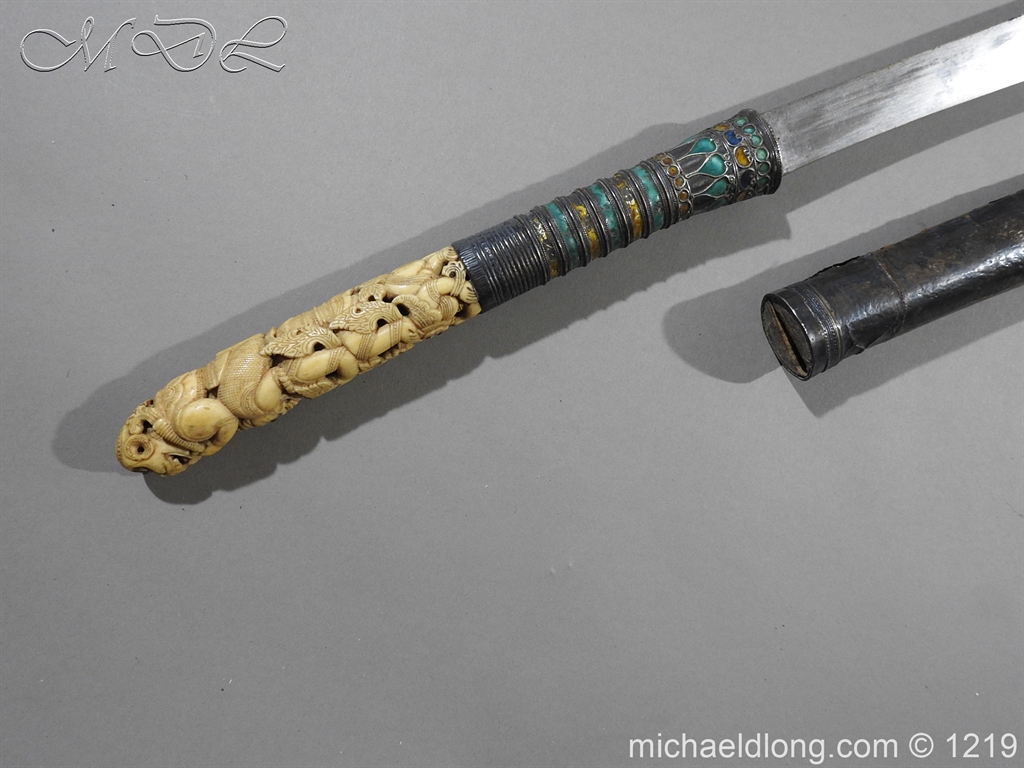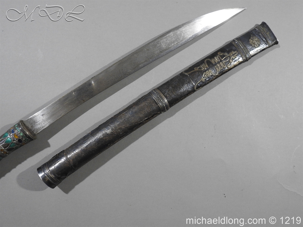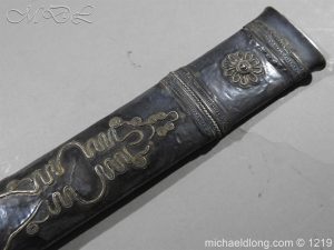 Excellent example with the hilt being carved with figures and floral decoration to a very high standard. The lower level embossed with silver and enamel work leading to a high quality blade. The scabbard being wooded and covered in a silver wrap with super gold line decoration overall length 66cm blade 40cm