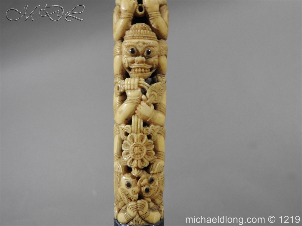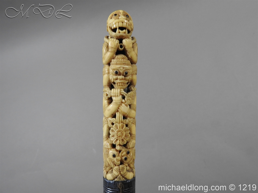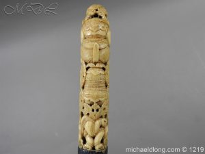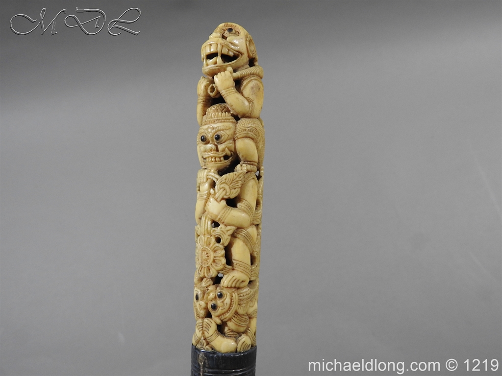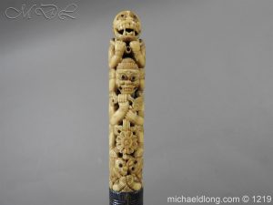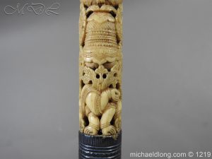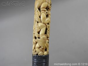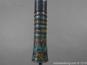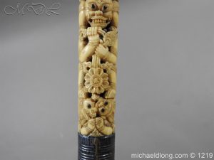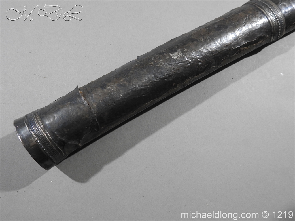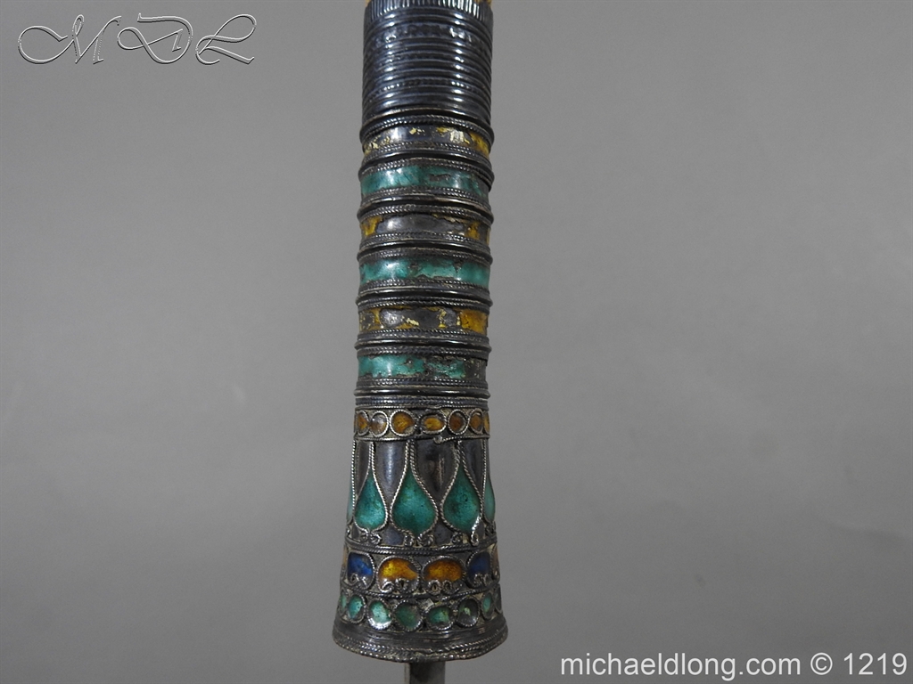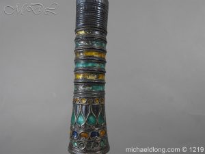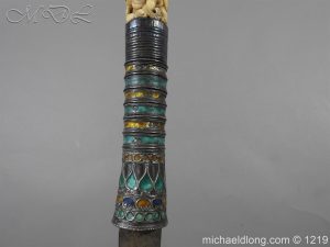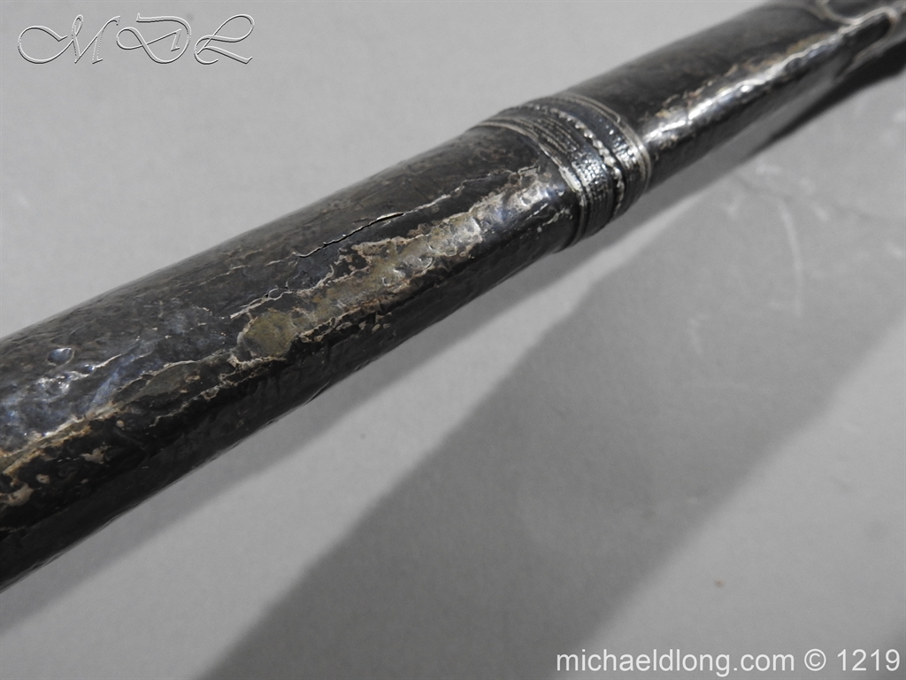 Excellent example with the hilt being carved with figures and floral decoration to a very high standard. The lower level embossed with silver and enamel work leading to a high quality blade. The scabbard being wooded and covered in a silver wrap with super gold line decoration overall length 66cm blade 40cm