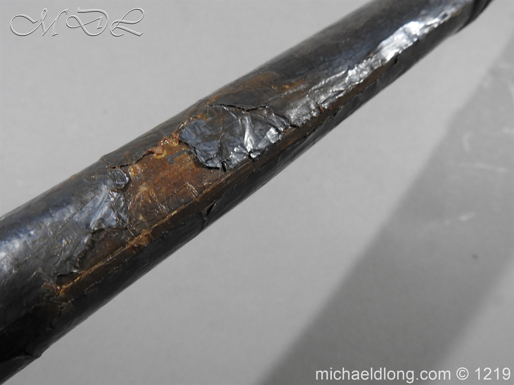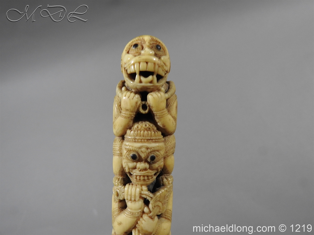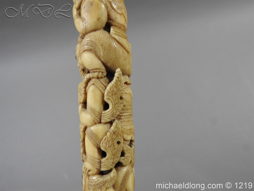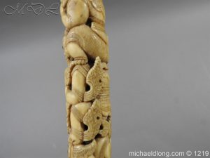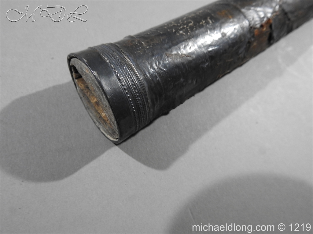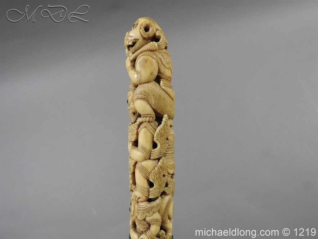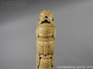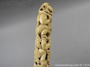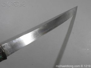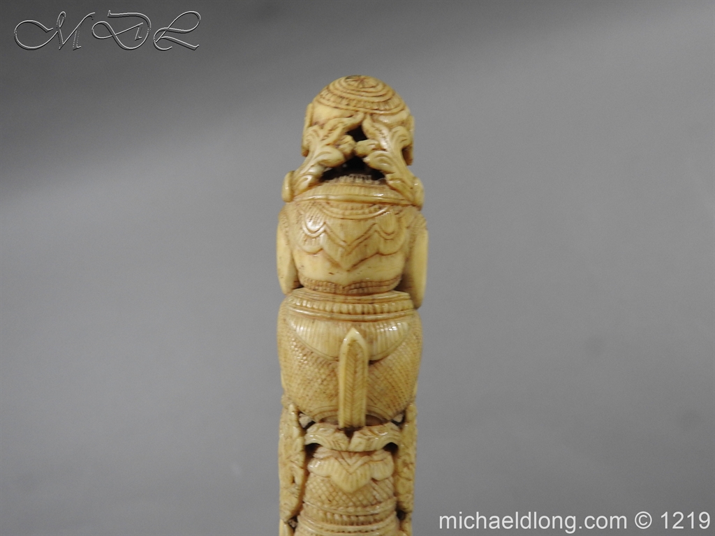Excellent example with the hilt being carved with figures and floral decoration to a very high standard. The lower level embossed with silver and enamel work leading to a high quality blade. The scabbard being wooded and covered in a silver wrap with super gold line decoration overall length 66cm blade 40cm
