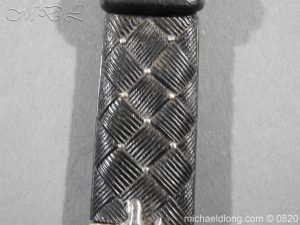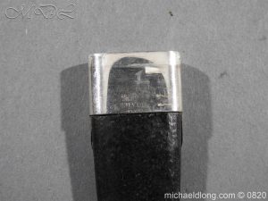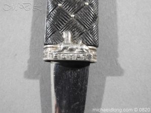 Cameron Highlanders Volunteer with Silver Mounts, black carved wood hilt with silver studs below pommel set with a dark amber Cairngorm stone. The scabbard scabbard leather-covered wood with silver fittings marked Silver
