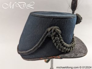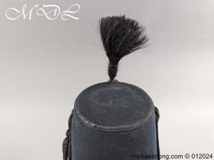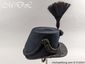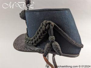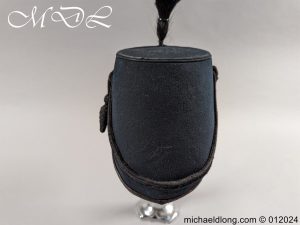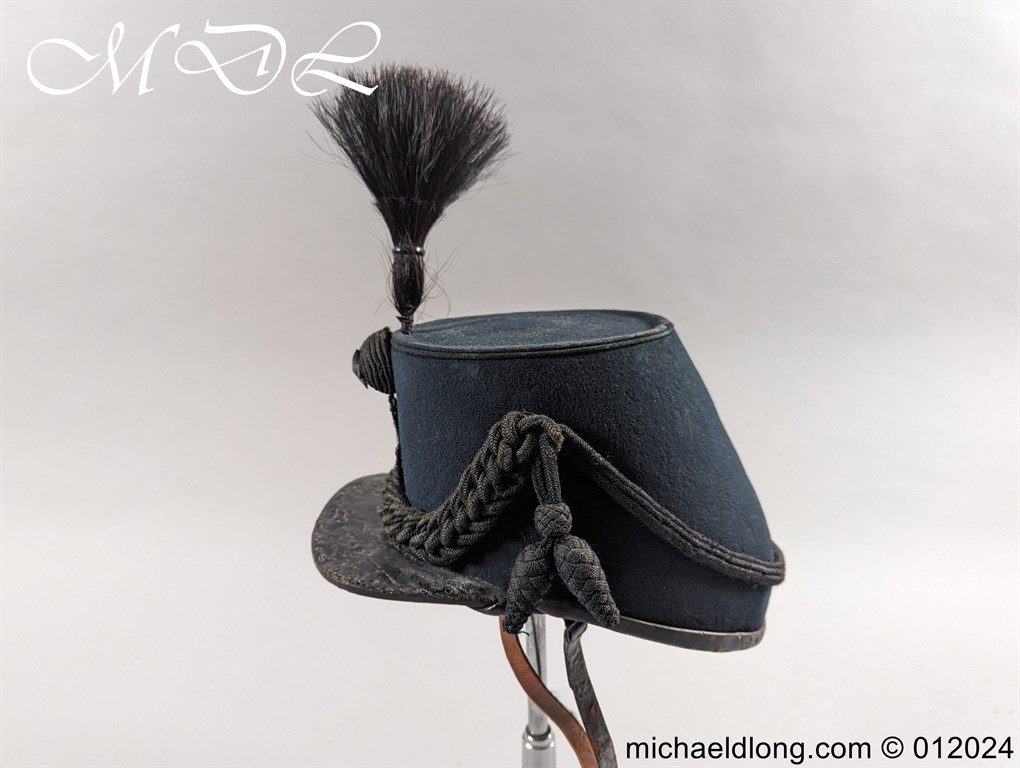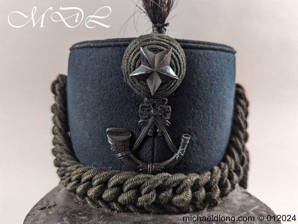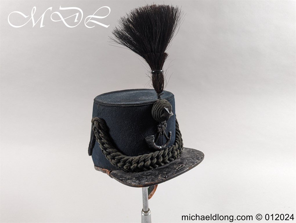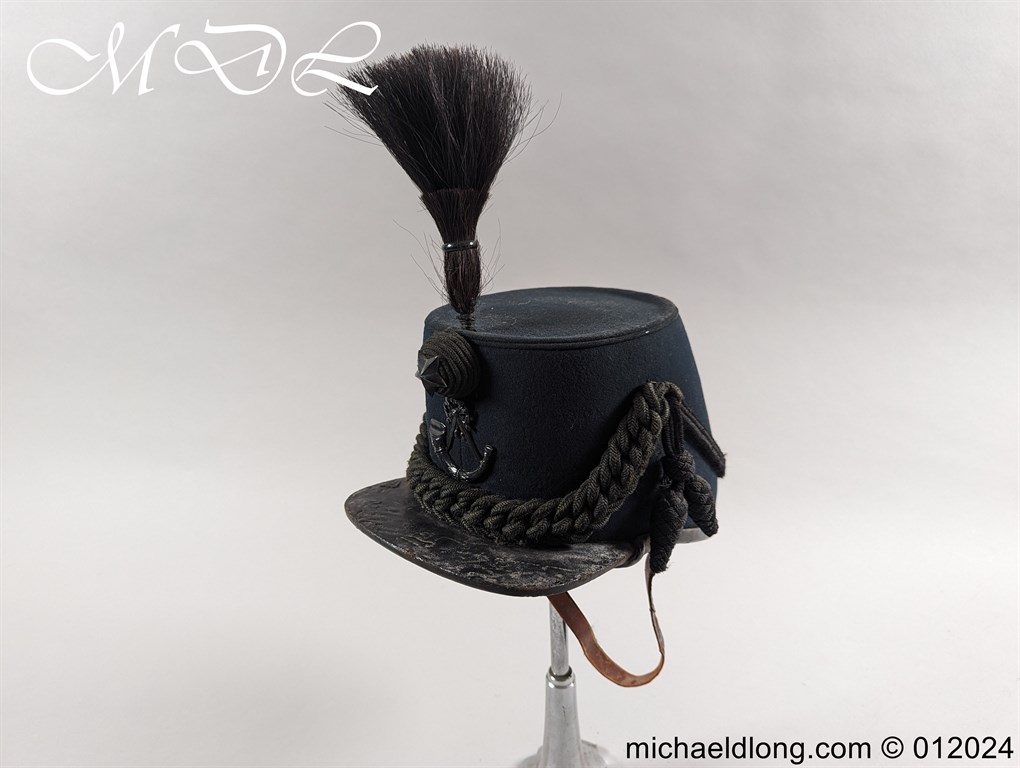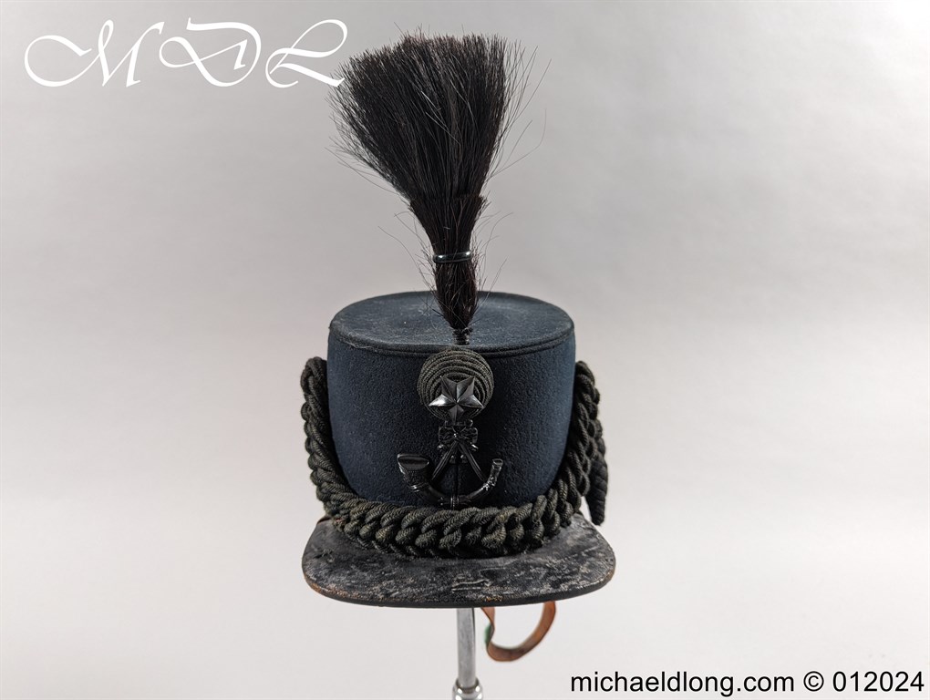 Cameronians Scottish rifles shako, made of fine dark green Melton cloth. To the front of the shako is a flat patent leather peak surmounted by dark green plaited cords. Black slung bugle with green cord rosette mounted with a star device complete with horse hair plume. Leather sweat bank, black fabric liner marked 7 SB and complete with leather chin strap