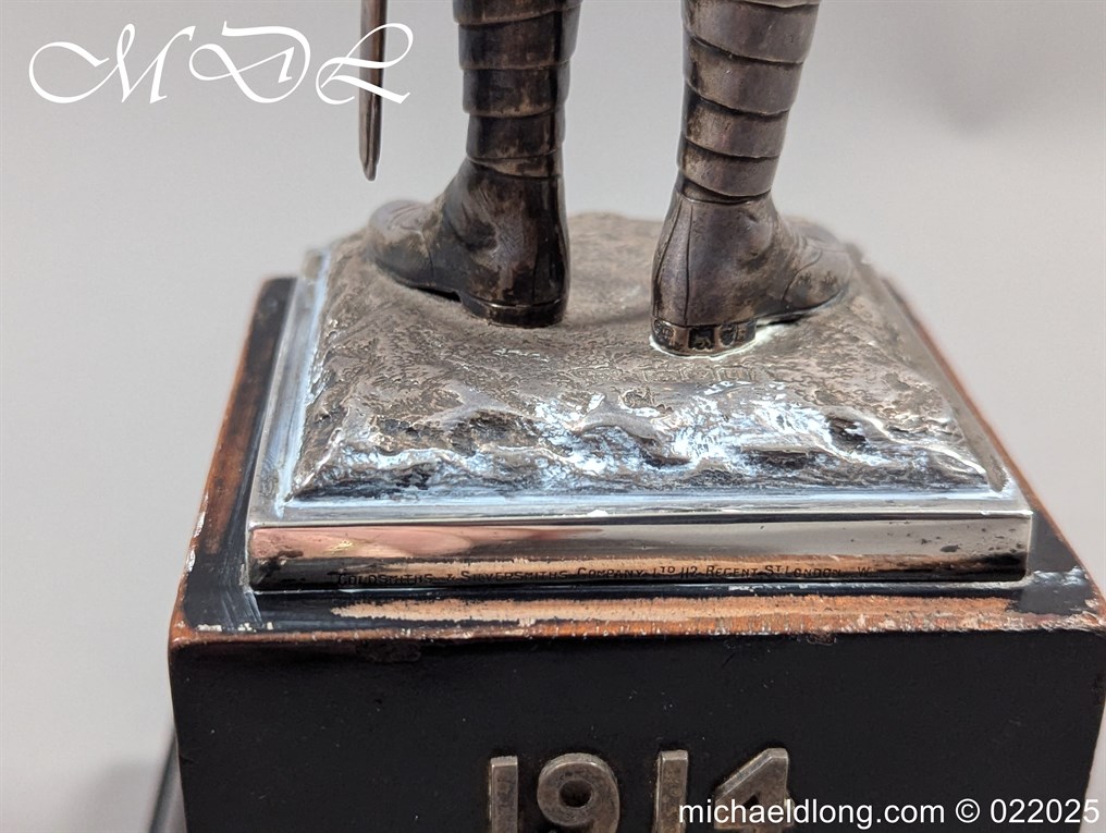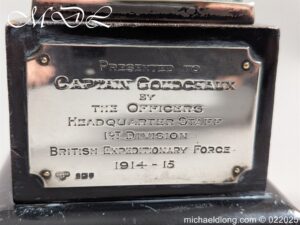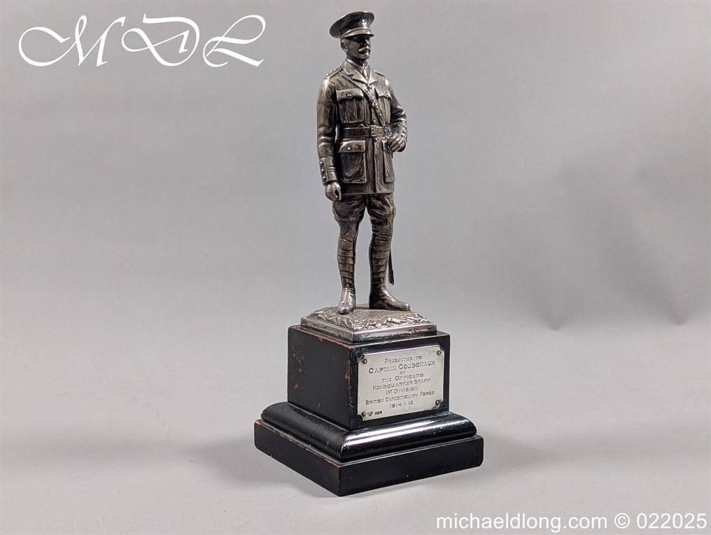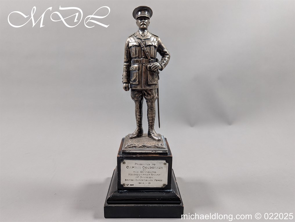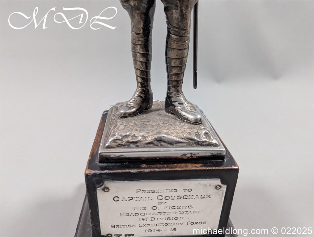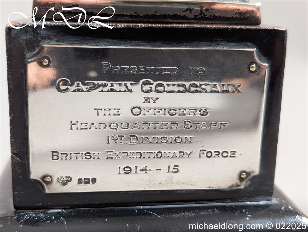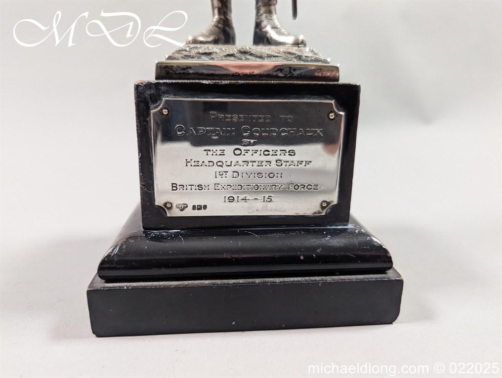 Captain Goudchaux Expedition Force 1914 Presentation Silver Statue both the plaque and statue are hallmarked the maker marked Goldsmith and Silversmiths Company Ltd Regent Street London. The presentation reads: Presented to Captain Goudchaux By The Officers Headquarter Staff 1st Division British Expeditionary Force 1914 – 1915 Super detail it stands 36cm in height on an ebony base.