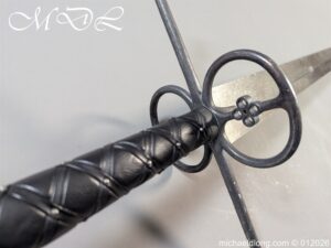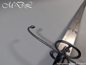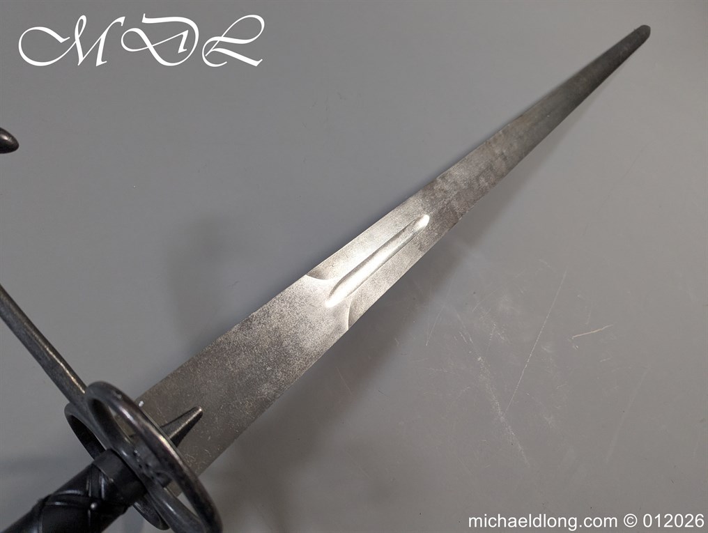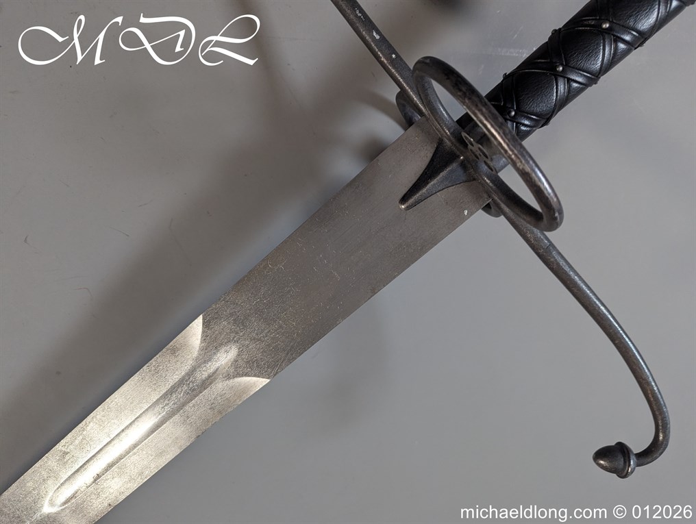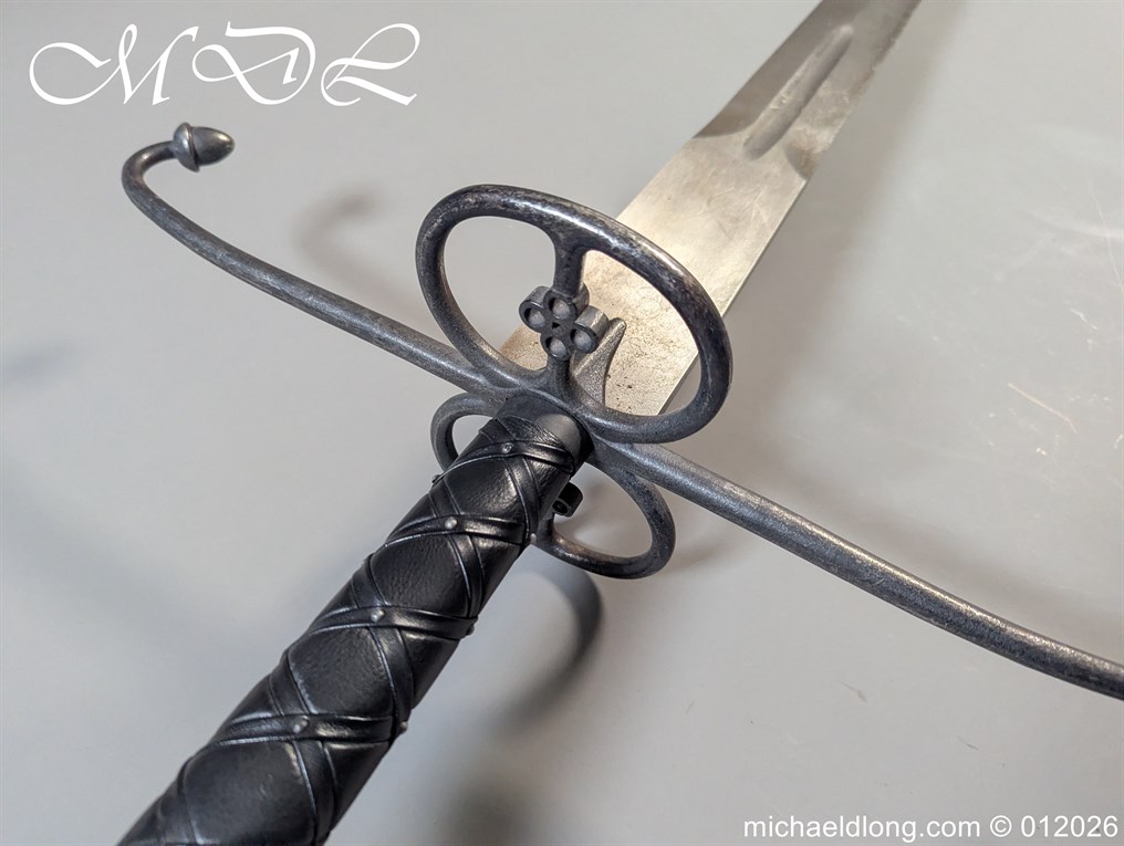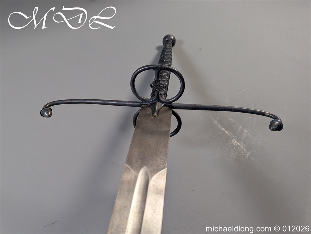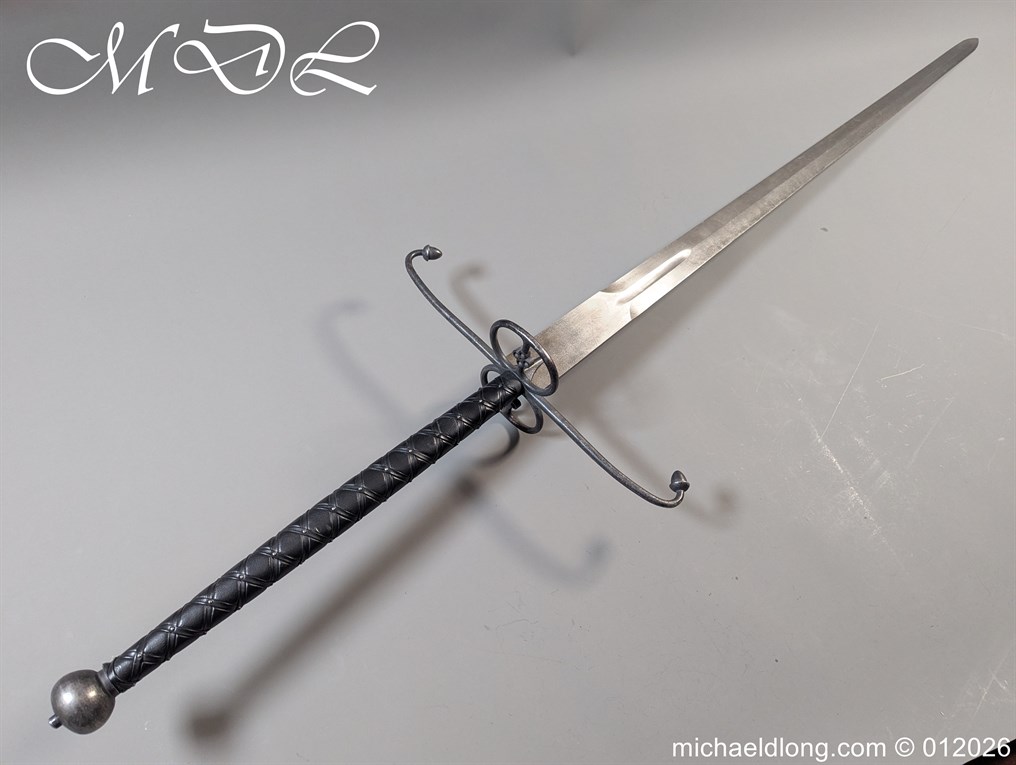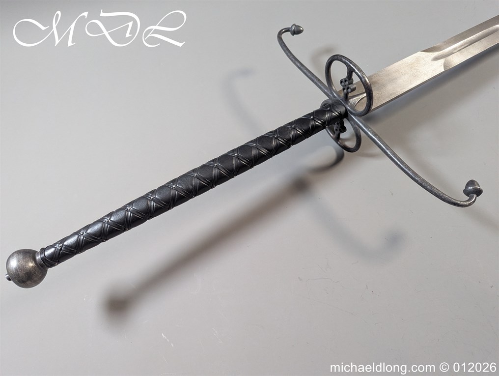 Reproduction Lowlander Sword it almost six feet long., beautifully proportioned, and balanced piece forged from 1566 high carbon steel, ensuring a tough blade that holds its edge remarkably well It is equipped with typical Scottish quatrefoils in the ring guards and leather covered grips with an overlaid leather binding all in new condition great display item. Due to the length free shipping to UK only the rest of the world would be at cost.