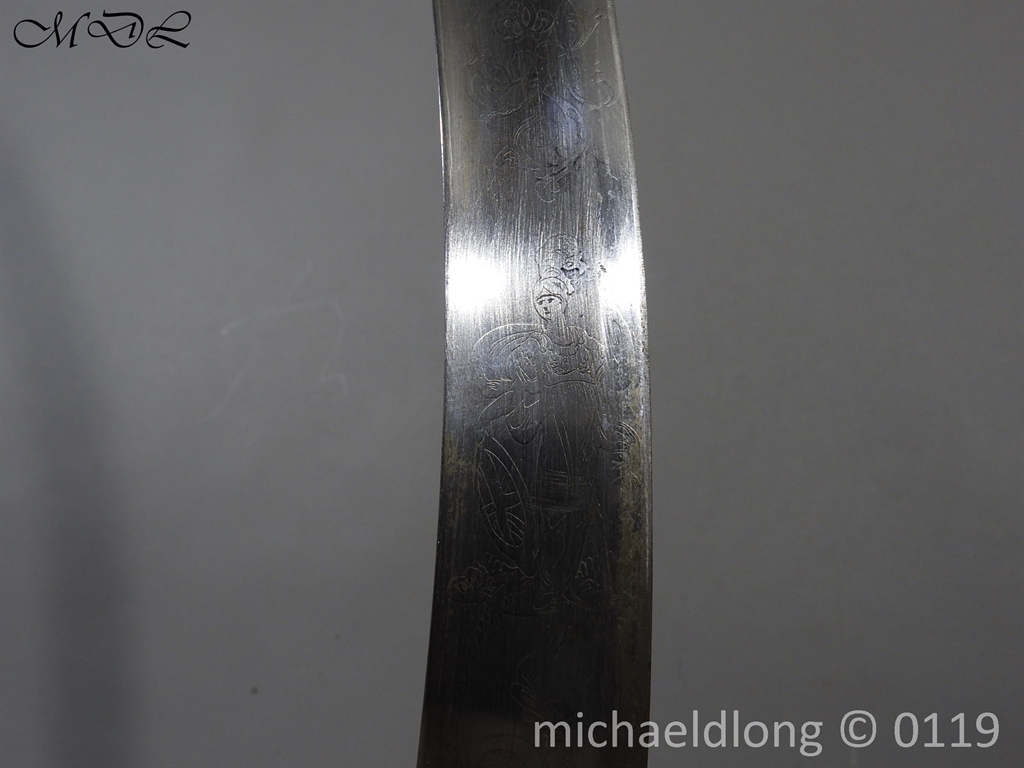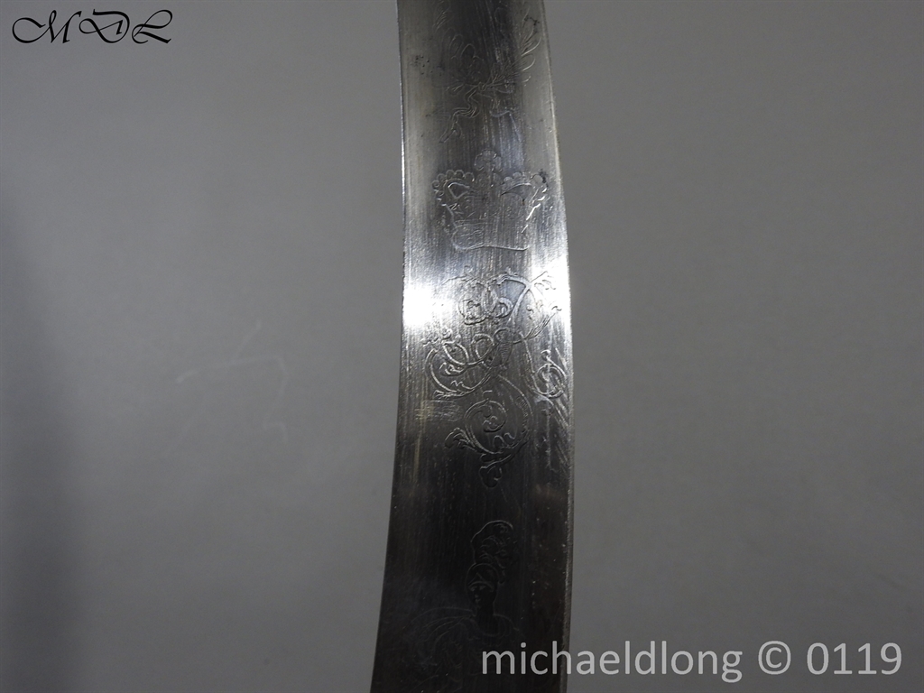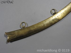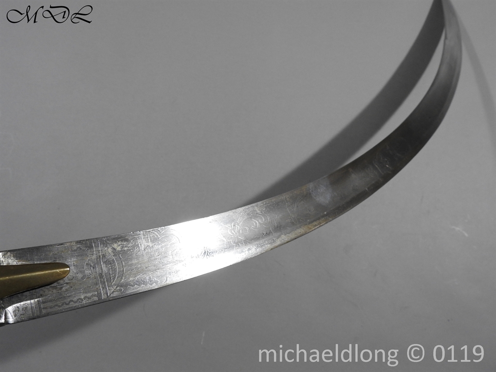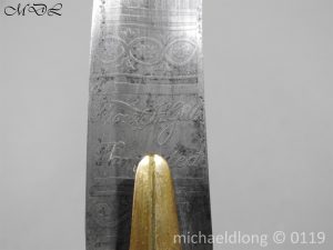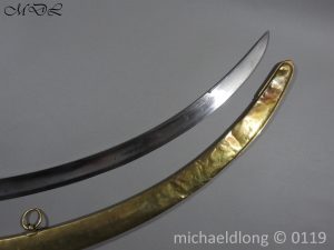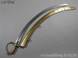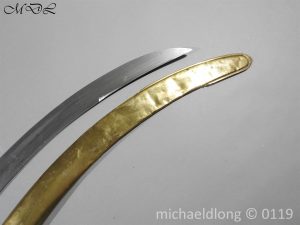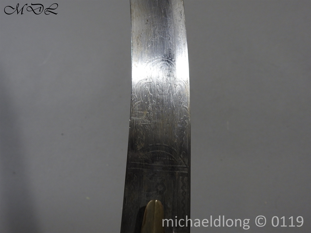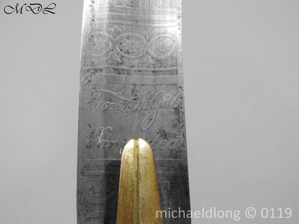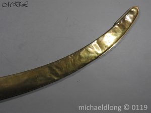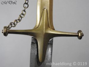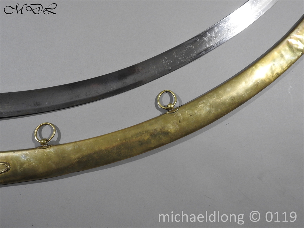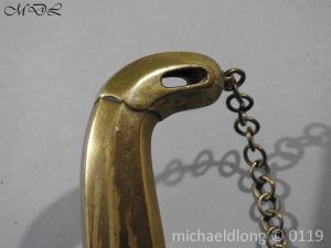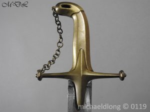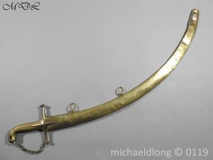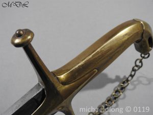 Coldstream Guards Georgian Officer’s Mameluke with brass gilt hilt in mameluke form with matching chain guard and pommel with slot to allow sword knot to be fitted. The excellent curved blade is engraved three quarters of it’e length with trophies of arms, GR and Crown, Royal Coat of Arms plus Coldstream Guard Regimental badge. Maker marked Tho Gills and Warranted, it is complete with matching brass scabbard.