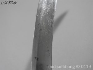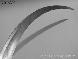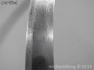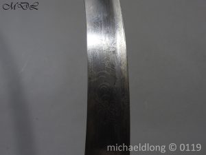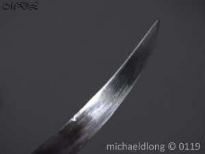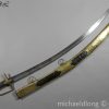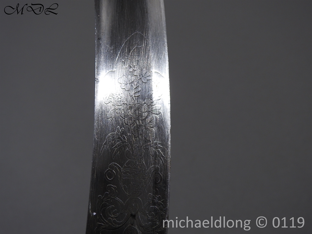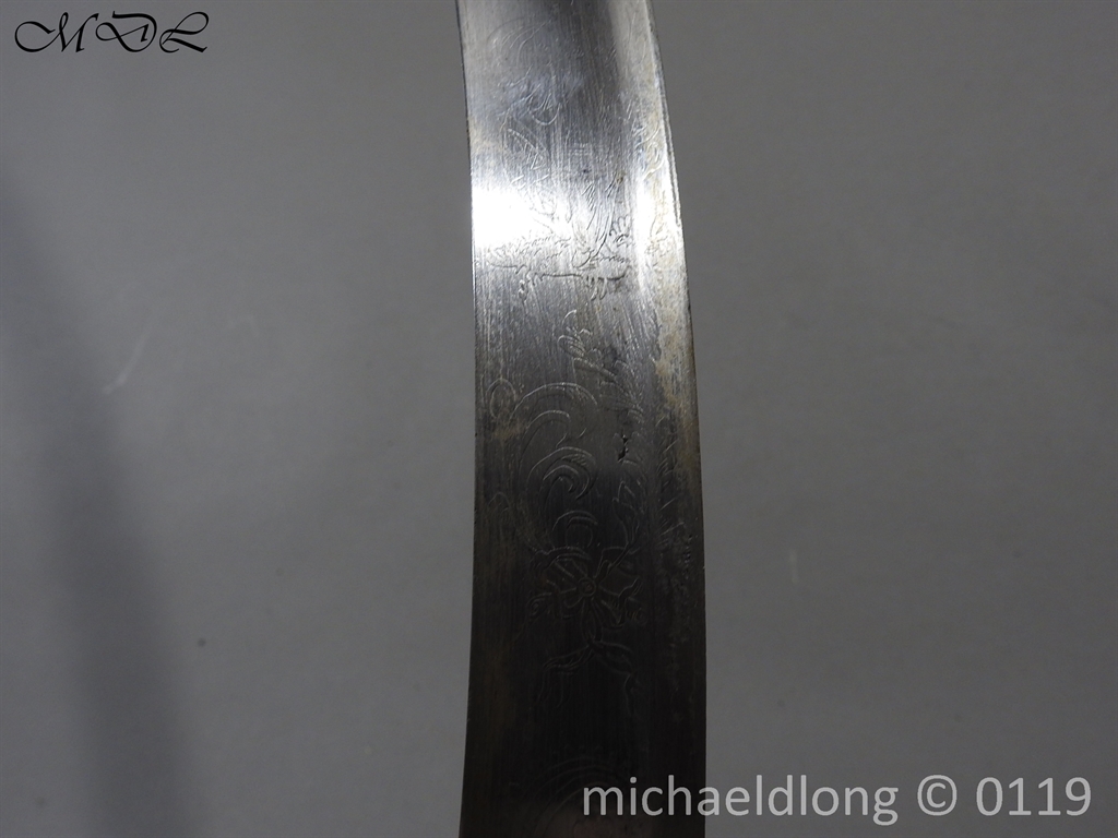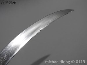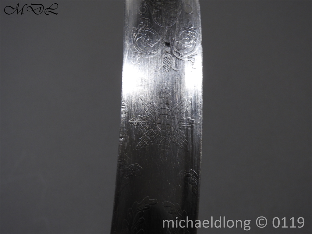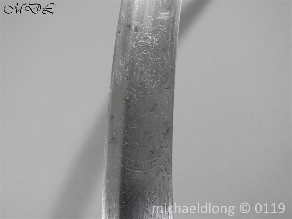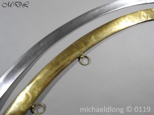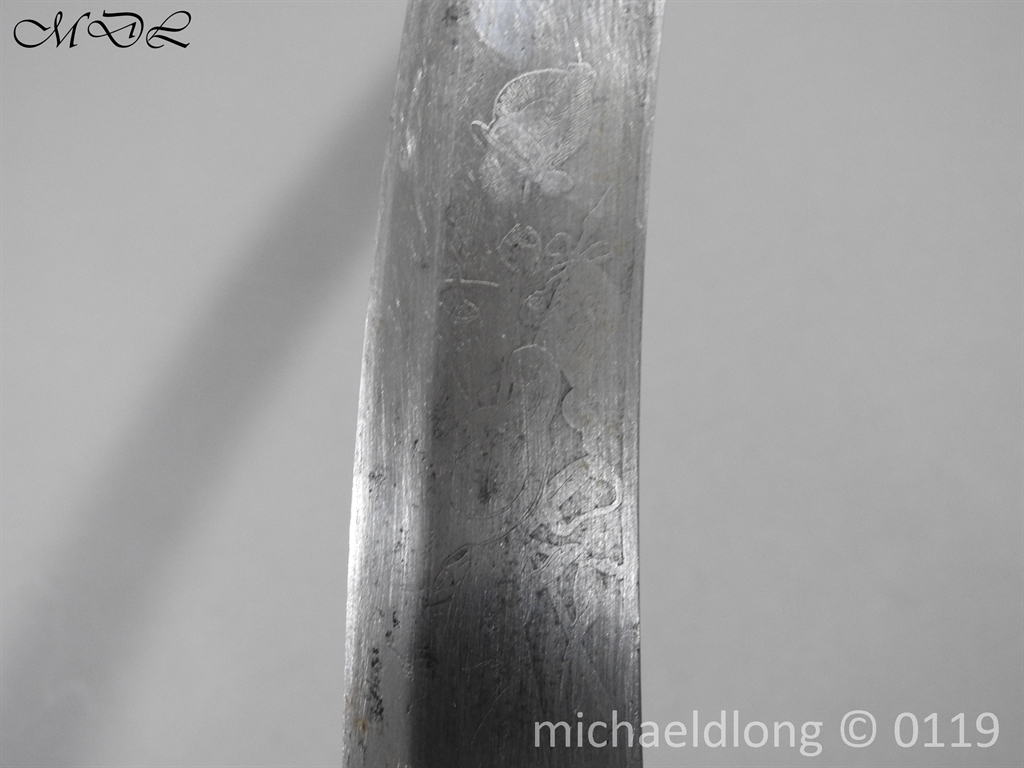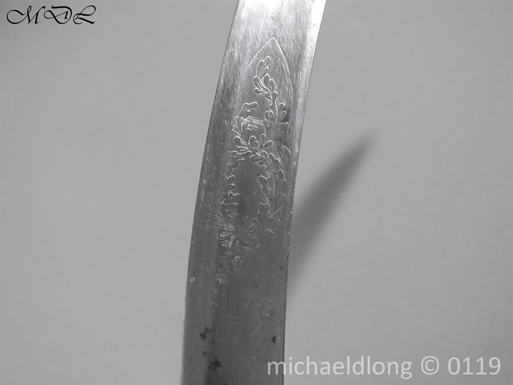 Coldstream Guards Georgian Officer’s Mameluke with brass gilt hilt in mameluke form with matching chain guard and pommel with slot to allow sword knot to be fitted. The excellent curved blade is engraved three quarters of it’e length with trophies of arms, GR and Crown, Royal Coat of Arms plus Coldstream Guard Regimental badge. Maker marked Tho Gills and Warranted, it is complete with matching brass scabbard.