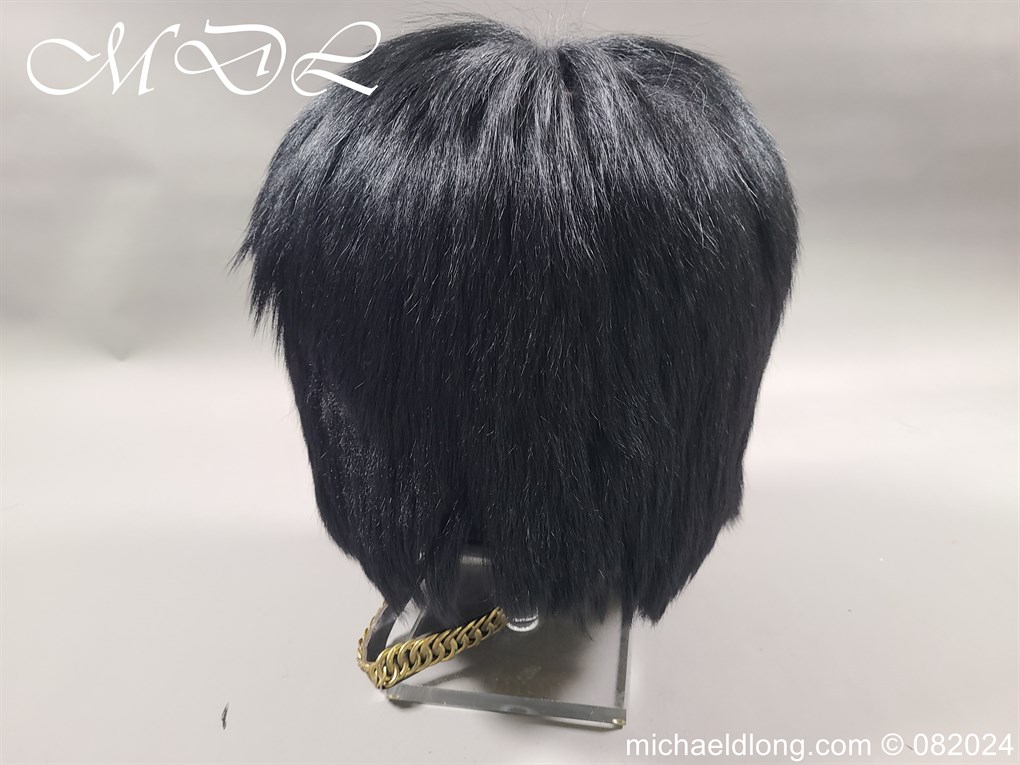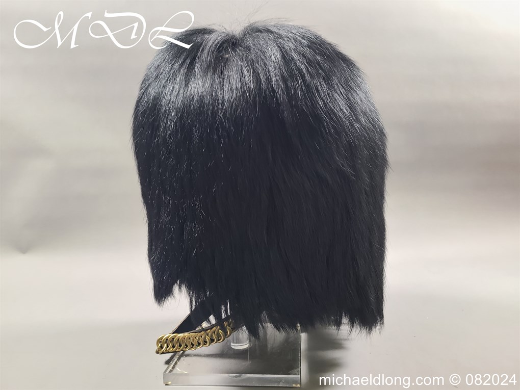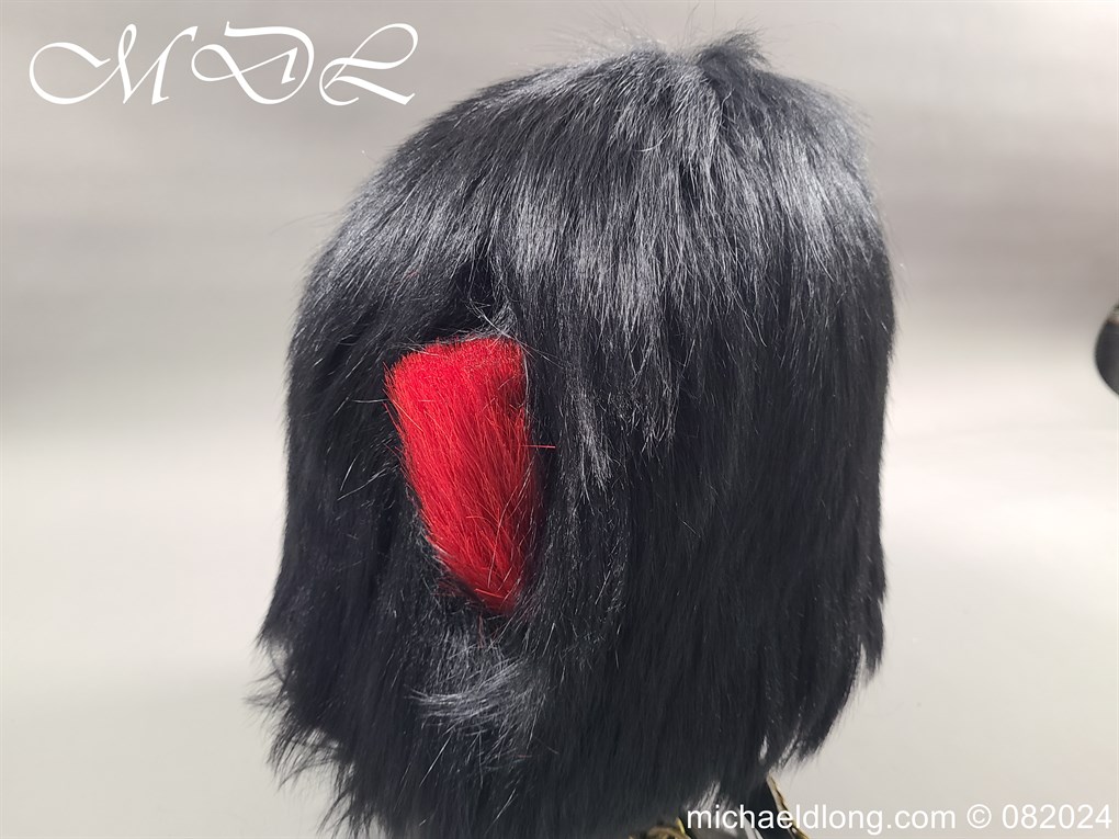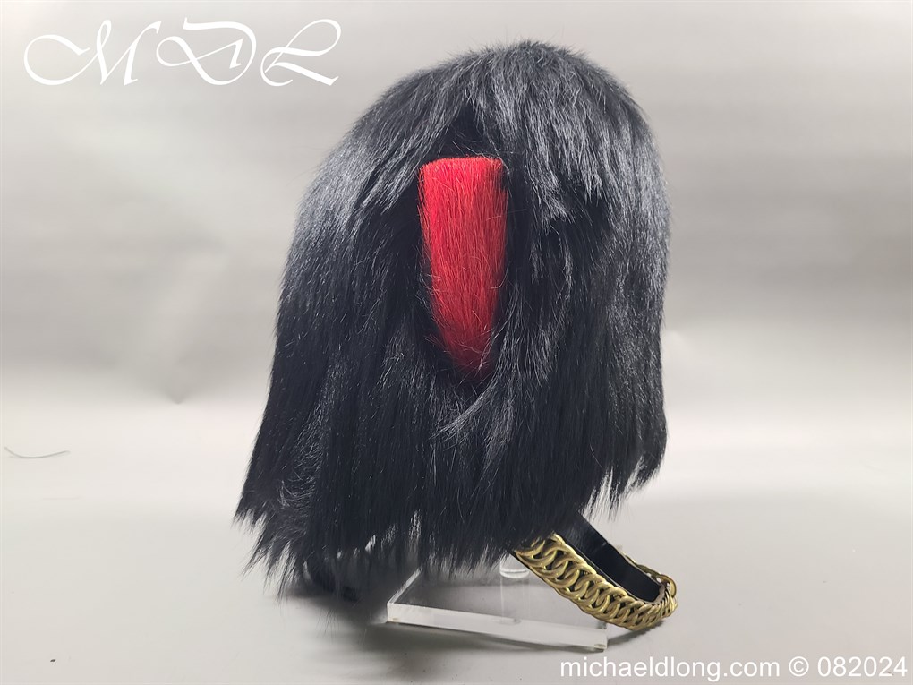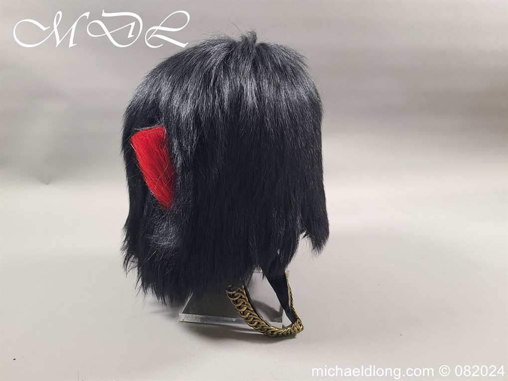 Coldstream Guards NCO Bearskin, good example and shape of the Guardsman issue with scarlet cut feather plume and graduated brass, leather backed chin chain. Leather sweat band and wicker frame to the interior plus makers label Burkholder Canada with size 7.25 and dates 1968