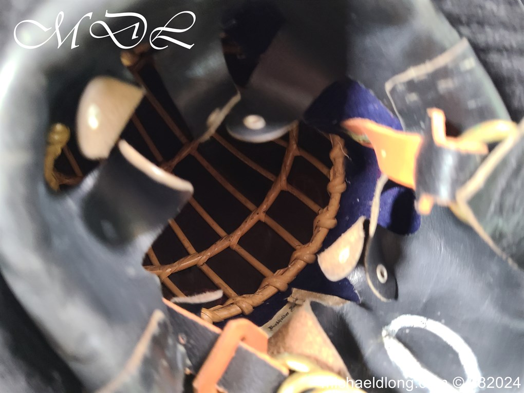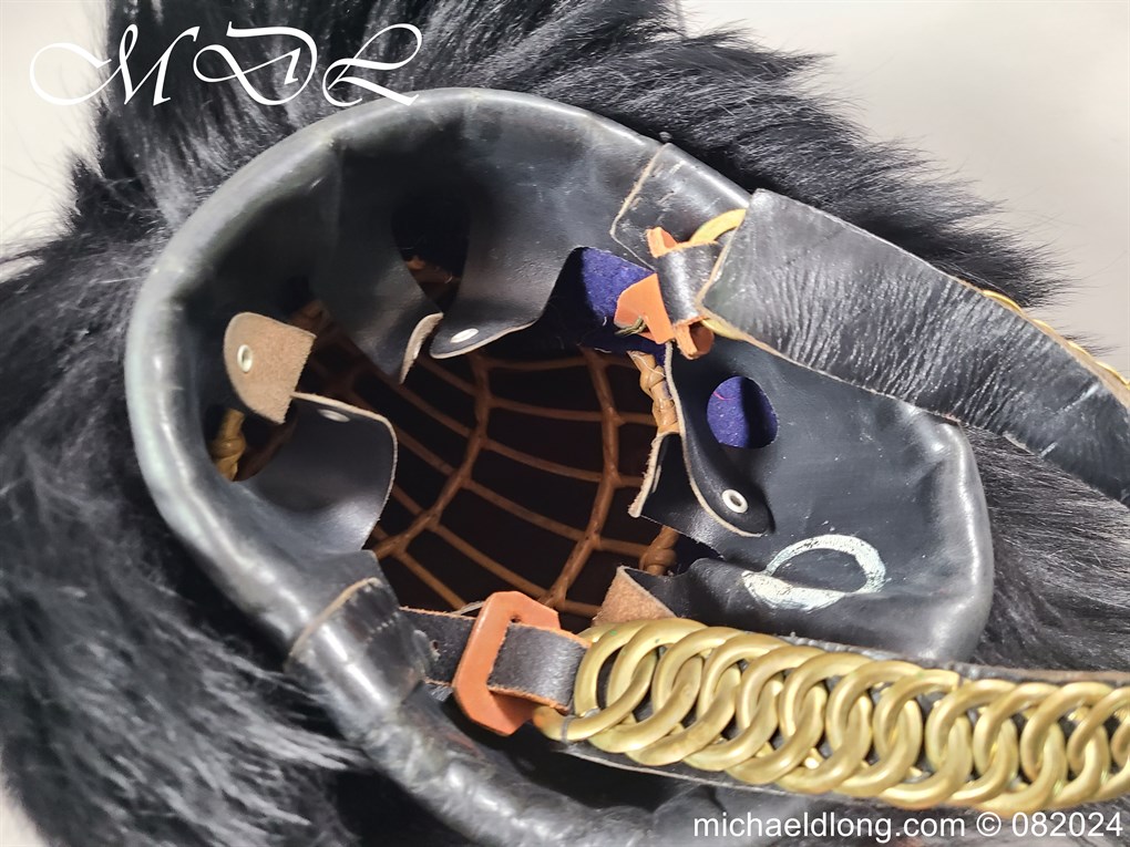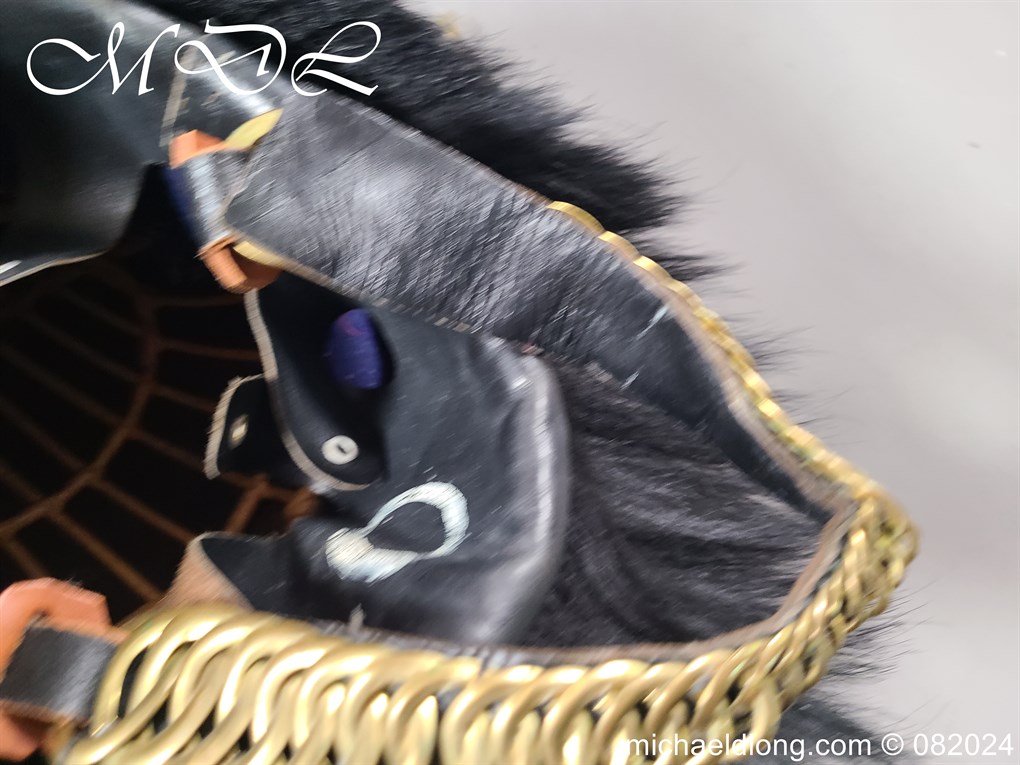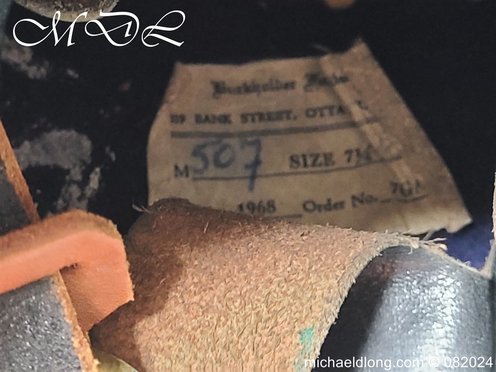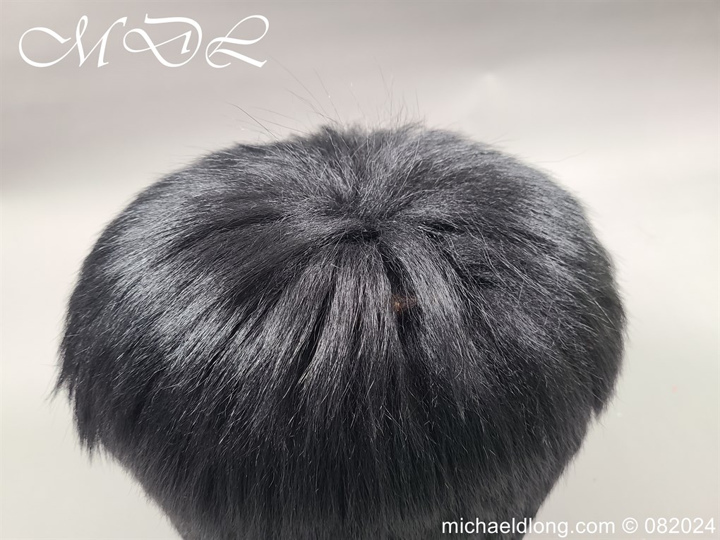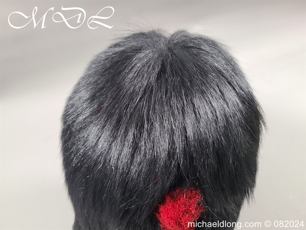 Coldstream Guards NCO Bearskin, good example and shape of the Guardsman issue with scarlet cut feather plume and graduated brass, leather backed chin chain. Leather sweat band and wicker frame to the interior plus makers label Burkholder Canada with size 7.25 and dates 1968