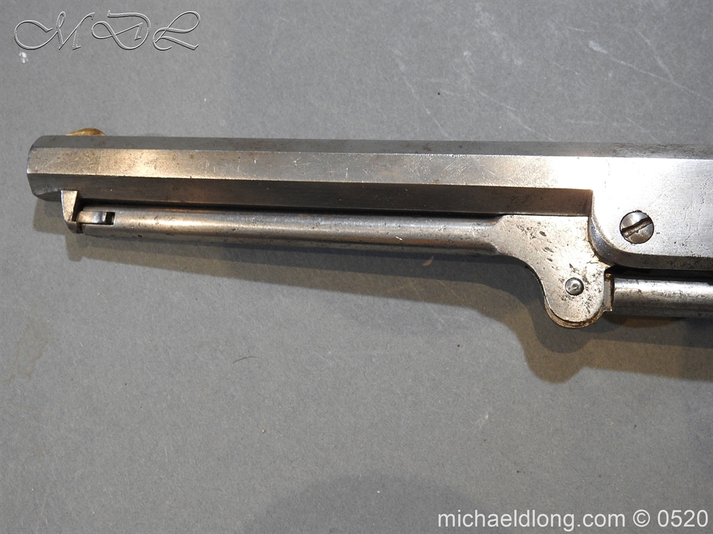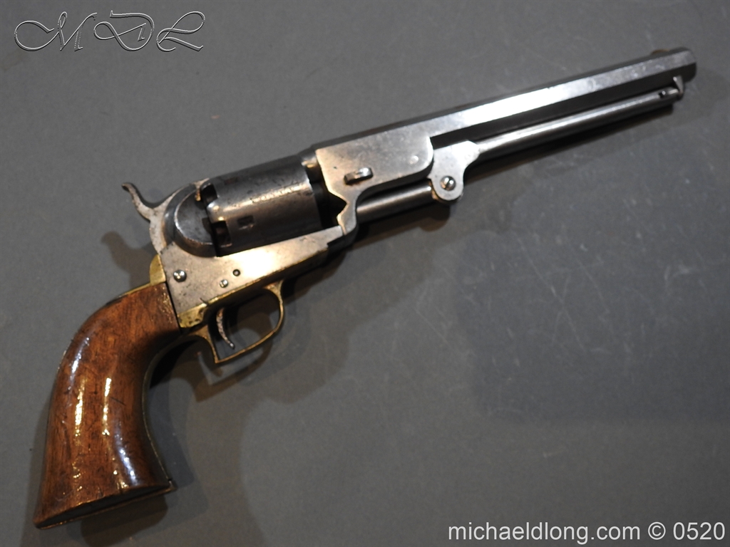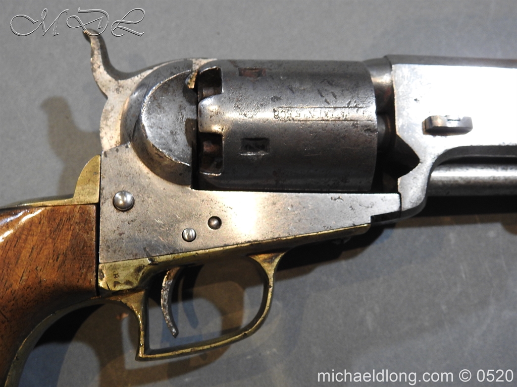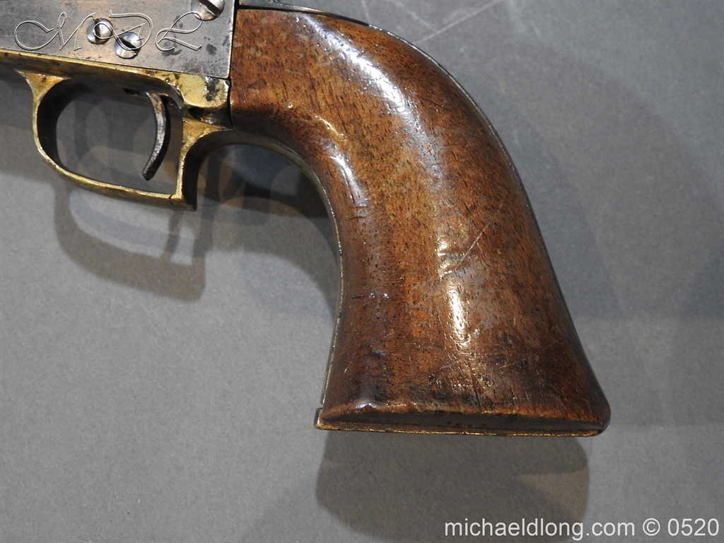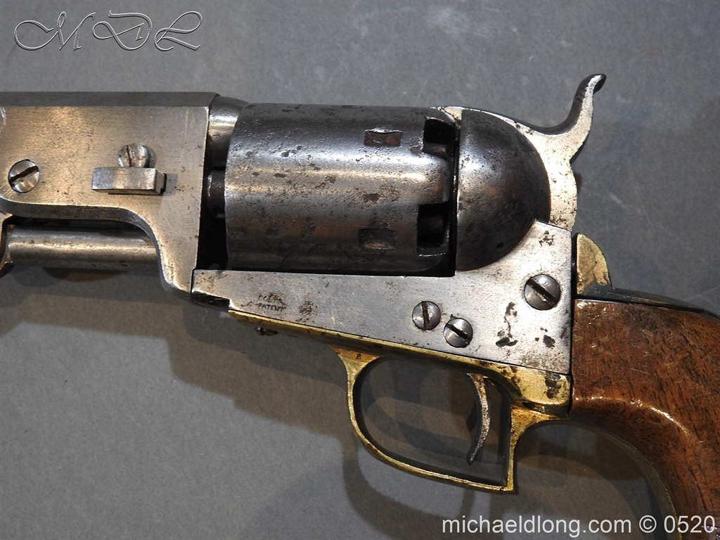 Colt Model 1851 Navy percussion revolver with desirable square back trigger guard, .36 cal., 7-1/2” octagon barrel, wood grips, serial number 3228 This gun is in overall good condition showing a grey patina on metal surfaces with scattered areas of erosion, cylinder shows Colt Pat No 5508 action in good working order