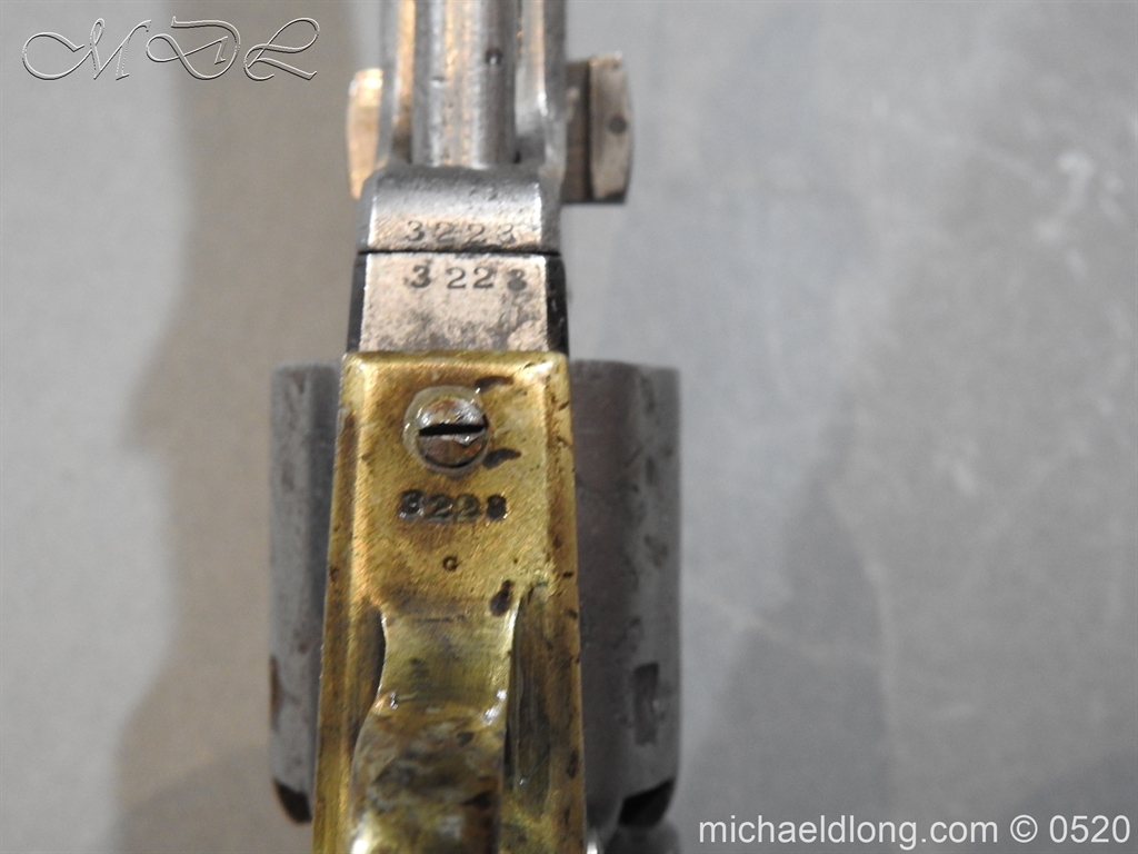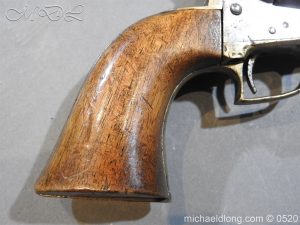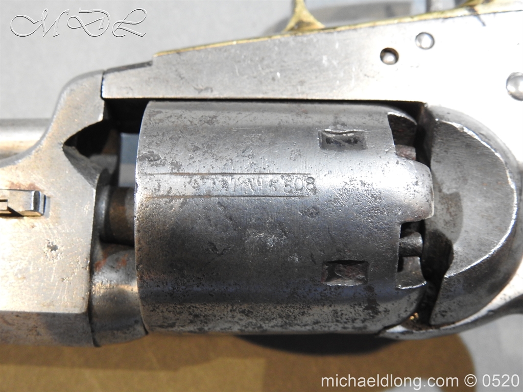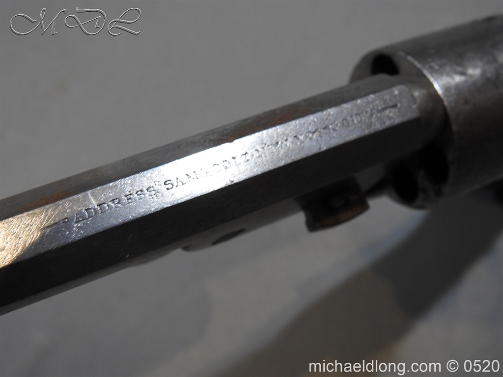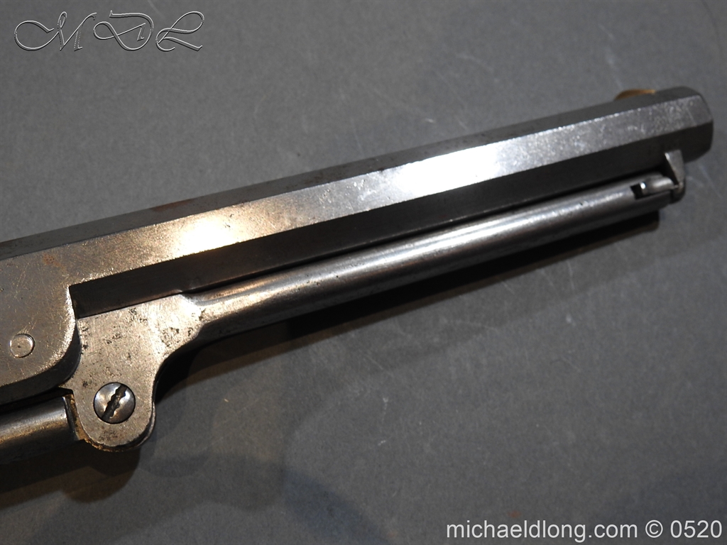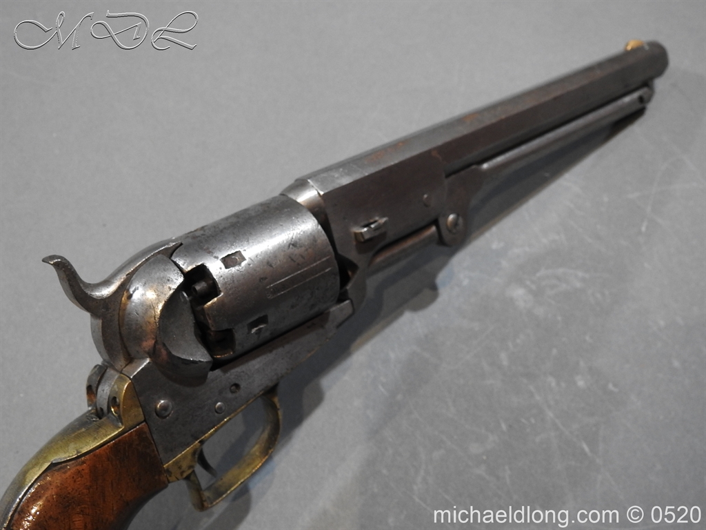 Colt Model 1851 Navy percussion revolver with desirable square back trigger guard, .36 cal., 7-1/2” octagon barrel, wood grips, serial number 3228 This gun is in overall good condition showing a grey patina on metal surfaces with scattered areas of erosion, cylinder shows Colt Pat No 5508 action in good working order