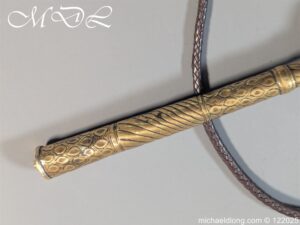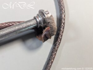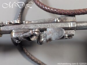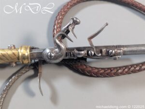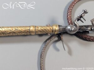 Continental 17th Century Horse Whip Flintlock Pistol with two stage barrel leading to a decorative enlarged muzzle to which the leather plaited whip is attached, please note this is a later replacement. The exposed flintlock action is in working order and is engraved with the word TONTAINE. The grip is brass with floral and line decoration which reduces in diameter towards the flintlock action, overall length 21.75 inch For reference please see Firearms Curiosa by Lewis Winant.