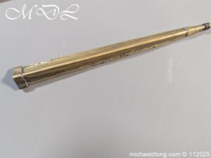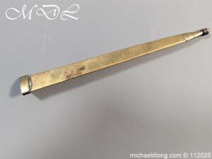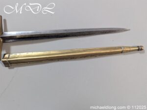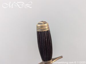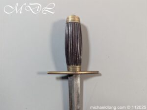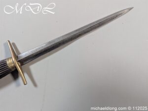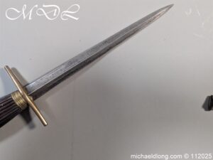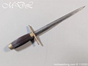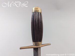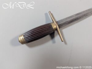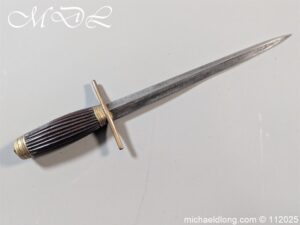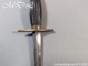 Continental 18th Century Dirk possibly French, fluted ebony grip with brass mounts. Short straight cross guard with triangular fighting blade and fitted matching decorative scabbard. Overall length 12.5 inch the blade 9 inch