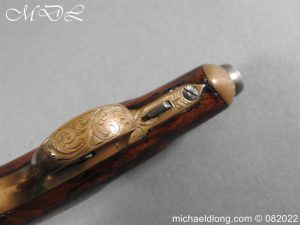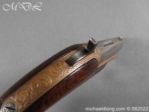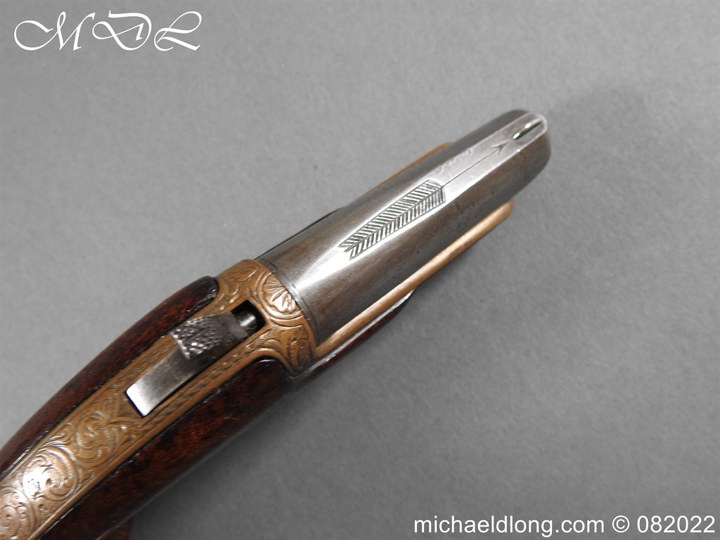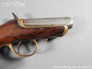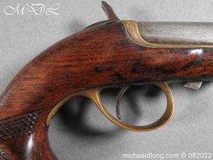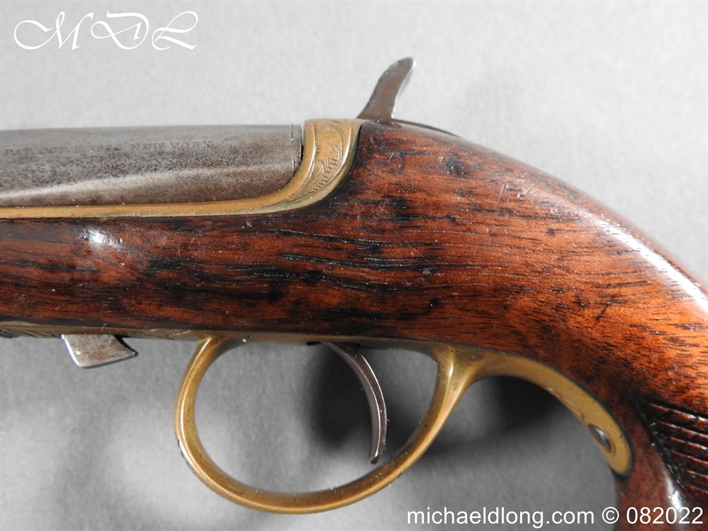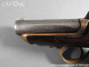 D. Williamson single Shot .41 cal Derringer 19th century single shot breech loading derringer pistol, made to accept either a .41 Rim-fire cartridge or you were able to insert a metal tube that was fitted with a percussion nipple at the rear should you not have rim-fire ammunition Engraved on the side of barrel with Williamson’s Patent October 2. 1866 New York. Chequered walnut butt fitted with an engraved brass trigger guard and matching brass back strap. Barrel slides forward for loading. Barrel length 2.5″ please note this items is sold as antique collectors item and no licence required within the United Kingdom