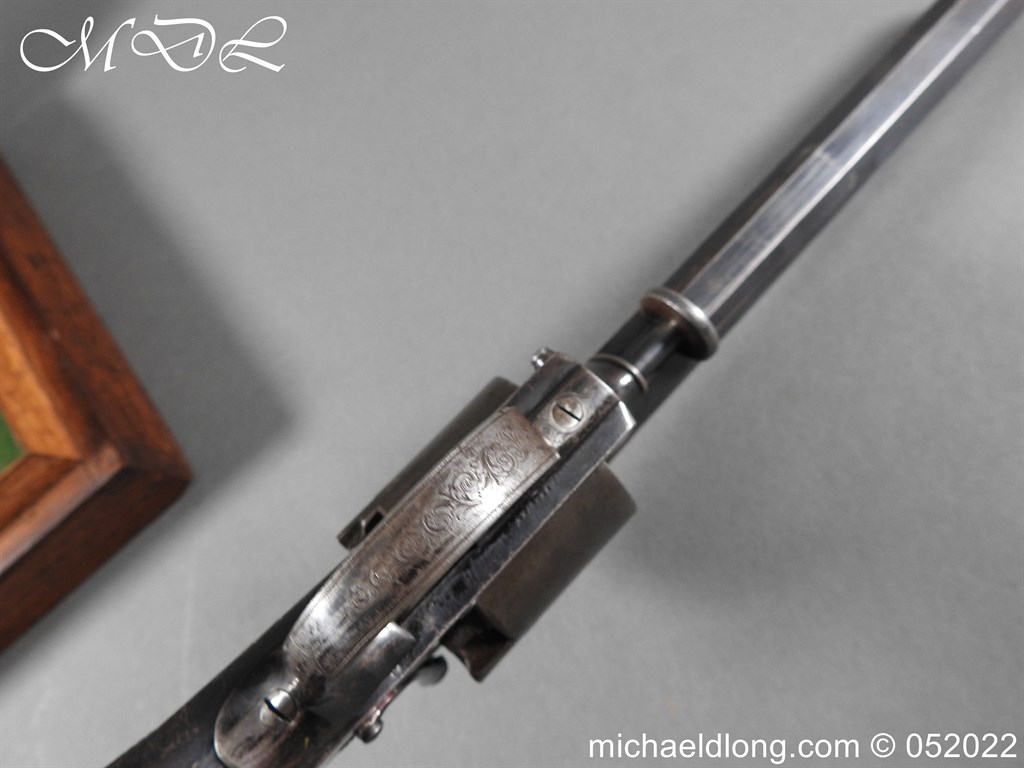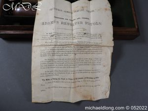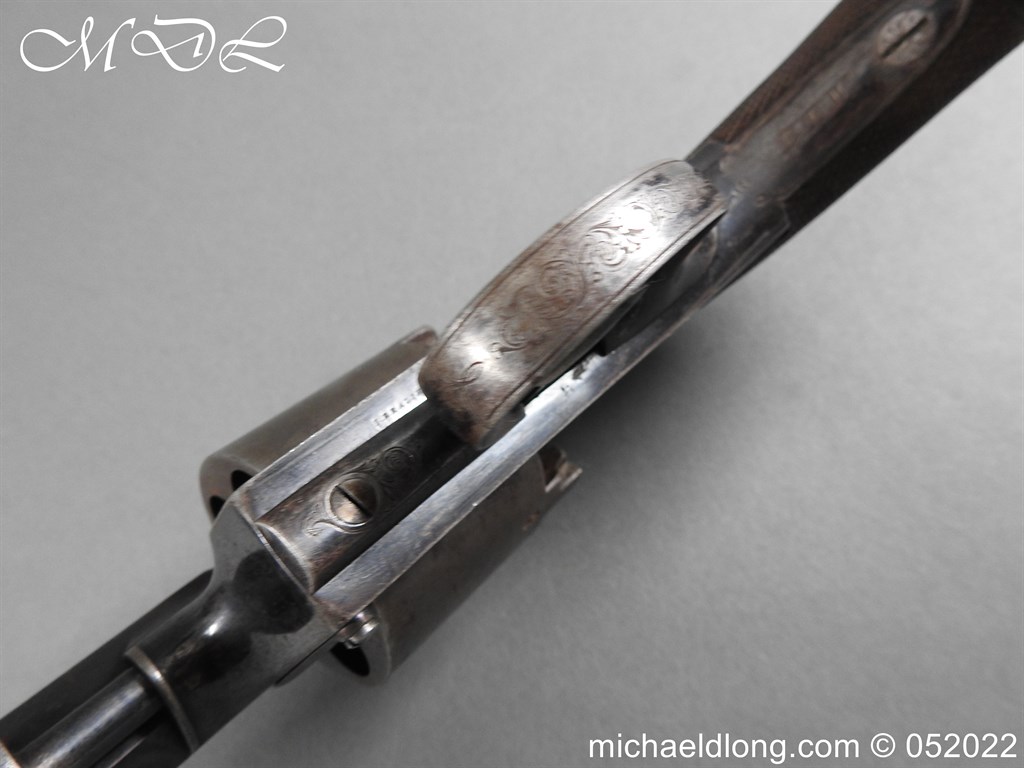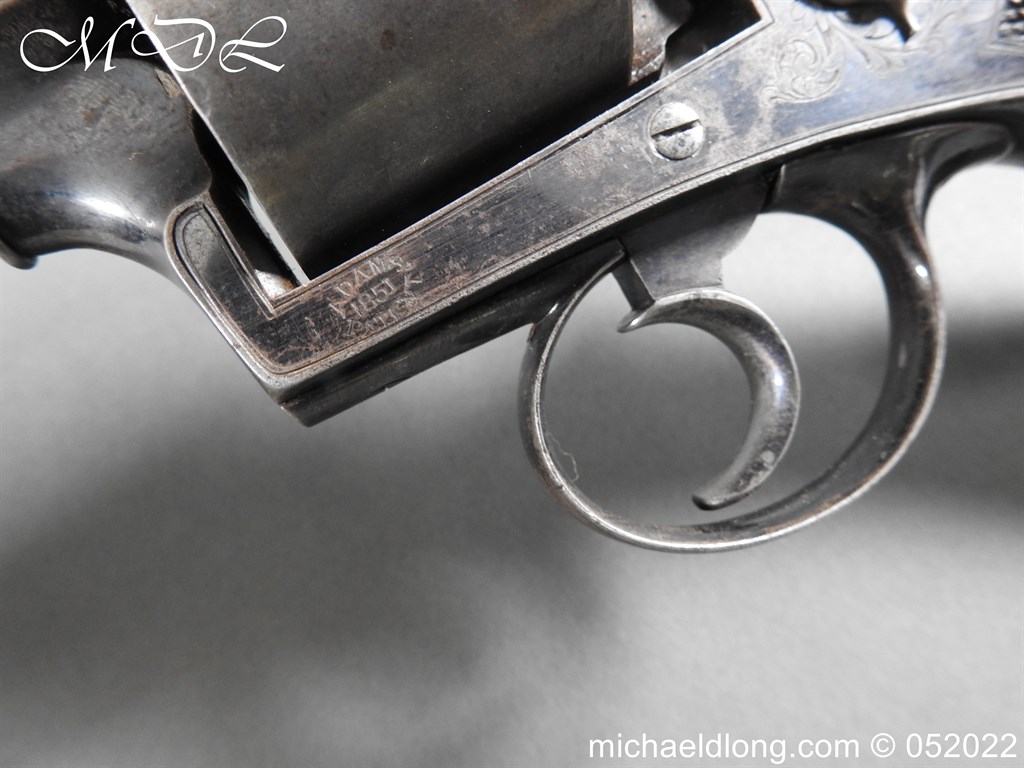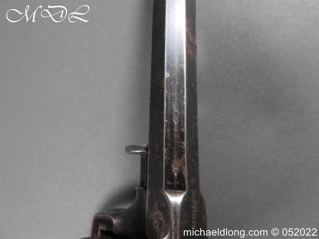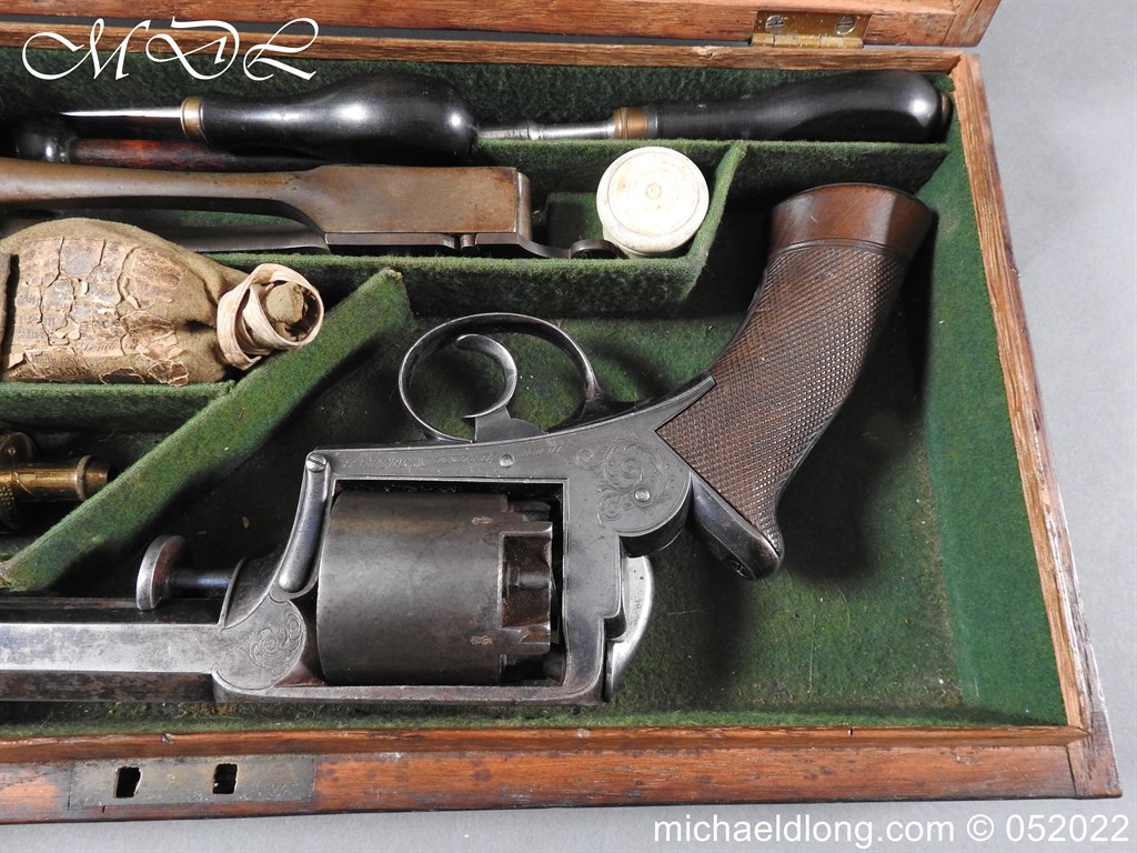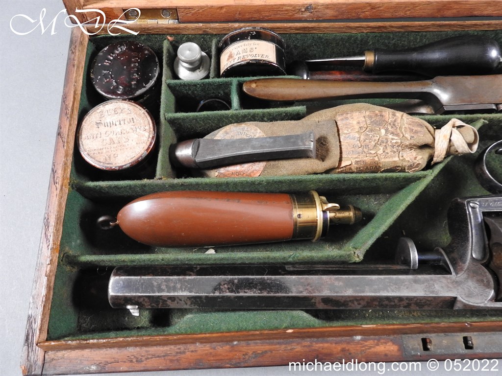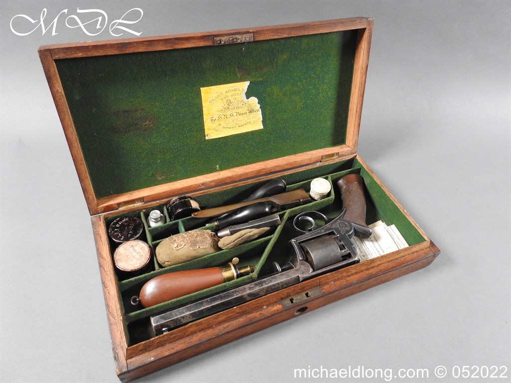 Dean Adams 1851 Dragoon Percussion Revolver Retailed by Wm & Jon Rigby Dublin 38 bore self cocking with blued octagonal sighted barrel engraved with retails name and address in full along the blued top-strap, case-hardened cylinder, blued border engraved frame decorated with foliate scrollwork on each side, blued safety-stop, arbor pin and catch, blued foliate scroll engraved trigger-guard and ovoidal butt-cap, the latter with hinged butt-trap cover engraved with a scallop shell, and chequered figured rounded butt, good colour finish with some age wear: in original lined and fitted oak case with all accessories including brass bullet mould stamped Adams and Dixon & Sons powder-flask in super condition. Also included are the Directions for loading and cleaning Adams Revolver Pistols and Eley Waterproof Caps advert. The interior of the lid with yellow maker’s label damaged, the exterior with circular brass escutcheon all in very good condition please note what I assume are the owners initial to the rear of the trigger guard.