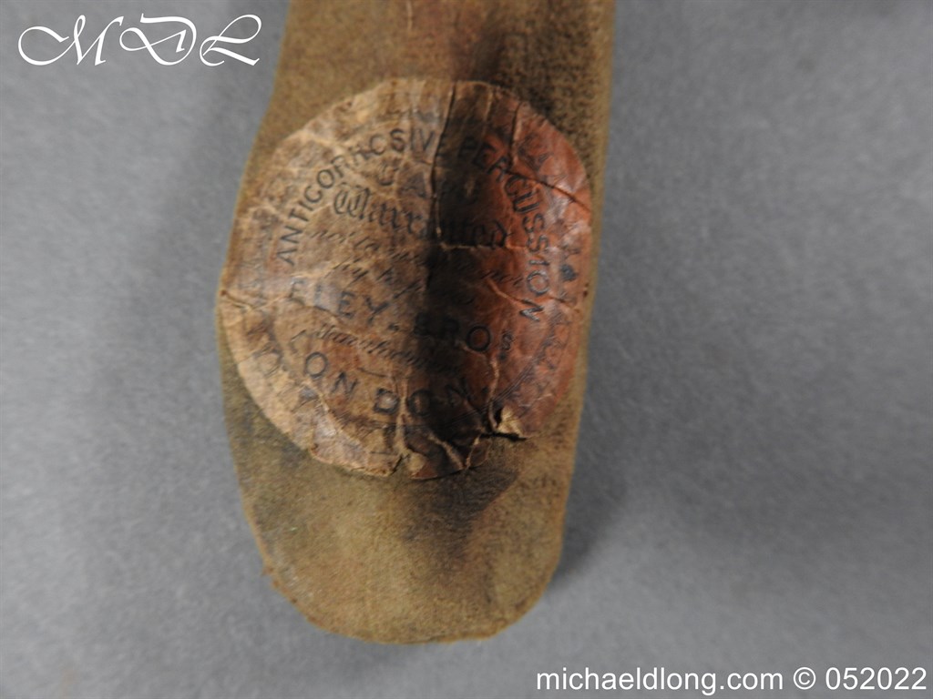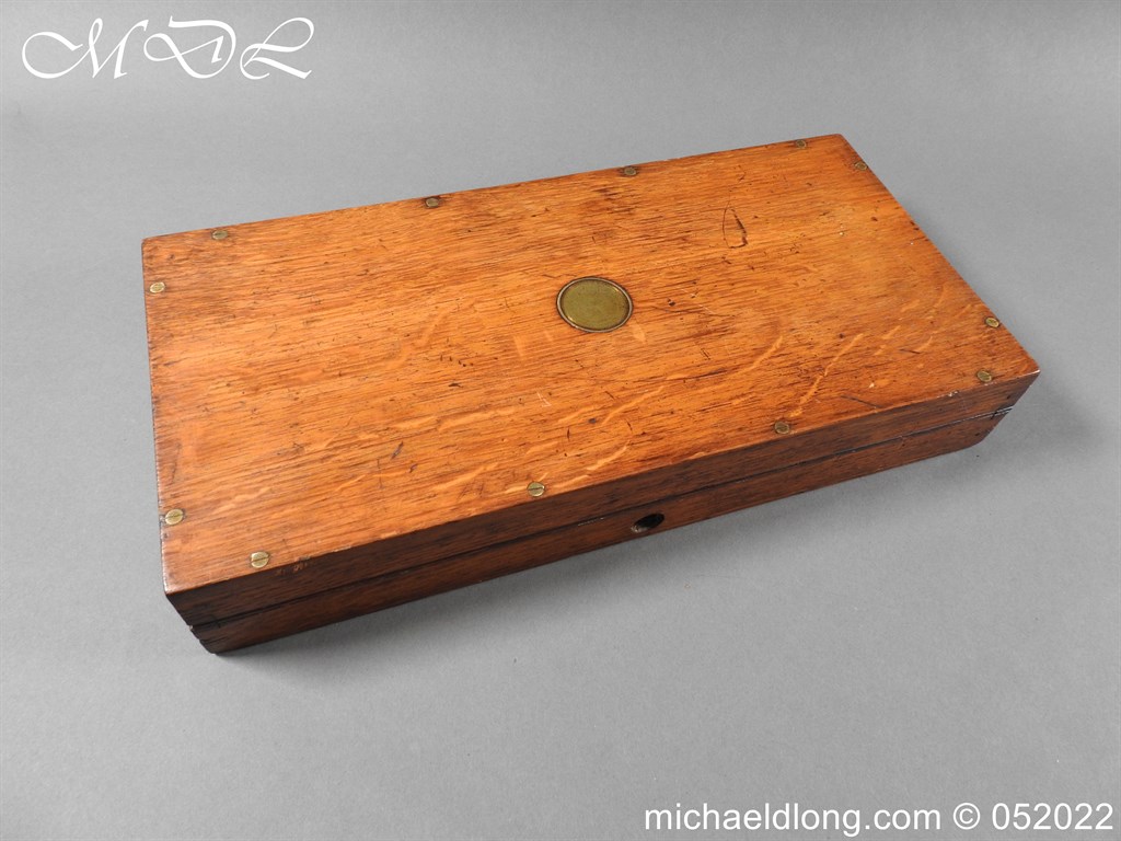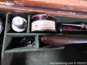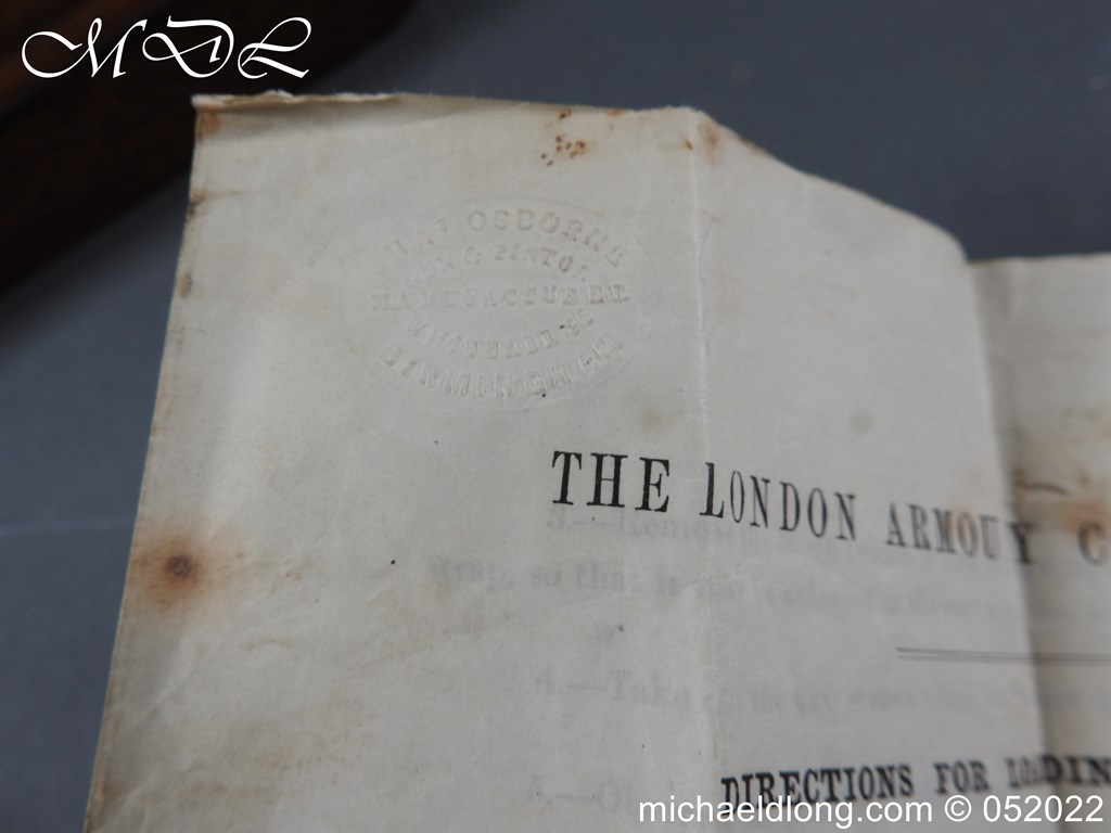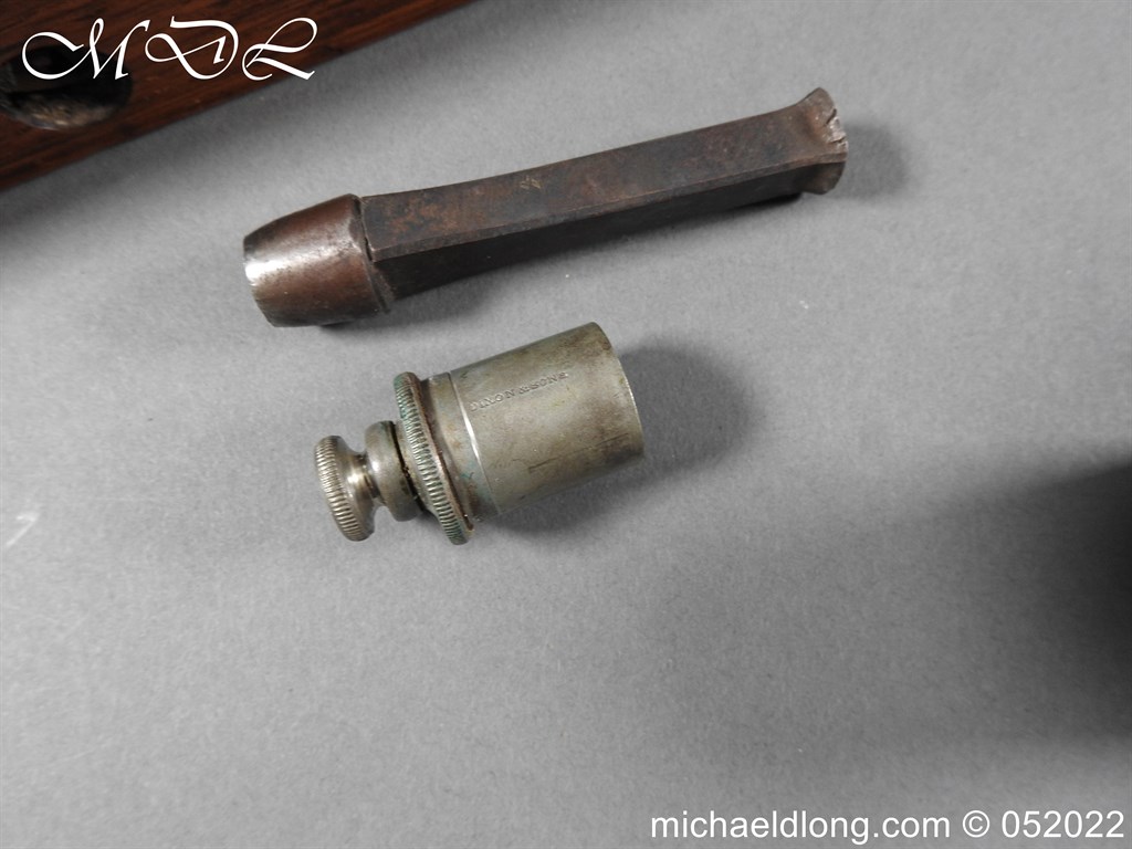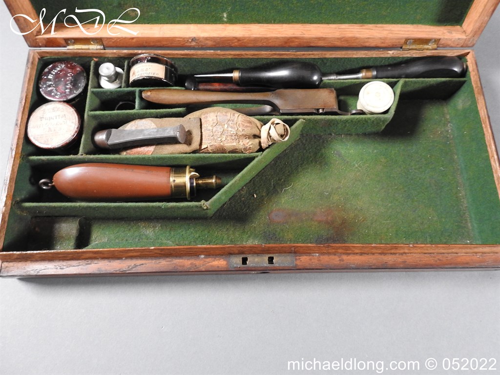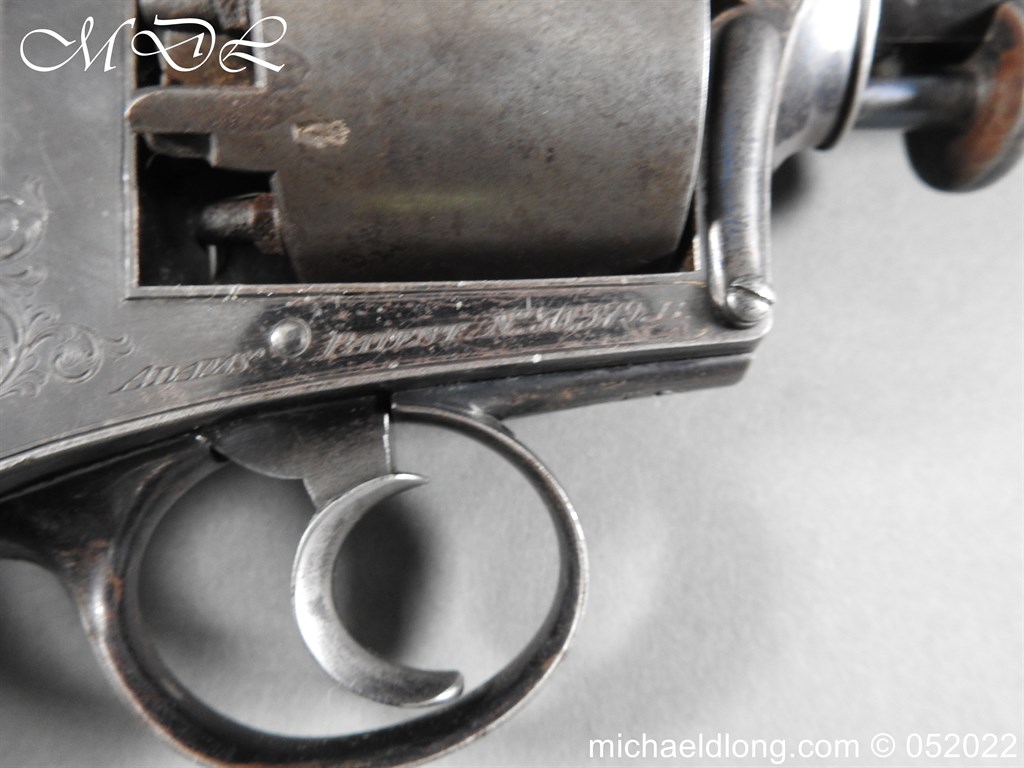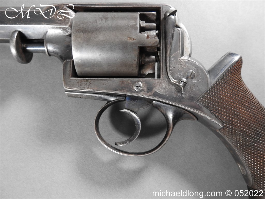 Dean Adams 1851 Dragoon Percussion Revolver Retailed by Wm & Jon Rigby Dublin 38 bore self cocking with blued octagonal sighted barrel engraved with retails name and address in full along the blued top-strap, case-hardened cylinder, blued border engraved frame decorated with foliate scrollwork on each side, blued safety-stop, arbor pin and catch, blued foliate scroll engraved trigger-guard and ovoidal butt-cap, the latter with hinged butt-trap cover engraved with a scallop shell, and chequered figured rounded butt, good colour finish with some age wear: in original lined and fitted oak case with all accessories including brass bullet mould stamped Adams and Dixon & Sons powder-flask in super condition. Also included are the Directions for loading and cleaning Adams Revolver Pistols and Eley Waterproof Caps advert. The interior of the lid with yellow maker’s label damaged, the exterior with circular brass escutcheon all in very good condition please note what I assume are the owners initial to the rear of the trigger guard.