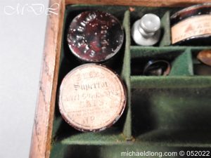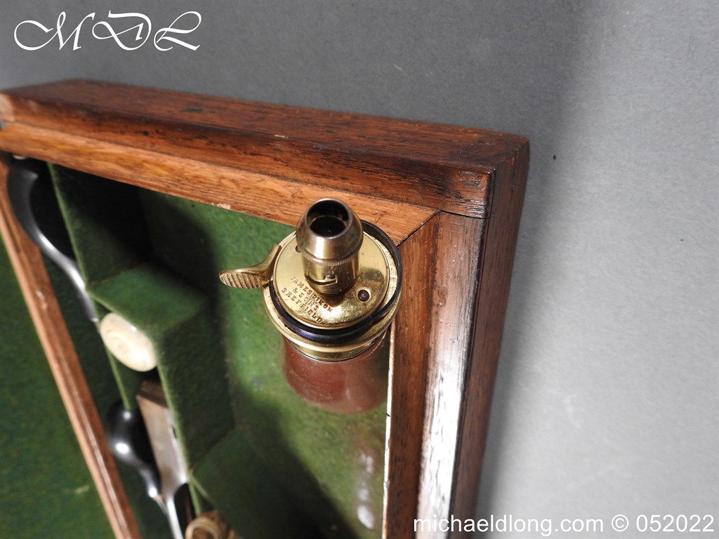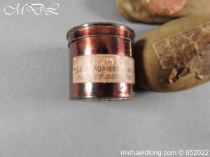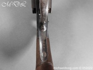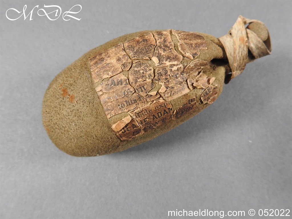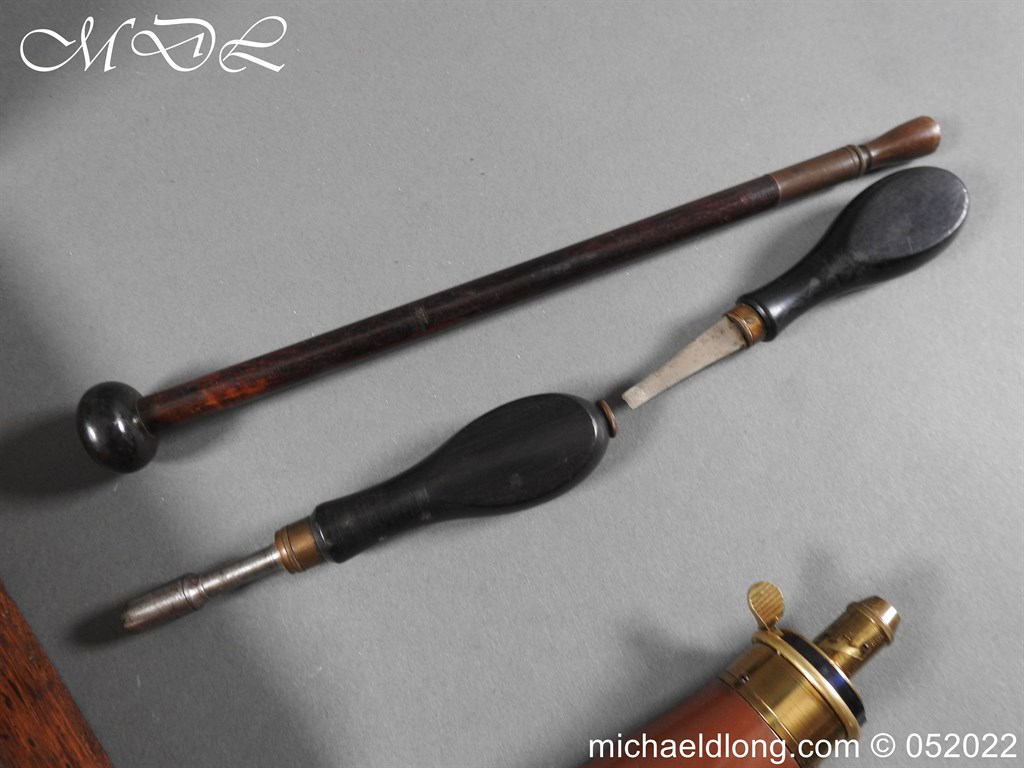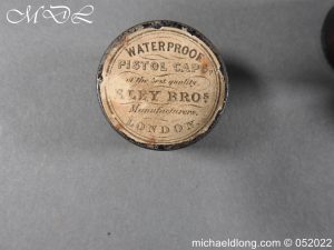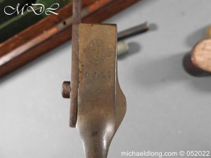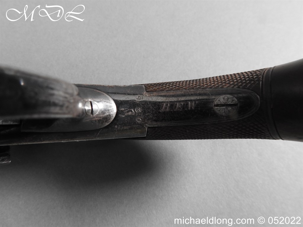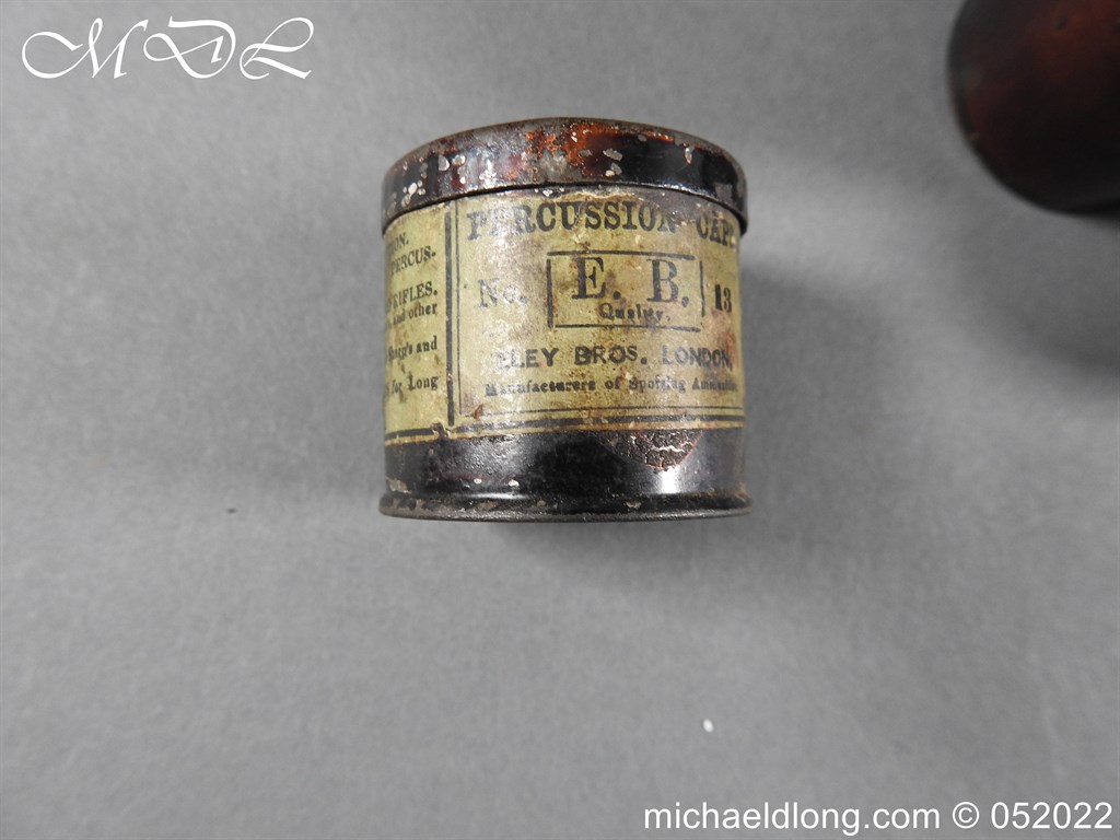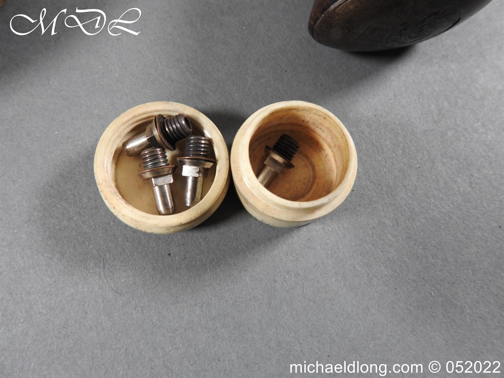 Dean Adams 1851 Dragoon Percussion Revolver Retailed by Wm & Jon Rigby Dublin 38 bore self cocking with blued octagonal sighted barrel engraved with retails name and address in full along the blued top-strap, case-hardened cylinder, blued border engraved frame decorated with foliate scrollwork on each side, blued safety-stop, arbor pin and catch, blued foliate scroll engraved trigger-guard and ovoidal butt-cap, the latter with hinged butt-trap cover engraved with a scallop shell, and chequered figured rounded butt, good colour finish with some age wear: in original lined and fitted oak case with all accessories including brass bullet mould stamped Adams and Dixon & Sons powder-flask in super condition. Also included are the Directions for loading and cleaning Adams Revolver Pistols and Eley Waterproof Caps advert. The interior of the lid with yellow maker’s label damaged, the exterior with circular brass escutcheon all in very good condition please note what I assume are the owners initial to the rear of the trigger guard.