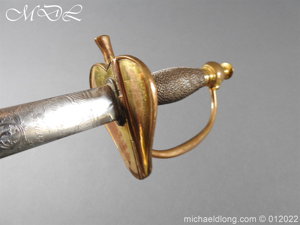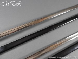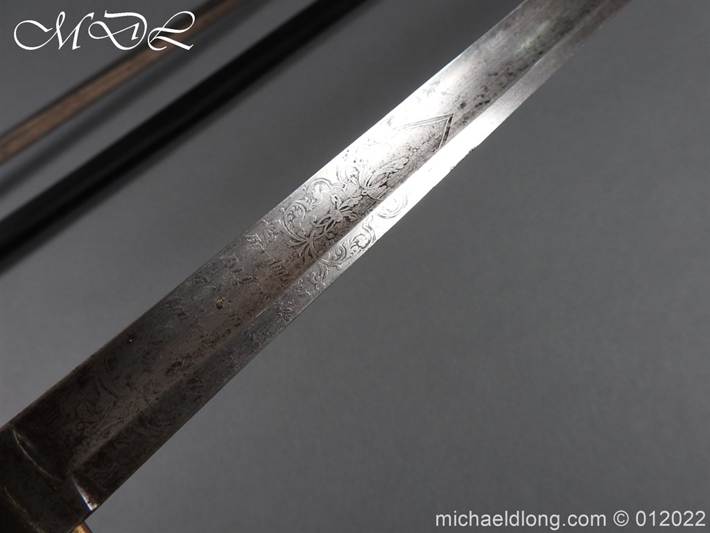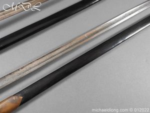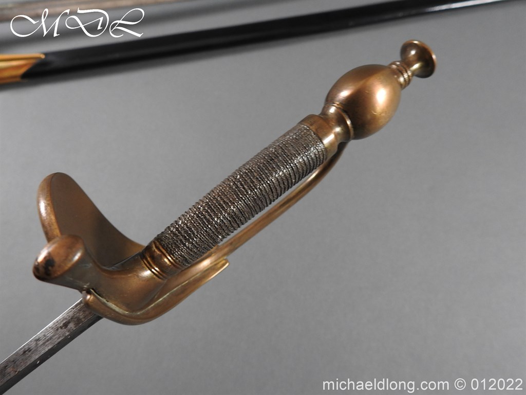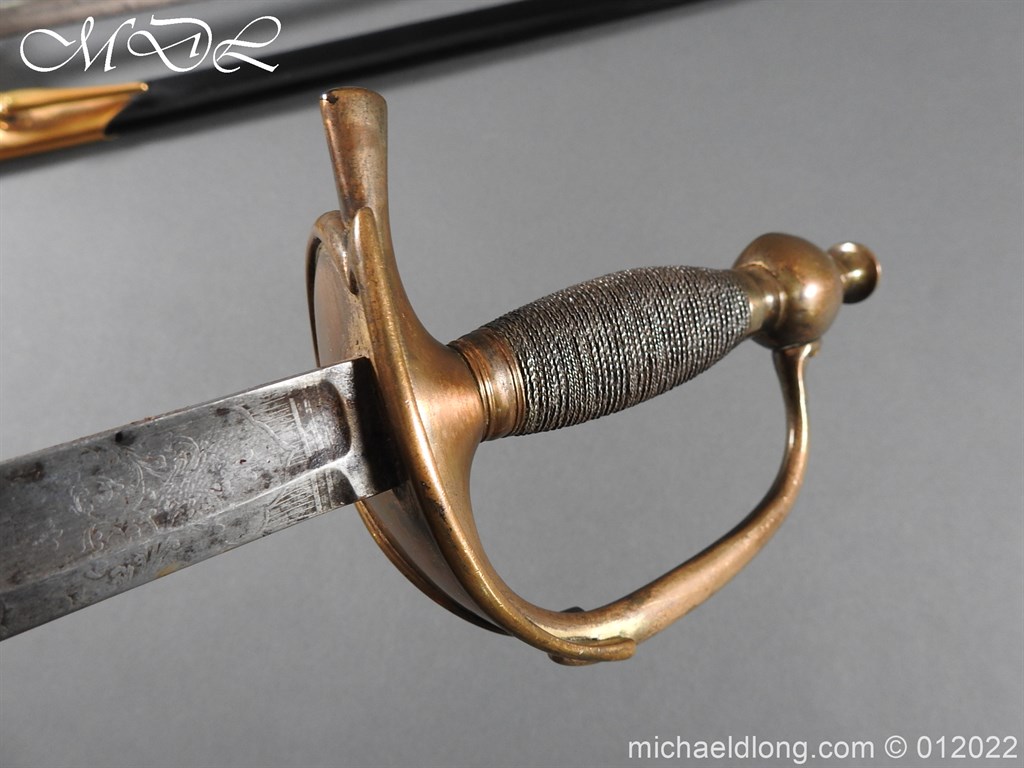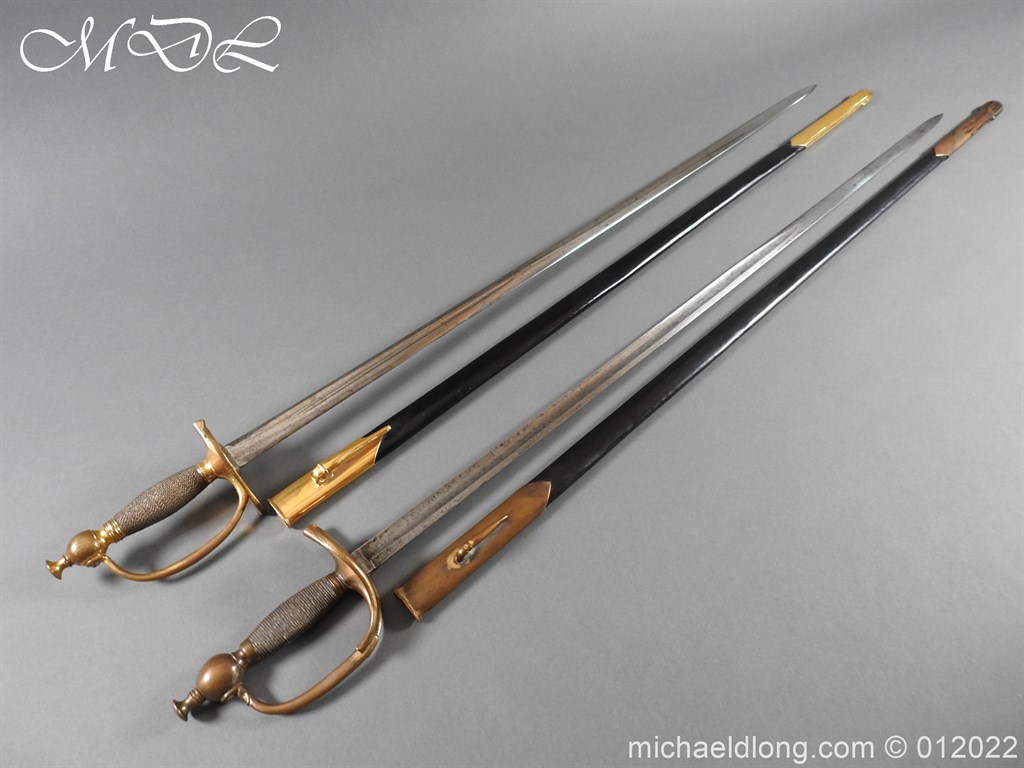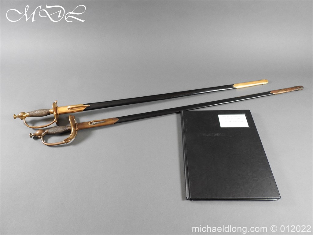 The solid guard sword also has the manufacturers name etched on the blade, at the top, just under the hilt Hamburger Rogers & Co. 30 King St. Covent Garden, London. The blade of the hinged guard sword is plain except for the manufacturers name, Andrews 9 Pall Mall, etched just under the hilt, at the top of the blade on one side. The hilt of the solid guard sword is complete and not cut down in any way, as is sometimes found with this type of sword/1796 patterns on the inside of the guard. The inside of the guard is designed to lay flat against the side and has a rounded edge, matching the outer side, clearly indicating this has not been modified in any way. Sold with research note one scabbard has been refurbished