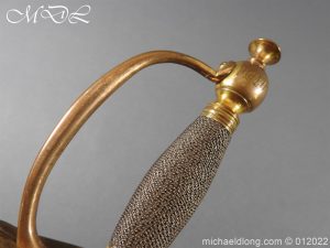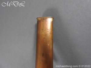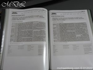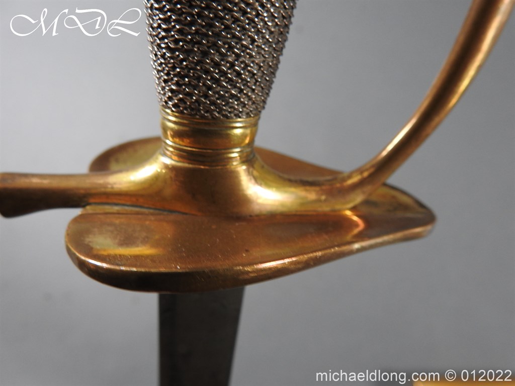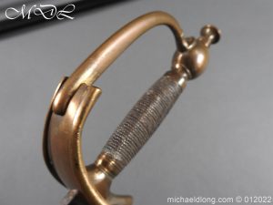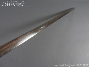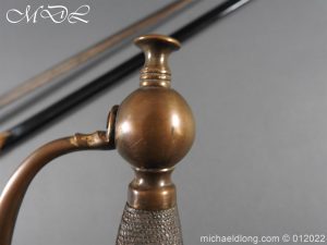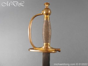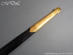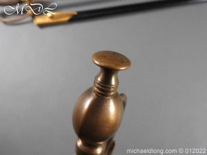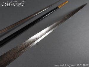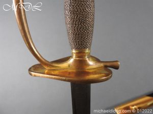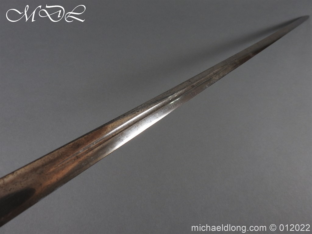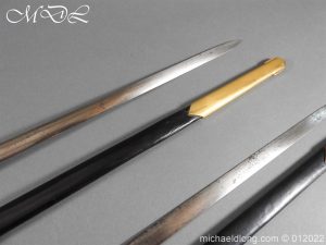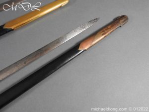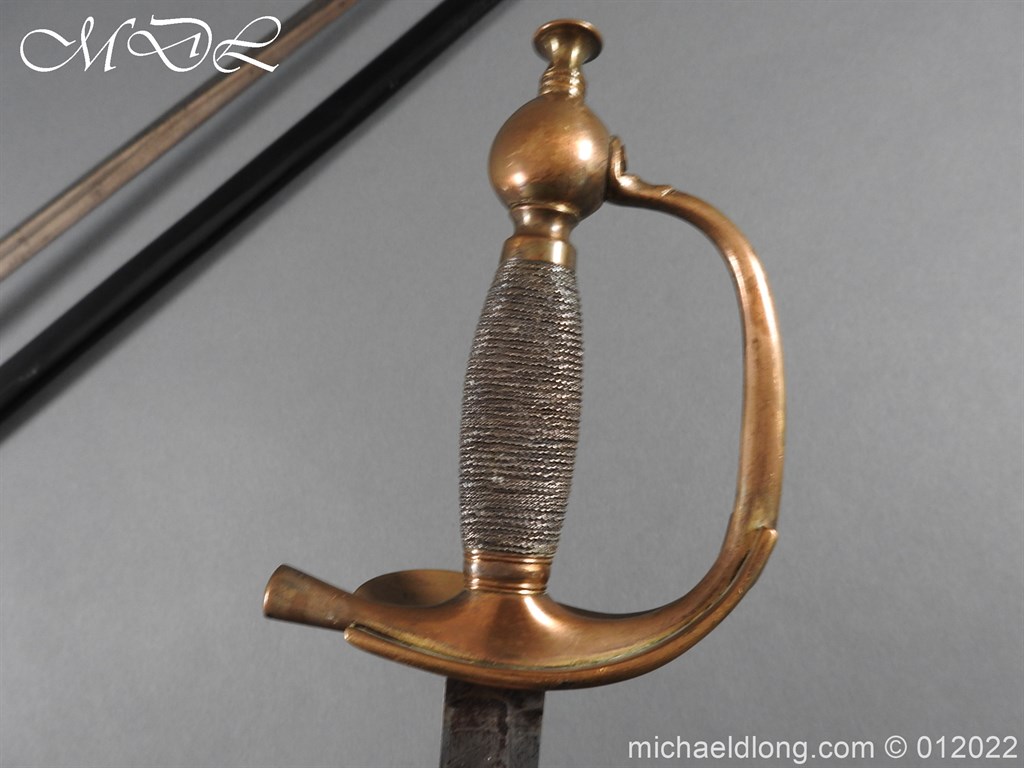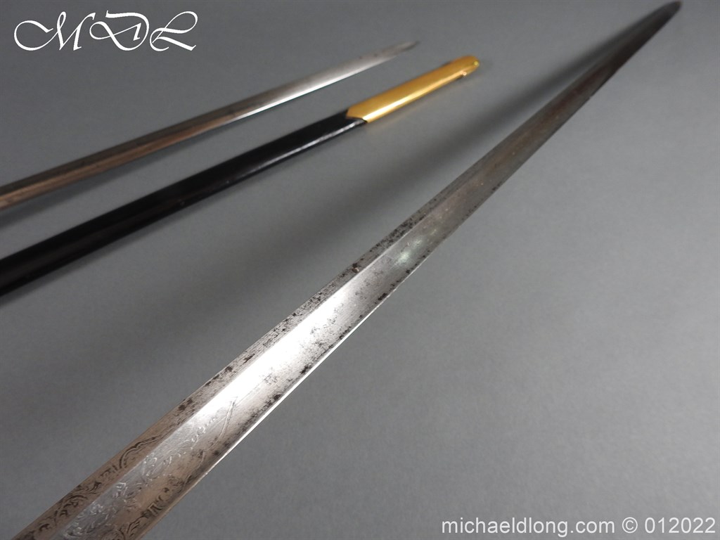 The solid guard sword also has the manufacturers name etched on the blade, at the top, just under the hilt Hamburger Rogers & Co. 30 King St. Covent Garden, London. The blade of the hinged guard sword is plain except for the manufacturers name, Andrews 9 Pall Mall, etched just under the hilt, at the top of the blade on one side. The hilt of the solid guard sword is complete and not cut down in any way, as is sometimes found with this type of sword/1796 patterns on the inside of the guard. The inside of the guard is designed to lay flat against the side and has a rounded edge, matching the outer side, clearly indicating this has not been modified in any way. Sold with research note one scabbard has been refurbished