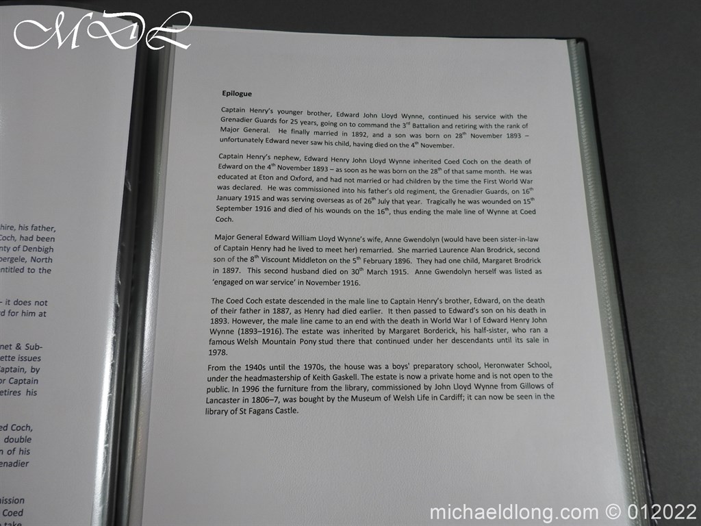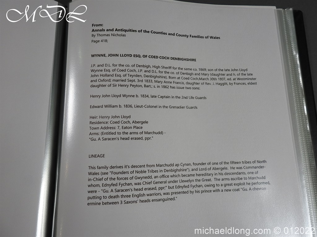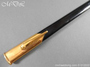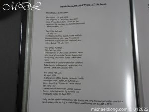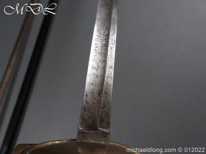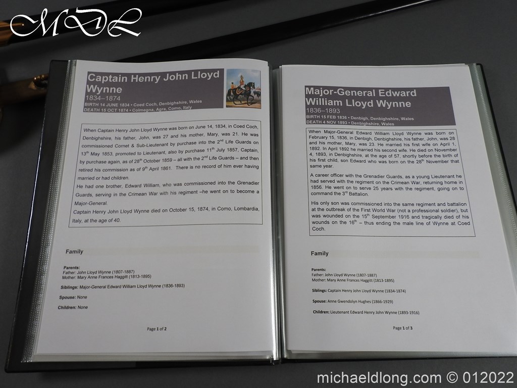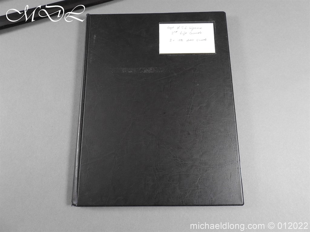 The two Life Guards 1796 pattern dress swords, one solid guard, one hinged. The solid guard manufactured by Hamburger, Rogers & Co. the hinged guard manufactured by Andrews, Pall Mall. The type of dress sword worn in frock coat dress by the regiments of the Household Cavalry until 1856, the hinged guard version uniquely by officers of the 2nd Life Guards. Both swords attributed to the one officer of the 2nd Life Guards, Henry John Lloyd Wynne – initially commissioned into that regiment in 1853. His initials etched on both swords in exactly the same style/font. In the case of the hinged guard sword the initials are on the sword only, engraved into the brass pommel. On the fixed guard the initials are etched on both the sword blade and engraved into the top brass mount of the scabbard. Both swords are housed in their black leather scabbard with top and bottom gilt brass mounts.