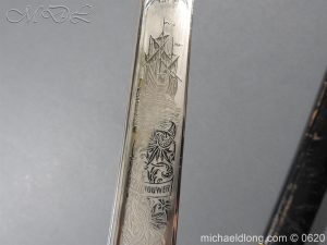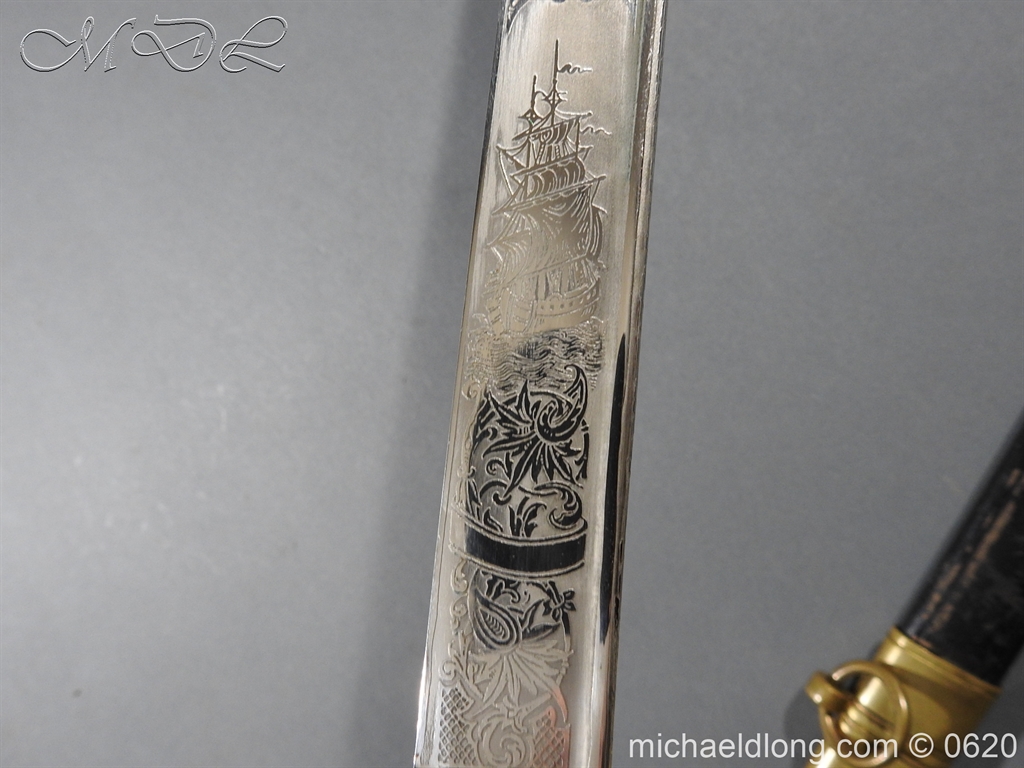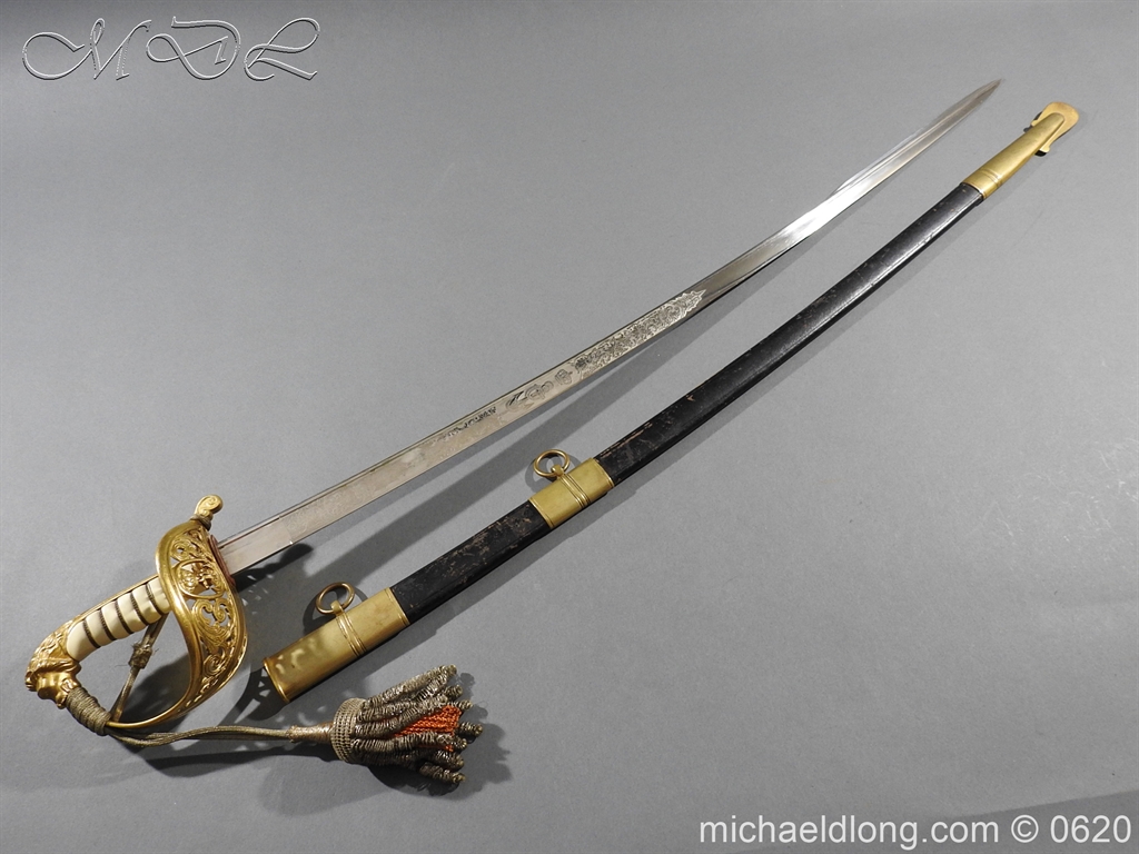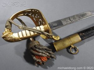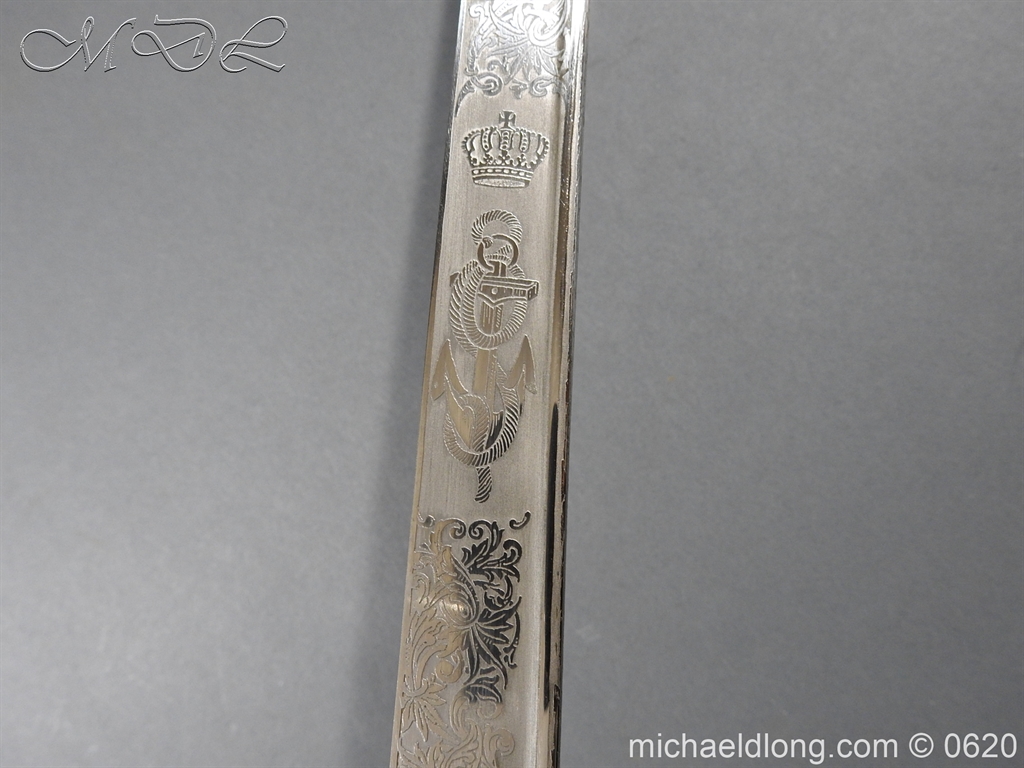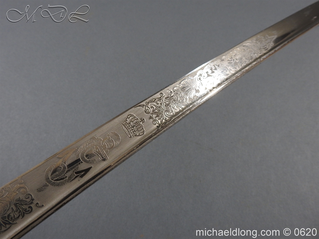 Dutch M 1882 naval officers sword with bright finished heavy pipe back blade, etched in panels on both sides and on the blade spine. The panels have different motives. Both panels are showing a Man O’war and a fouled anchor under a crown. Blade is marked Yzerhouwer on one side and the German makers logo of Horster complete with scabbard and correct Officer’s knot Overall length 100cm 39.5 inches blade 86cm 34 inches