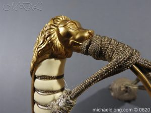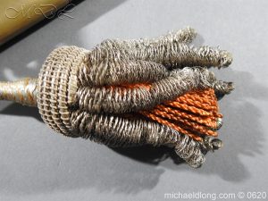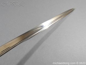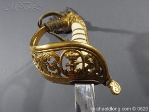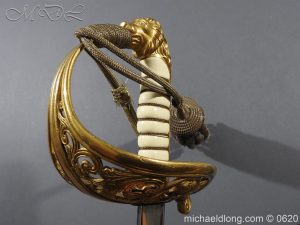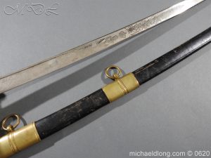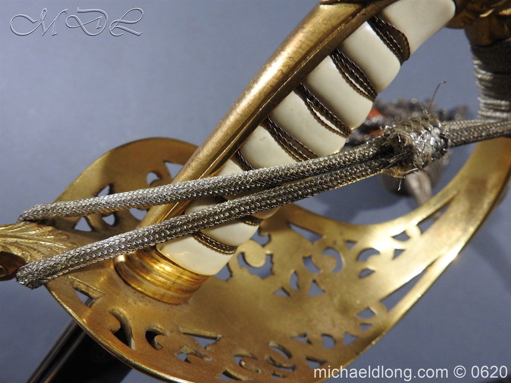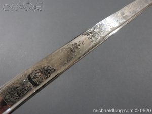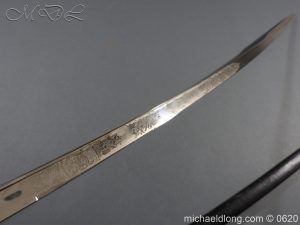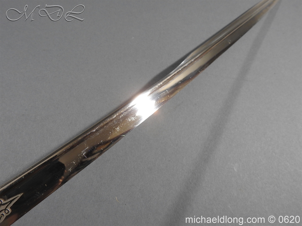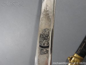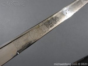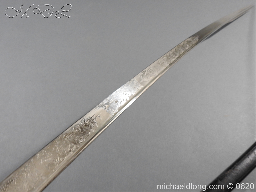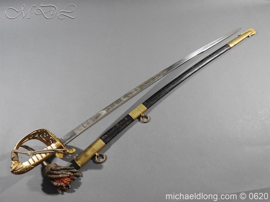 Dutch M 1882 naval officers sword with bright finished heavy pipe back blade, etched in panels on both sides and on the blade spine. The panels have different motives. Both panels are showing a Man O’war and a fouled anchor under a crown. Blade is marked Yzerhouwer on one side and the German makers logo of Horster complete with scabbard and correct Officer’s knot Overall length 100cm 39.5 inches blade 86cm 34 inches