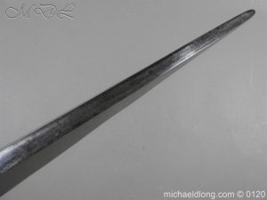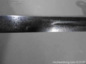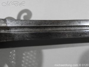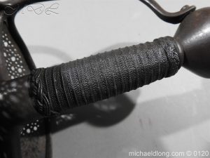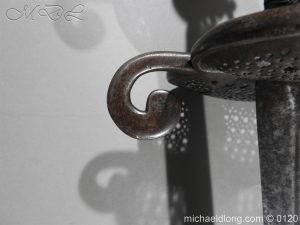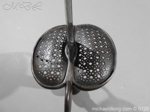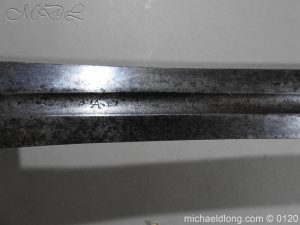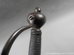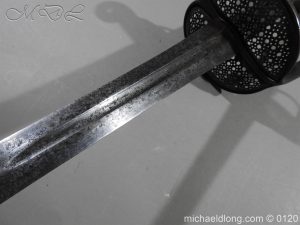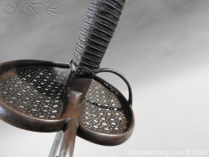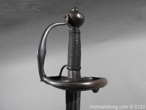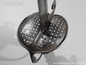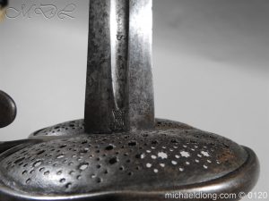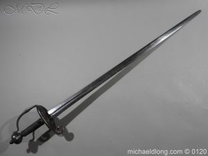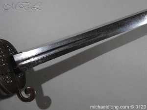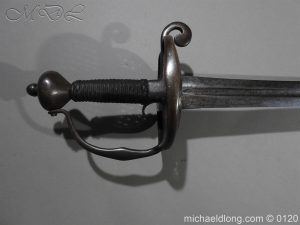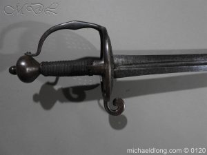 Second half 17th century straight 92 cm double edged blade bearing the running wolf mark on both sides, the fullers marked Sahagom on both sides. Above the hilt the Amsterdam town mark. Iron hilt comprising down curving quillon with large button finial, guard plates pierced with small circular and larger star-shaped holes, thumb ring, shaped pommel. Grip retaining the original wrapping of plaited and twisted iron wire with iron wire turk’s heads