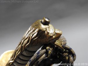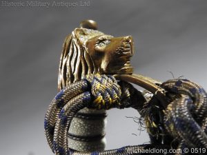 A very rare Edward 8th naval sword lion head pommel with shagreen grip bound with gilt wire Regulation guard with crown and anchor plus officer’s dress knot. The blade marked Gieves with anchor and crown to one side the reverse with crown and ER VIII complete with matching scabbard the side guard named to R W Kego RN