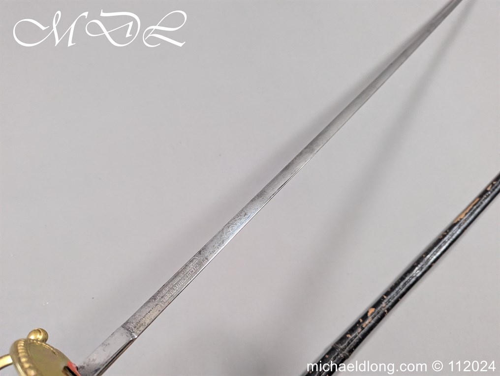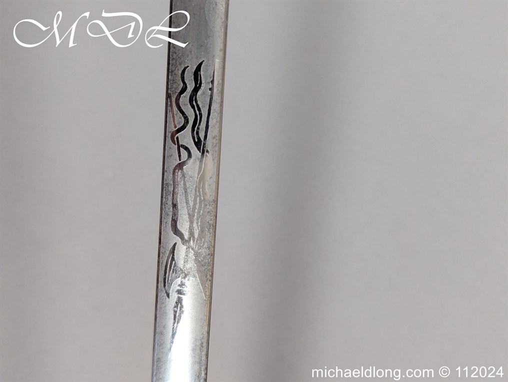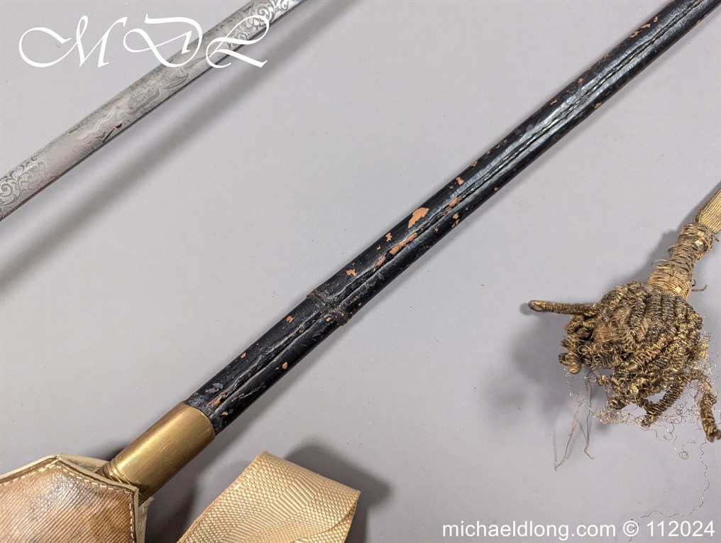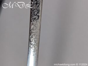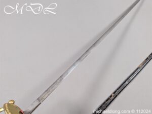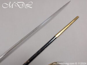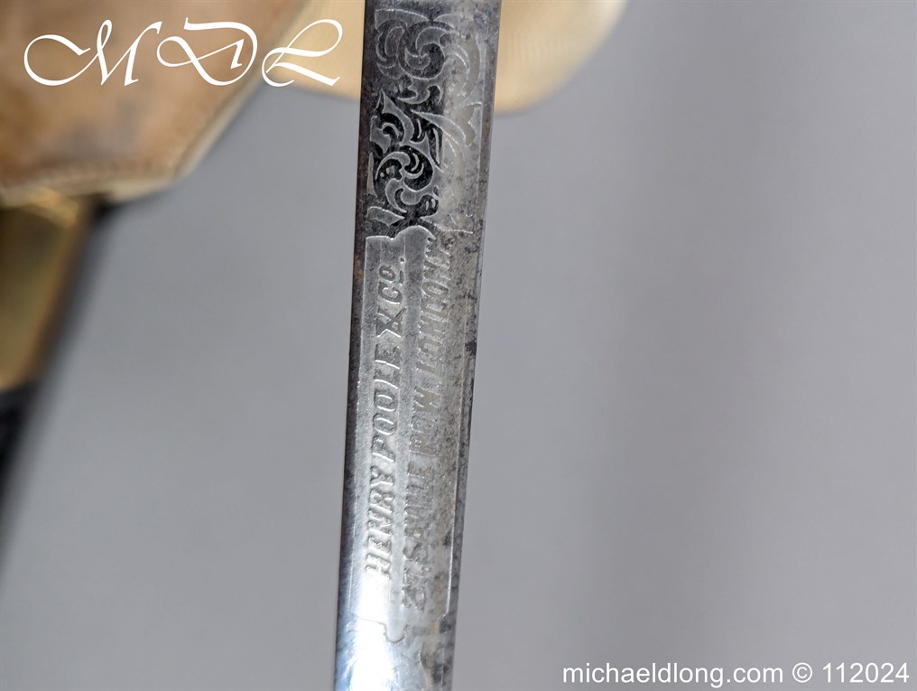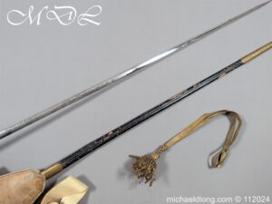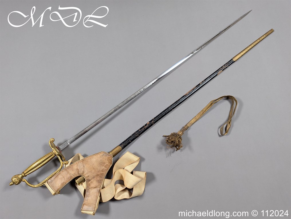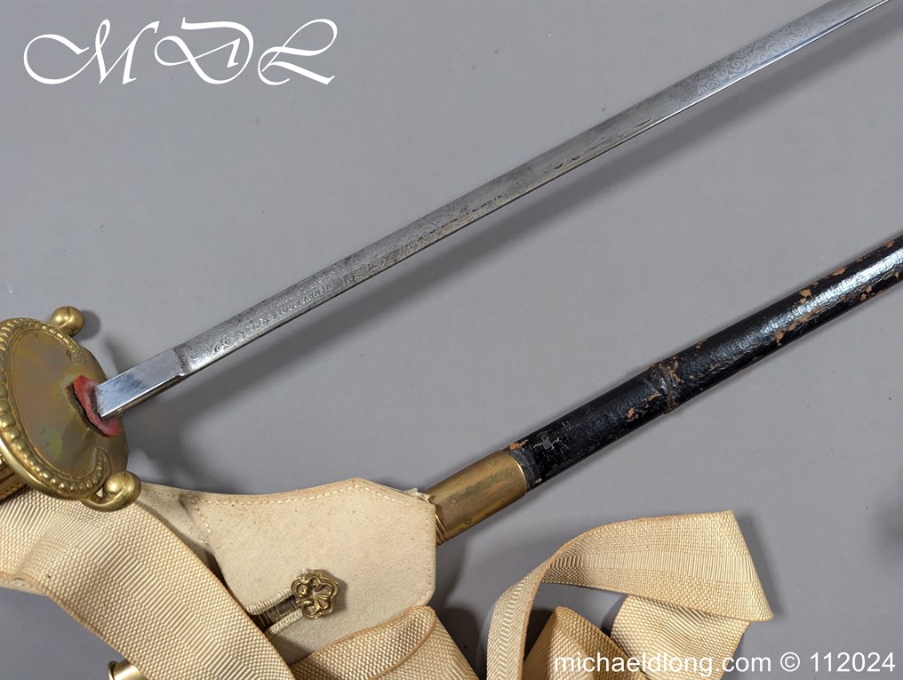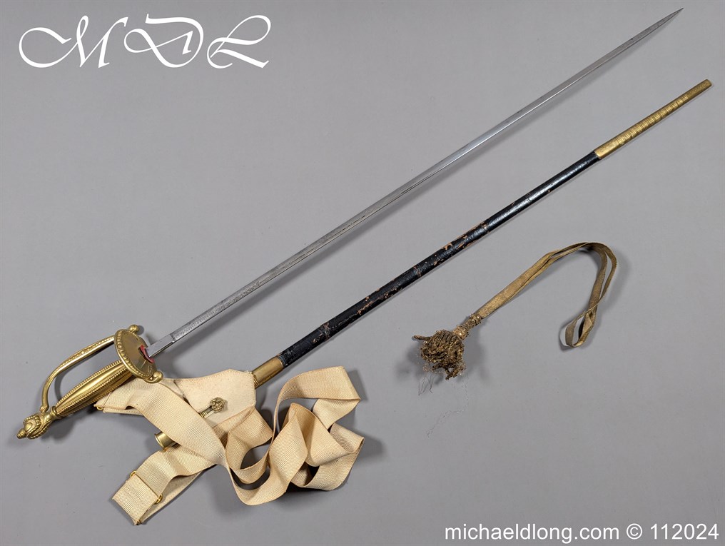 Edwardian British Court Sword retailed by Henry Poole and Co London , gilt brass hilt with shell guard and dress knot. The blade in super condition etched with crossed lancers, floral decoration and retailers name. It is complete with black leather scabbard with matching mounts one crease near top mount please see image plus frog belt