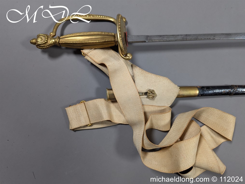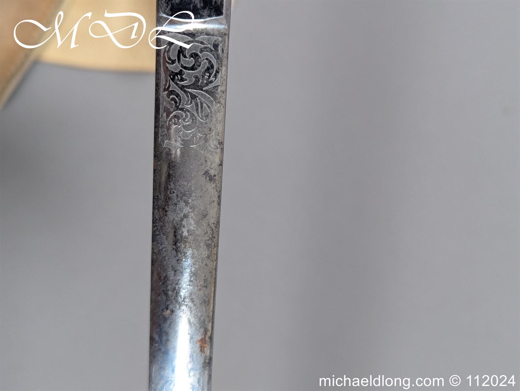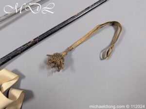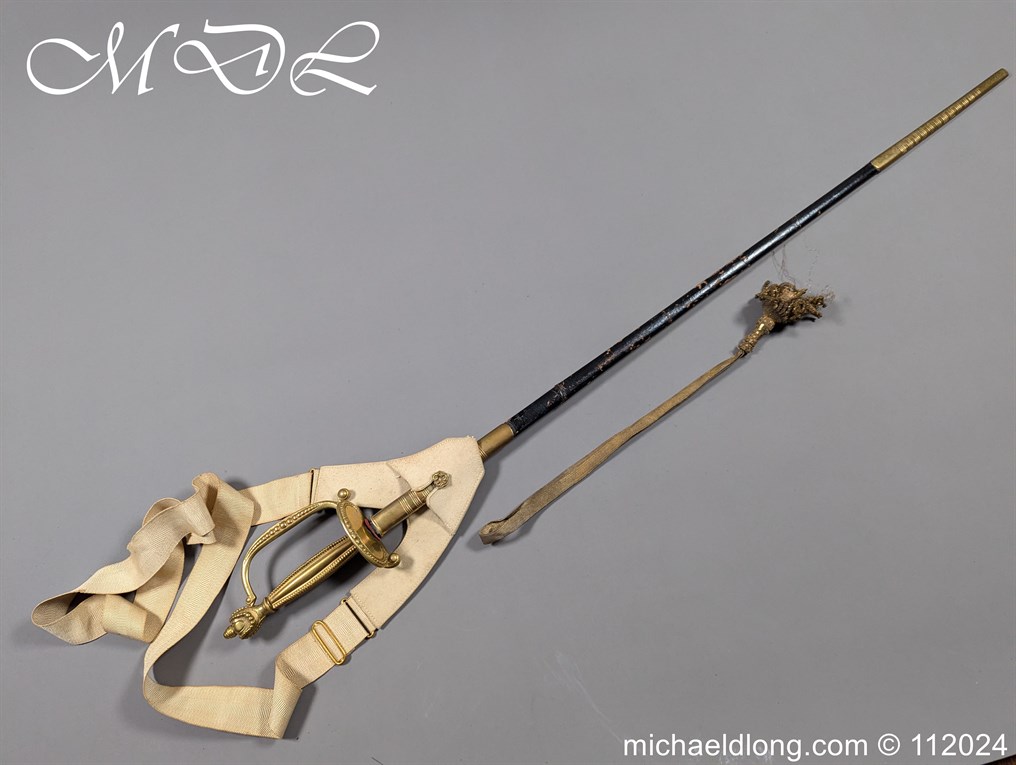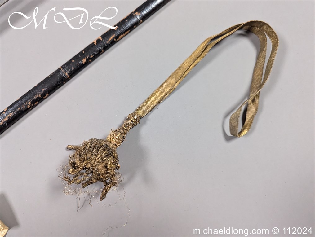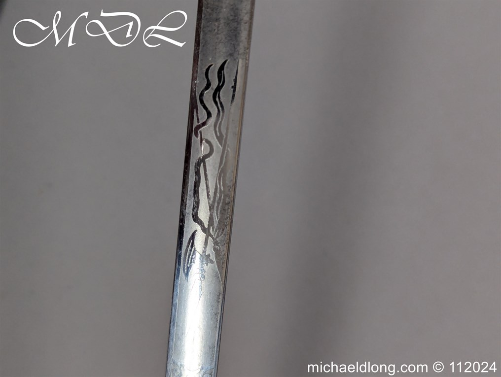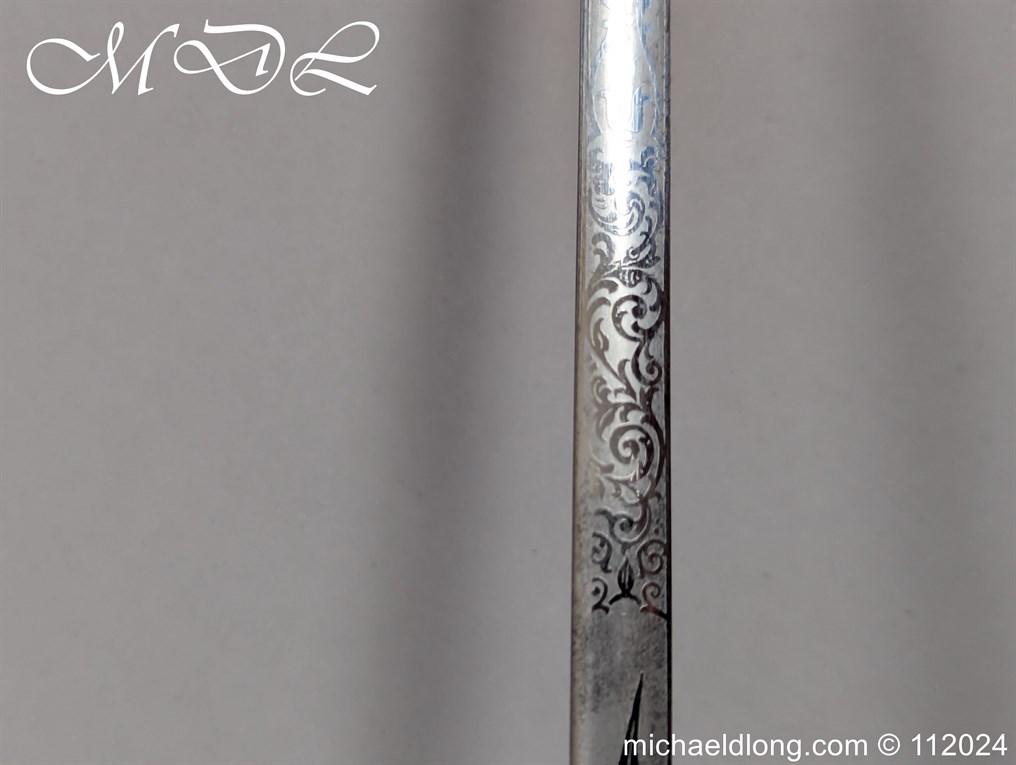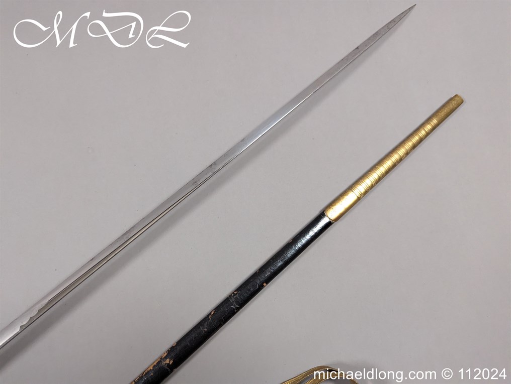 Edwardian British Court Sword retailed by Henry Poole and Co London , gilt brass hilt with shell guard and dress knot. The blade in super condition etched with crossed lancers, floral decoration and retailers name. It is complete with black leather scabbard with matching mounts one crease near top mount please see image plus frog belt
